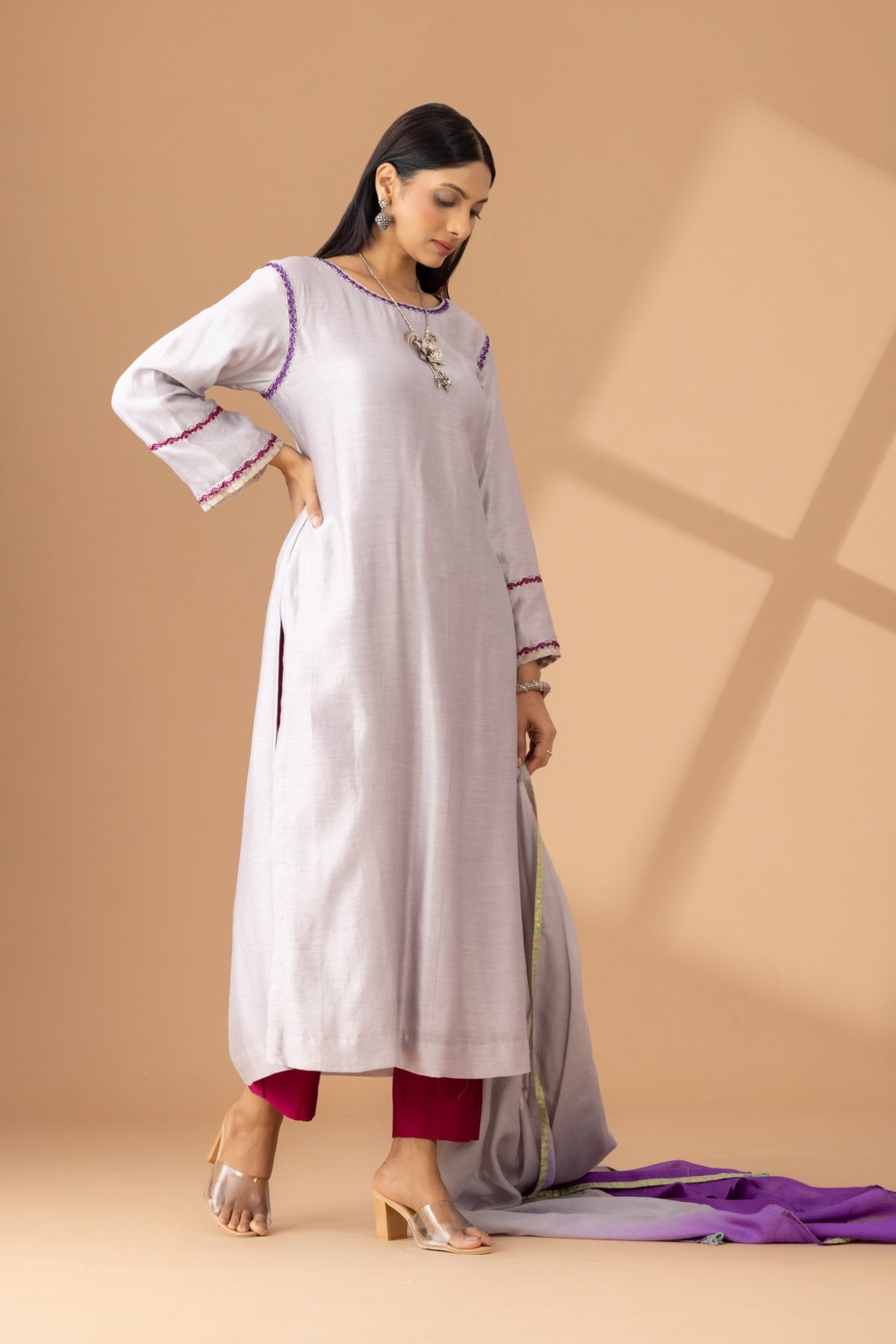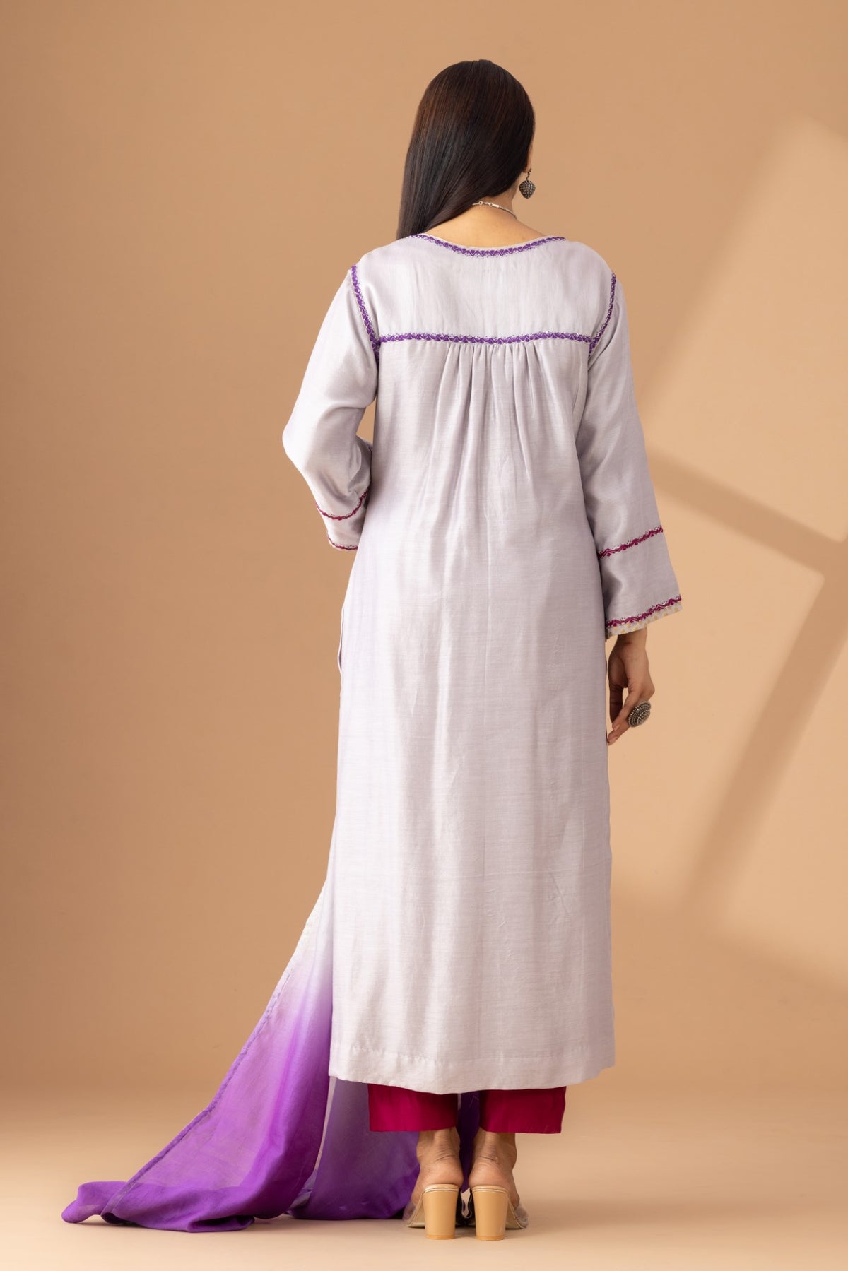Embrace timeless grace with the Aaravi Set, a captivating ensemble crafted in luxurious handloom Chanderi silk. The long straight kurta, in a soothing steel-grey hue, features a round neck, 3/4th sleeves, and soft gathers at the back for a touch of elegance. Intricate cross-stitch embroidery, enhanced with sequins, adorns the neck, back, armholes, and sleeves, showcasing exceptional craftsmanship.