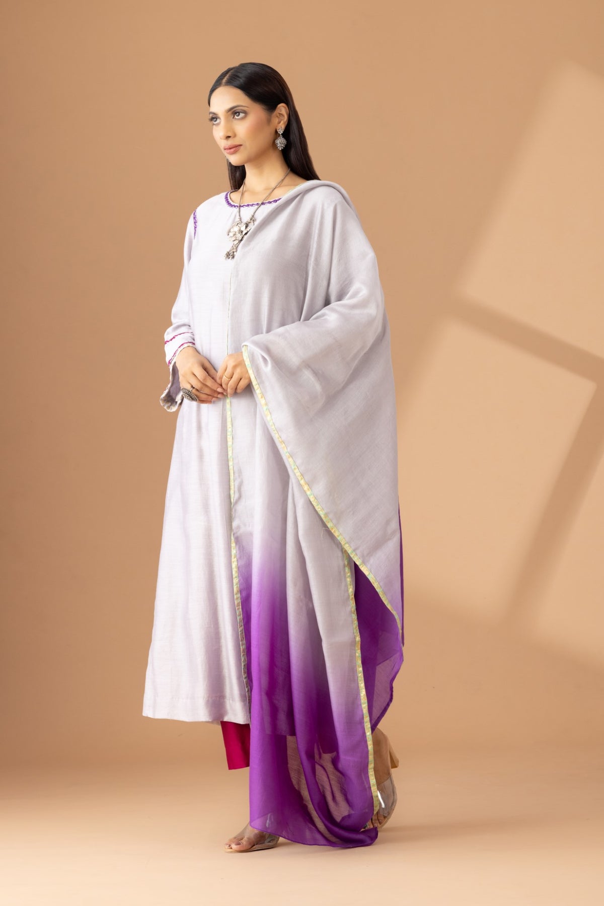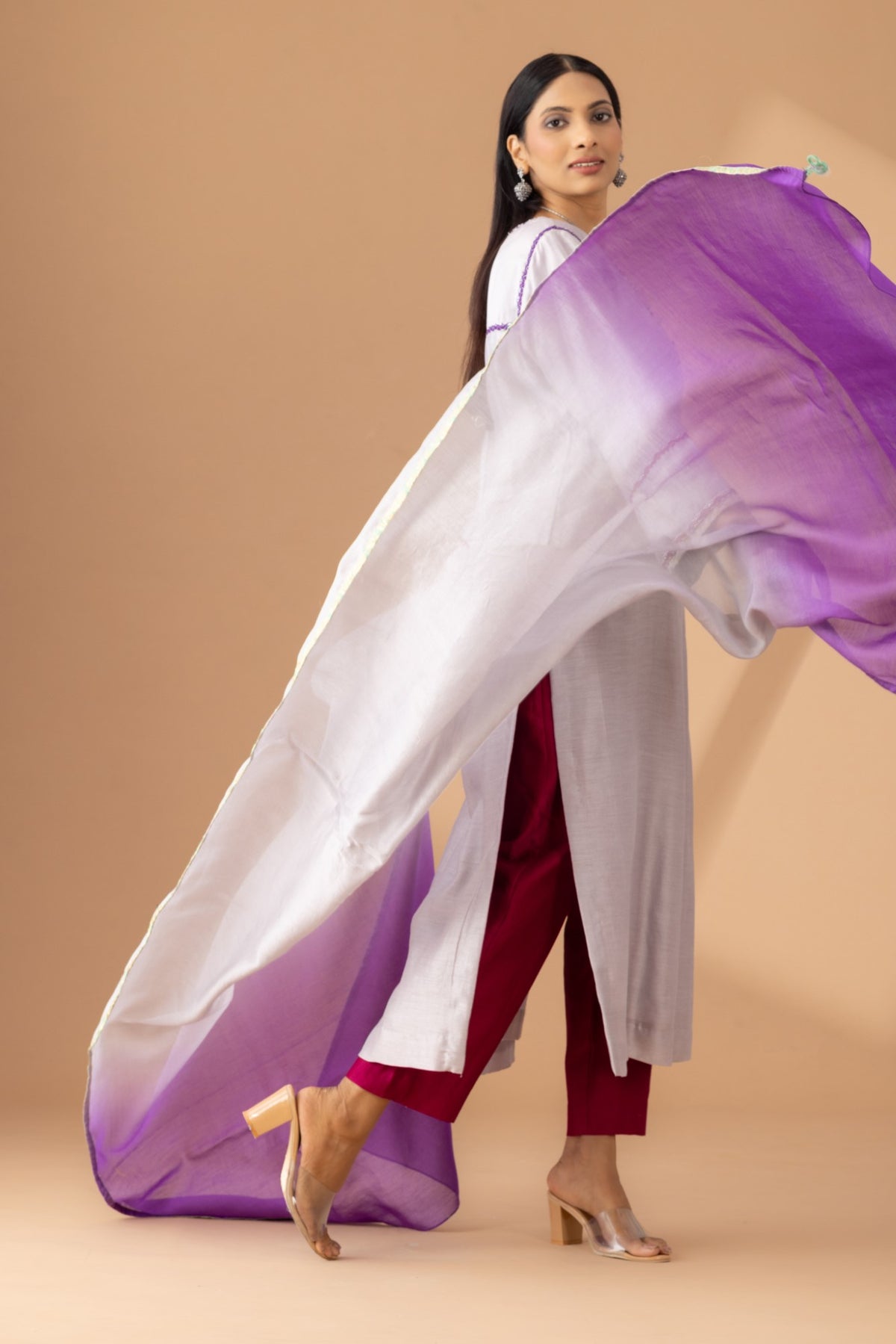 Paired with vibrant contrast-colored Chanderi silk trousers and a stunning ombré-dyed dupatta featuring Chanderi brocade facing and tassels, this set is perfect for formal gatherings or festive celebrations. The Aaravi Set beautifully combines understated charm with vibrant details, making it a must-have addition to your wardrobe.