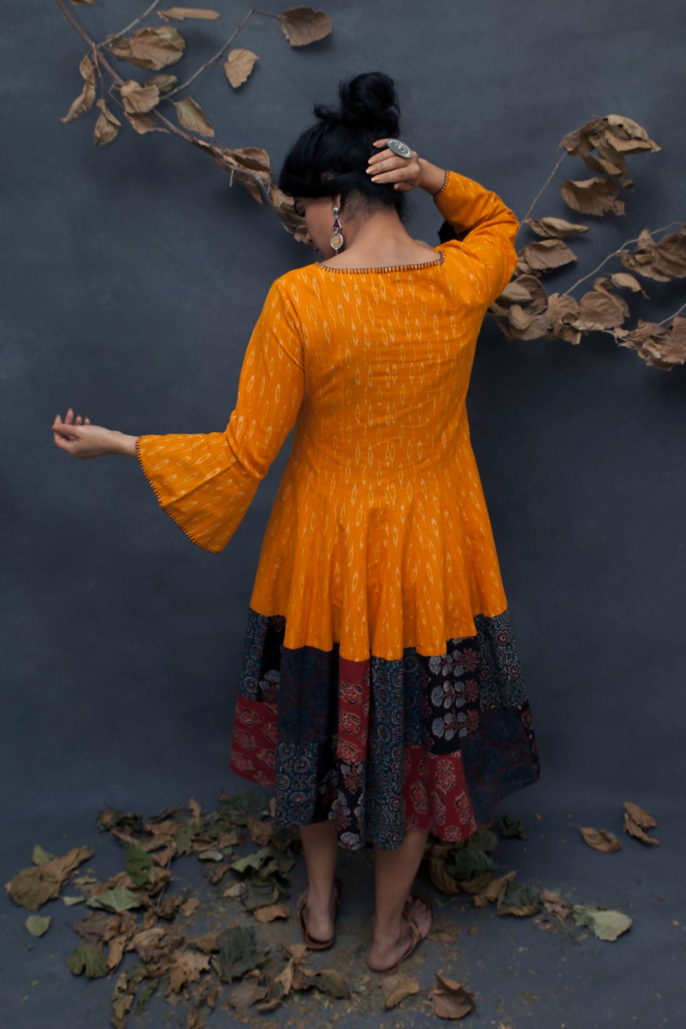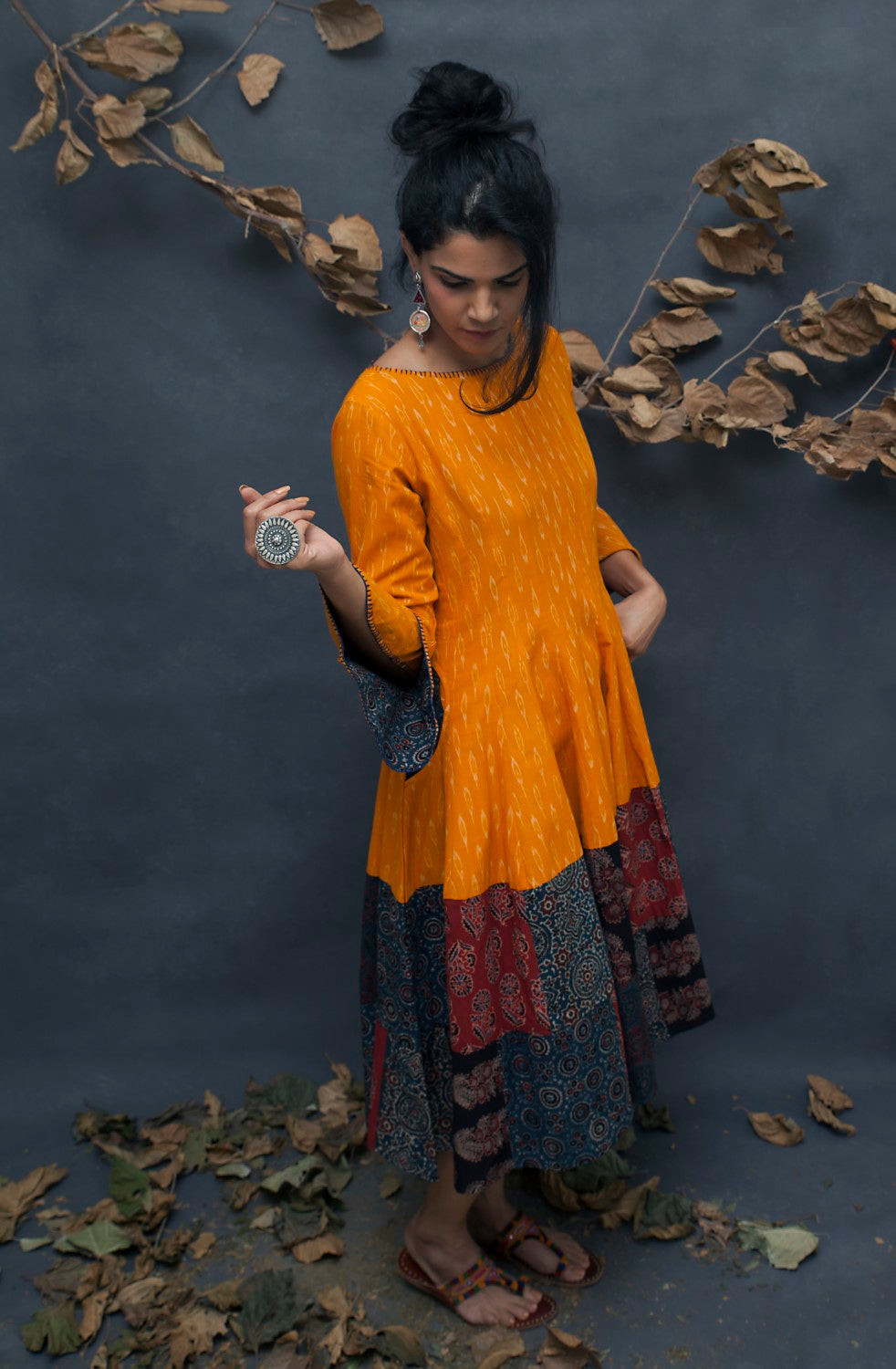 This flared dress featuring a beautiful combination of Ikat and handblock print signifies meticulous workmanship. The overlapped sleeves and detailed patchwork at the hem add fun and charm.