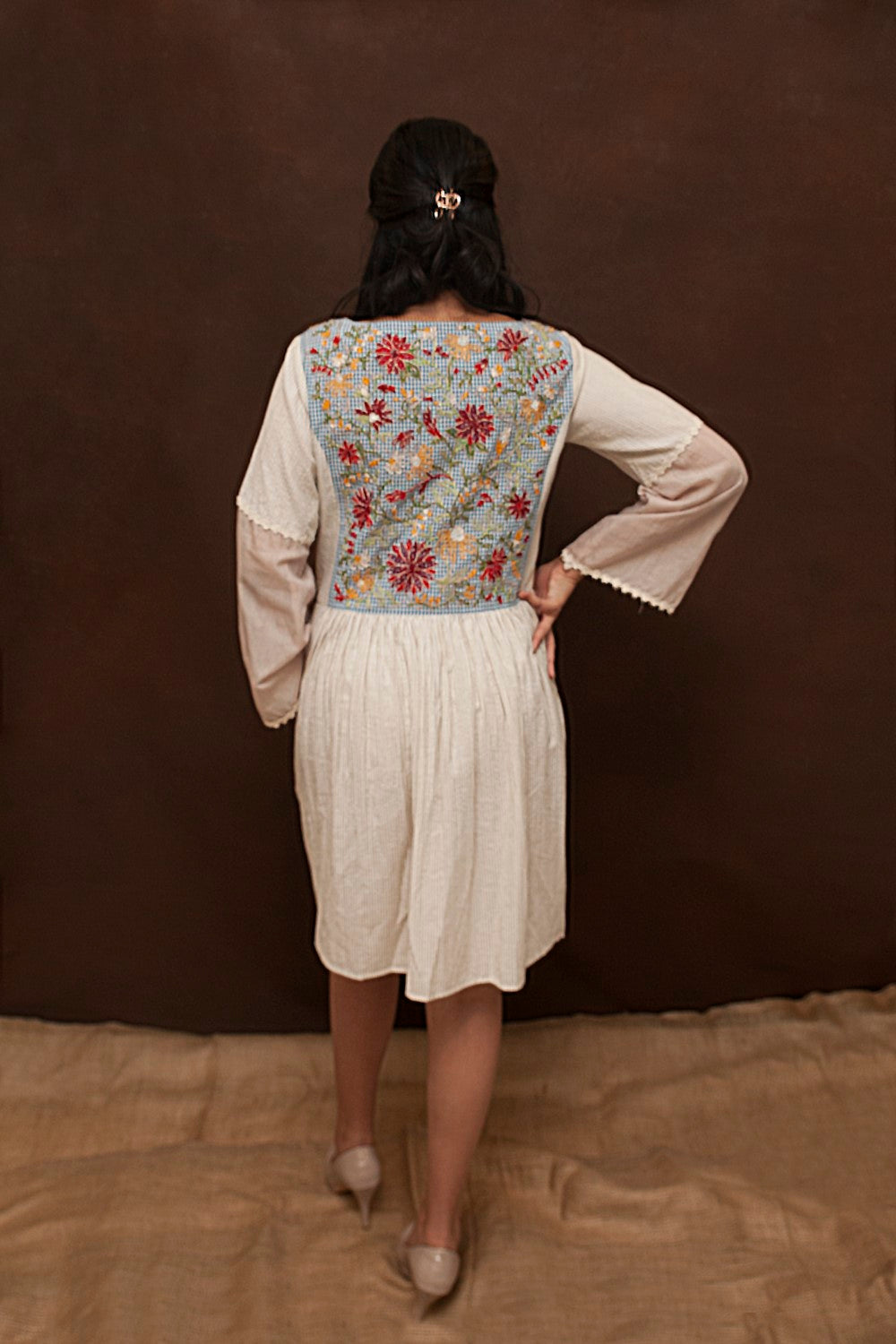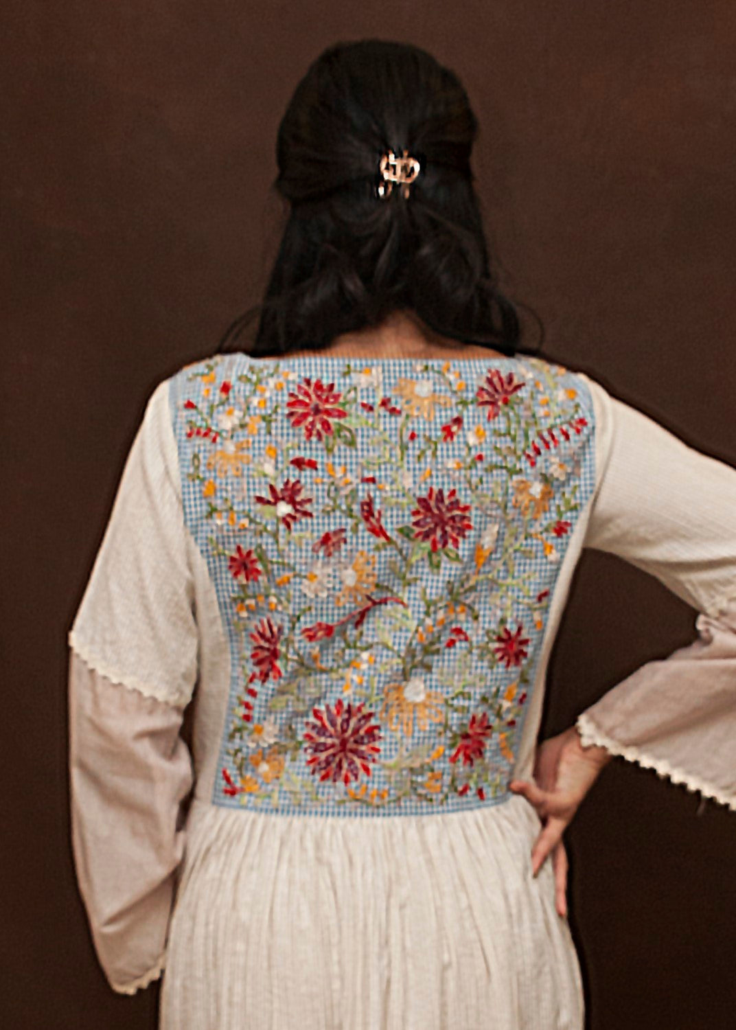 • Round neck, Gingham patterned yoke accentuated with intricate embroidery both at the front and back