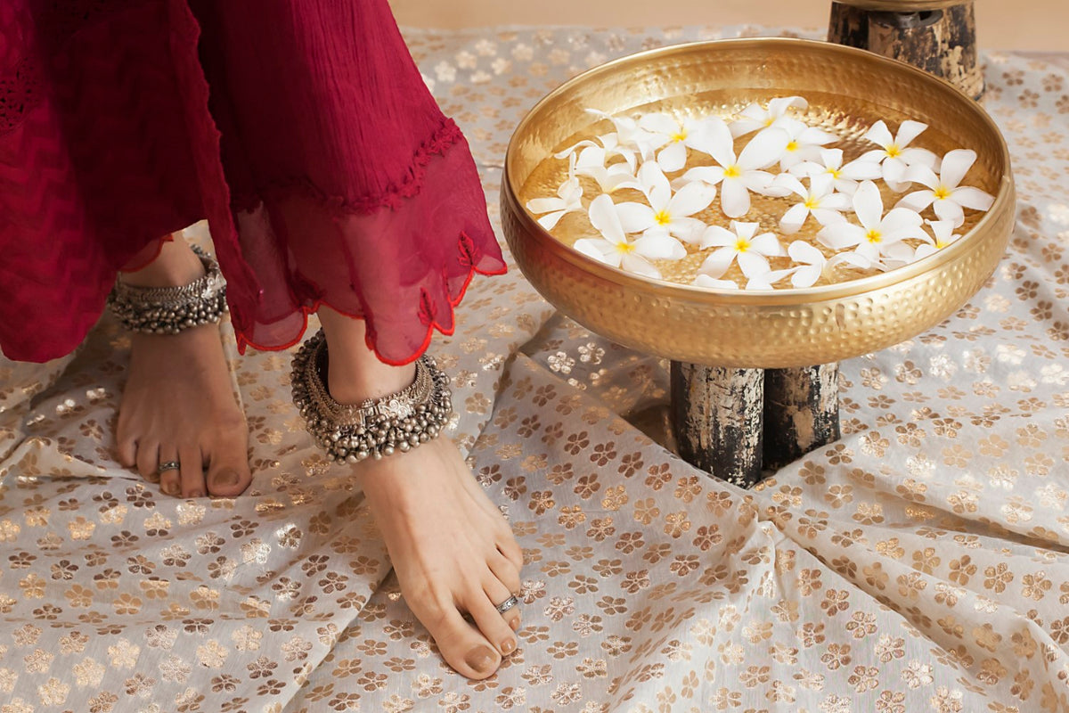 • The Angrakha features traditional silhouette, 24 panels, dori tie with tassels and lace detailing