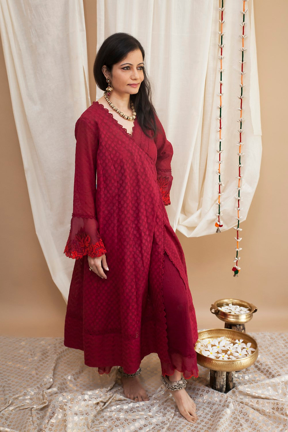 This traditional and flowy Angrakha is perfect for any occasion to give you a classy and elegant look. It can be easily dressed up or down.