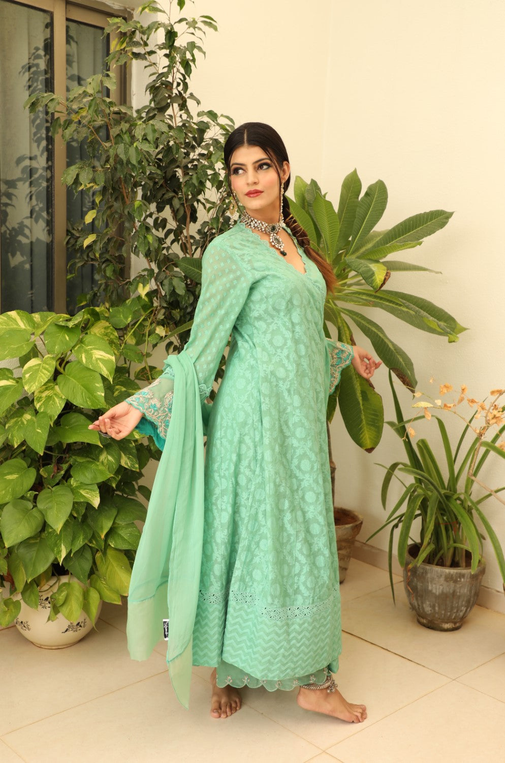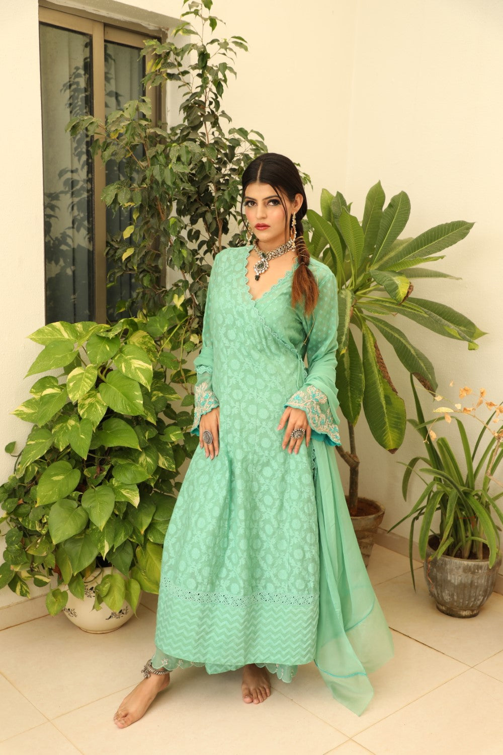 Paired with a soft crinkled palazzo adorned with embroidered organza and lace at the hem, and a light-as-air chiffon dupatta featuring all-around lace finishing. A cotton mulmul slip provides comfort and coverage.