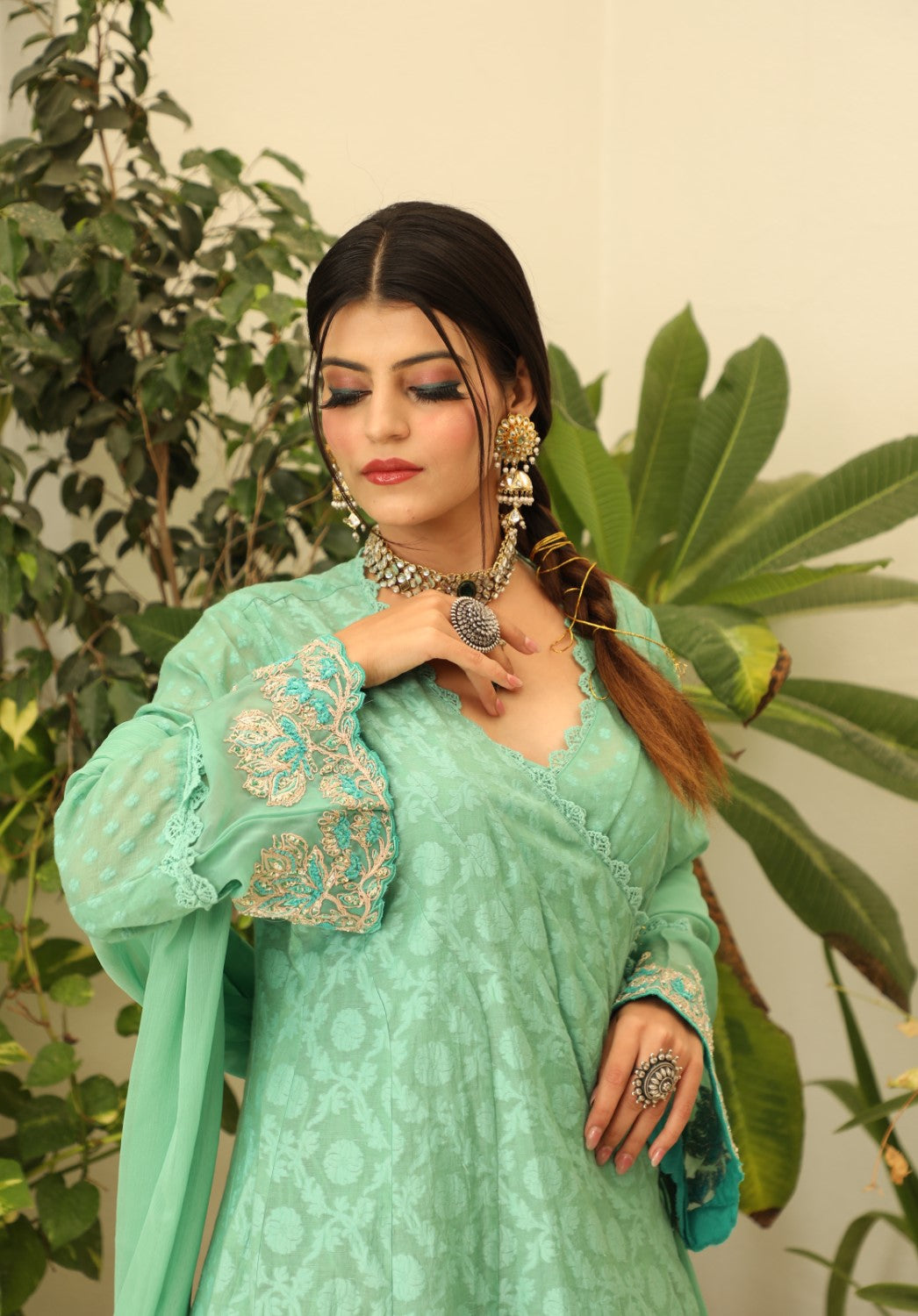 Step into timeless elegance with our Gular Angrakha Set, a graceful ensemble that celebrates heritage craftsmanship. This 24-panelled long Angrakha is crafted in a luxurious blend of textured silk cotton featuring three harmonious prints. The traditional silhouette is elevated with full-length sleeves with delicate embroidered organza, intricately accentuated with pearls and sequins. Finely detailed lace grace the neckline, sleeve joints, side panels, and hem, adding depth and refinement.