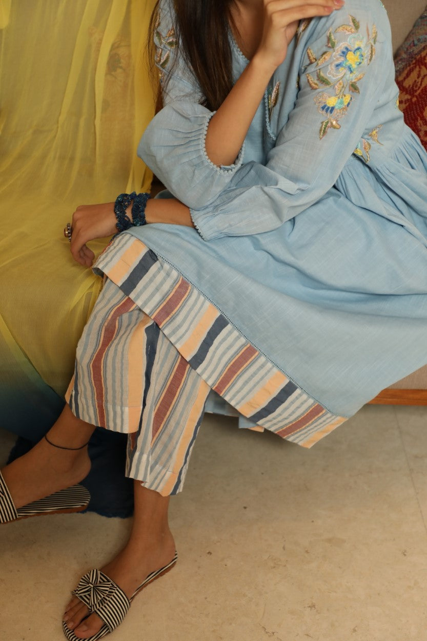 * Paired with cambric cotton and striped cotton palazzo and Ombre' dyed Chiffon dupatta with all around lace