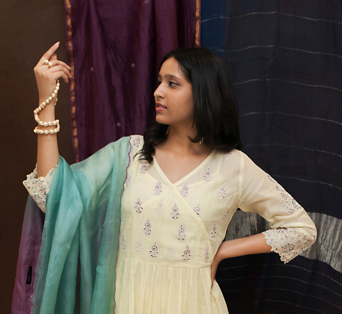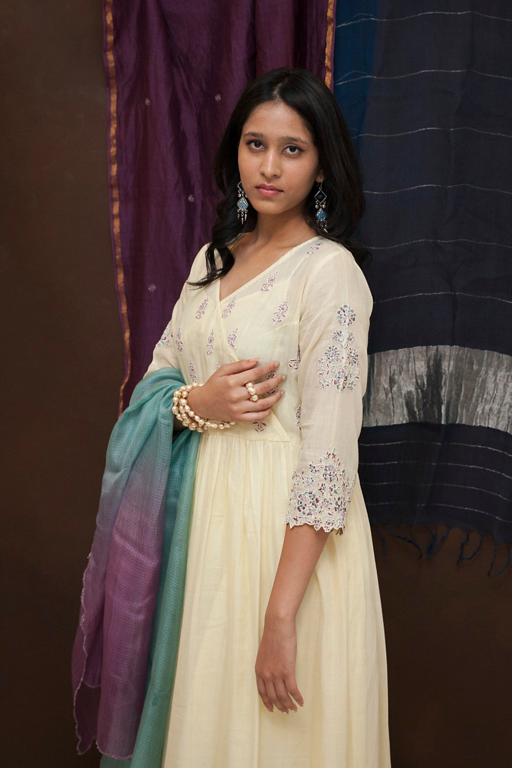 • The long Anarkali in Handloom silk cotton features soft gathered body and overlap yoke.