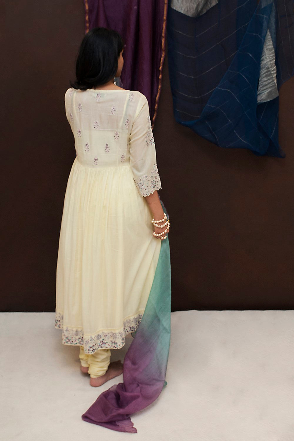 • Paired with cotton churidar and ombre' dyed scalloped dupatta