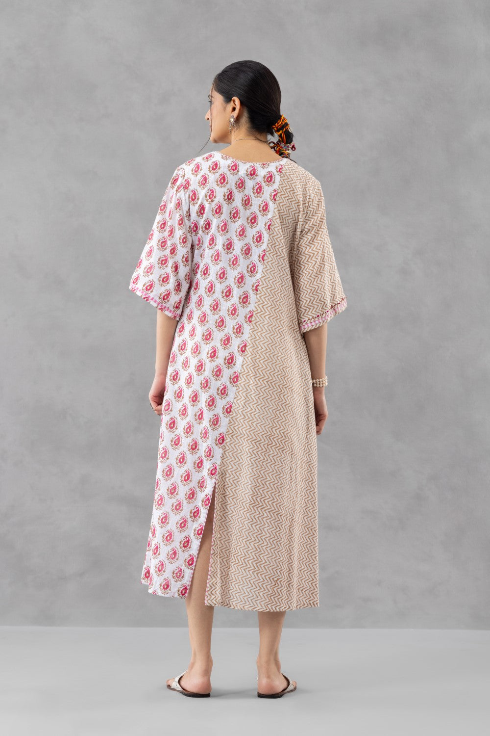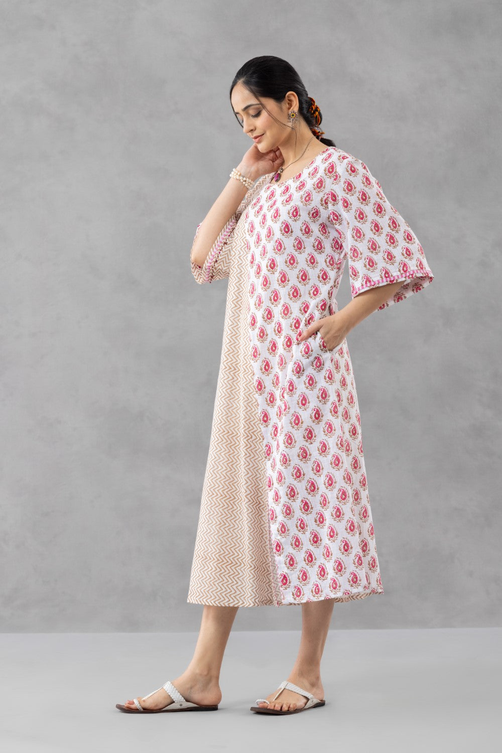 A graceful interplay of pattern and form, this handblock printed dress is crafted in breathable slub cotton for effortless summer elegance. Designed in a fluid A-line silhouette, it features a striking dual-panel composition—juxtaposing a subtle rust herringbone with delicate red boota motifs.