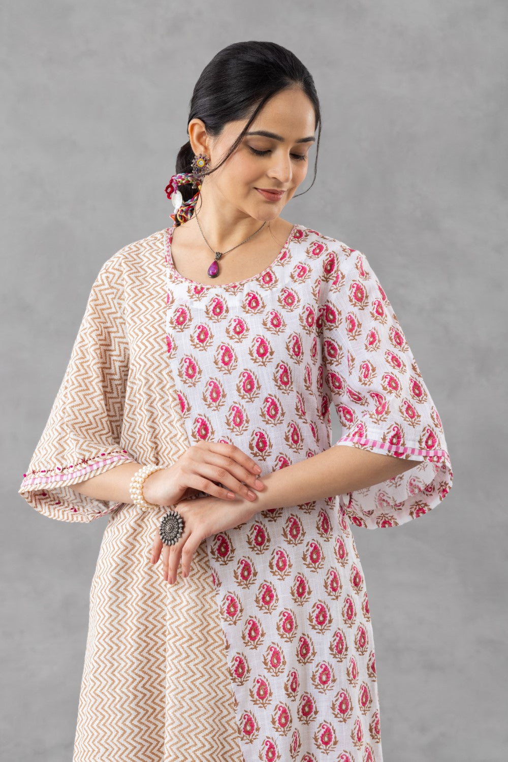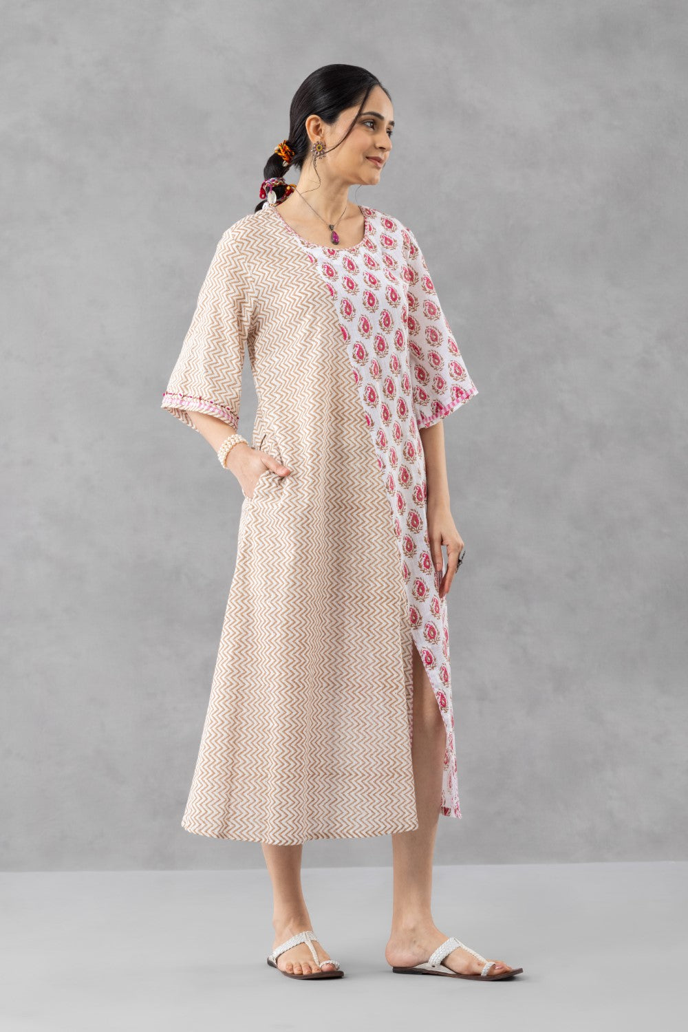 The round neckline and elbow-length sleeves are accented with fine red check piping, adding a hint of artisanal detail. A soft front slit enhances movement, while thoughtfully added side pockets lend everyday ease.