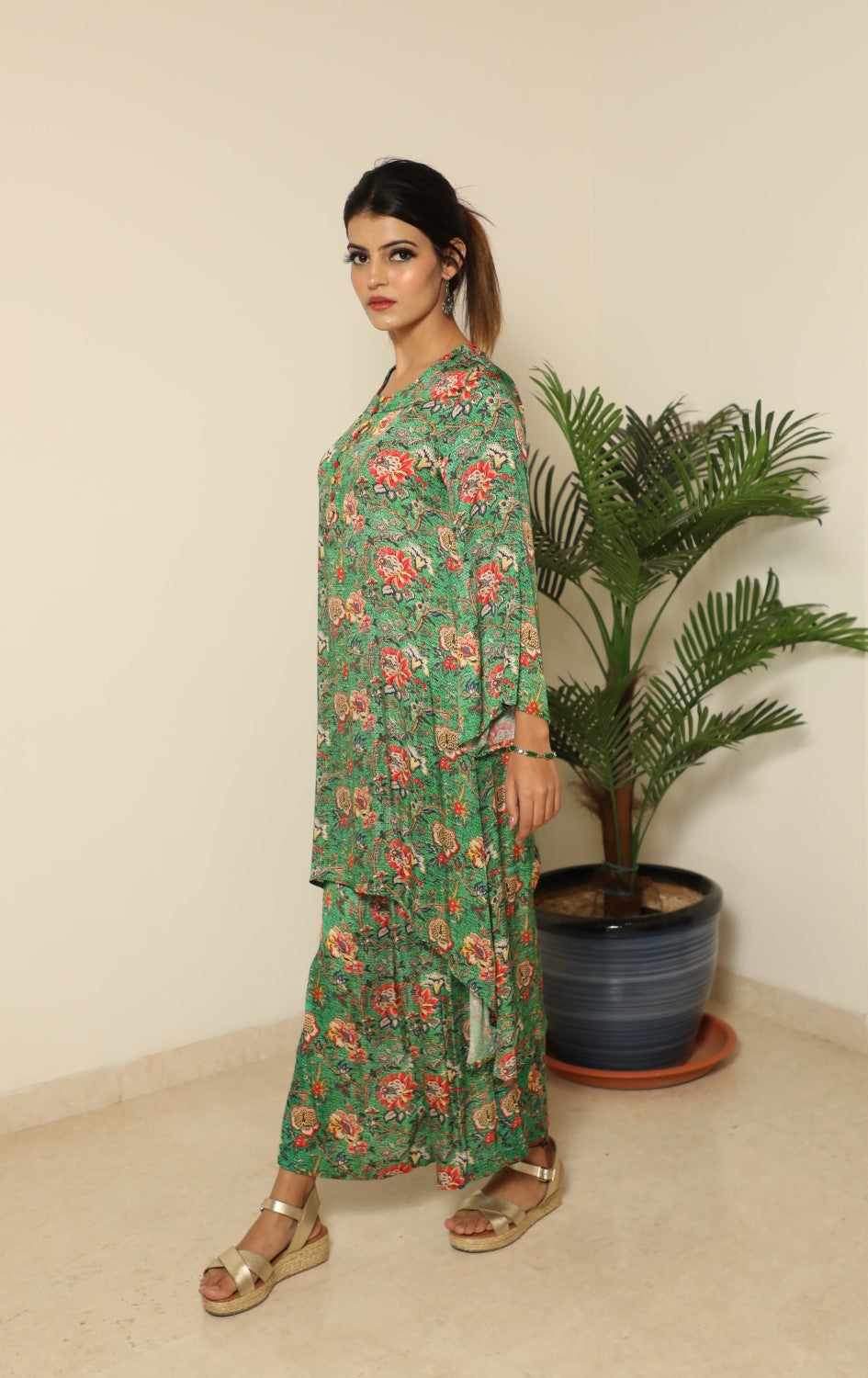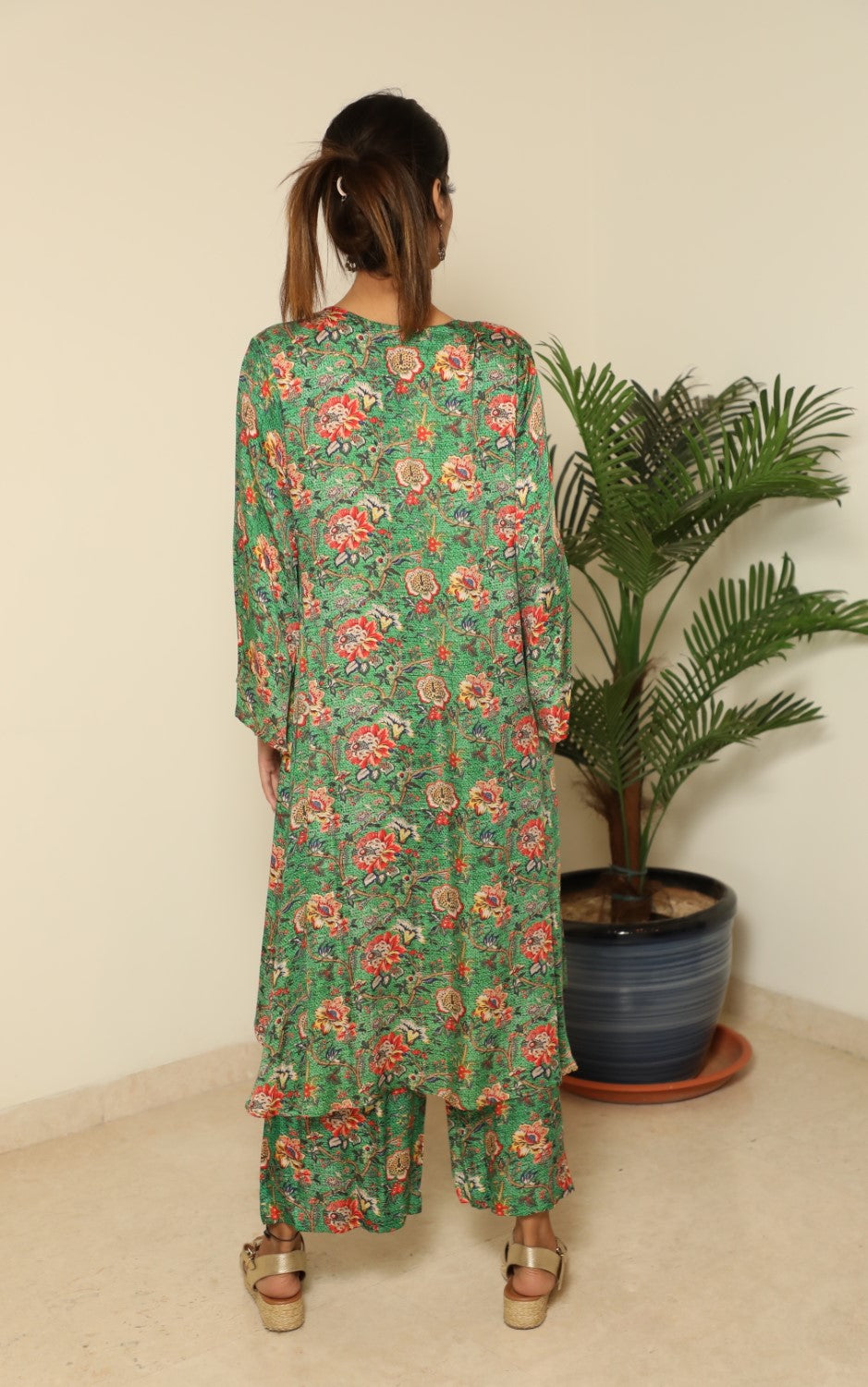 Crafted from lightweight and lustrous viscose satin, this coordinated high-low set features handmade buttons, perfect for a leisurely day of shopping with friends.