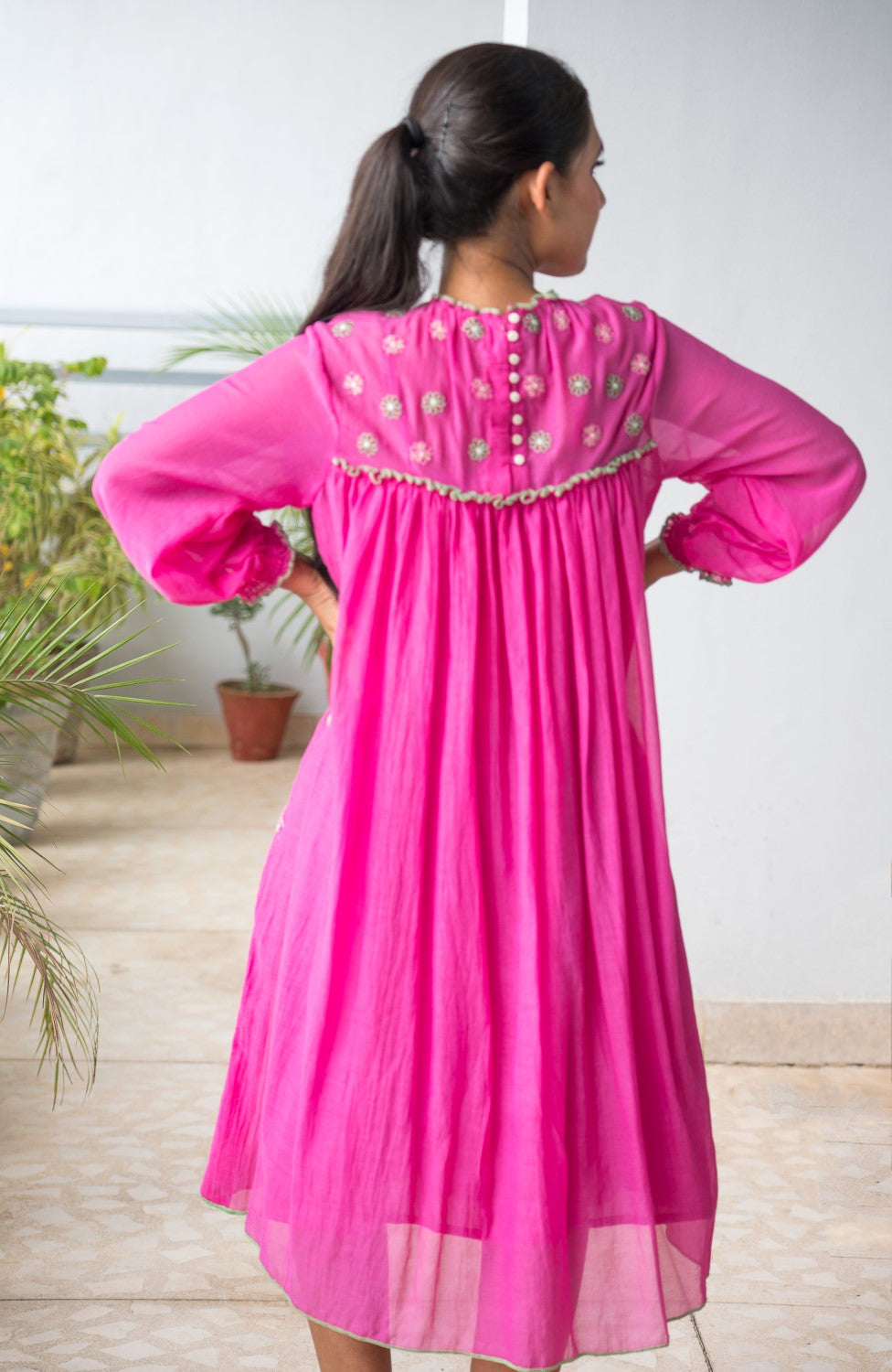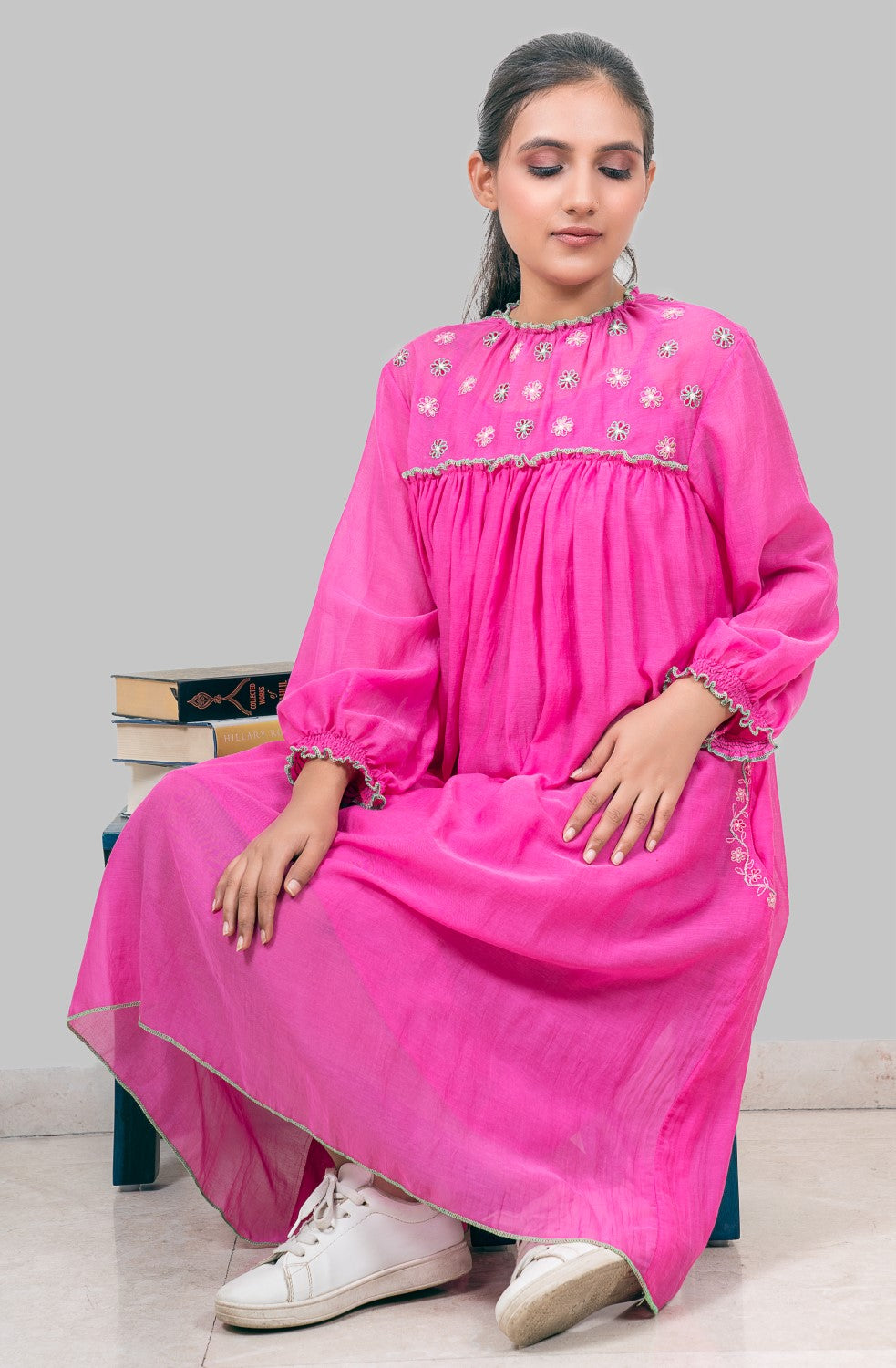 This dress is a vibrant ode to joy with its cheerful pink hues, laid-back silhouette, delicate embroidery, and meticulous detailing, perfect for a carefree day ahead.