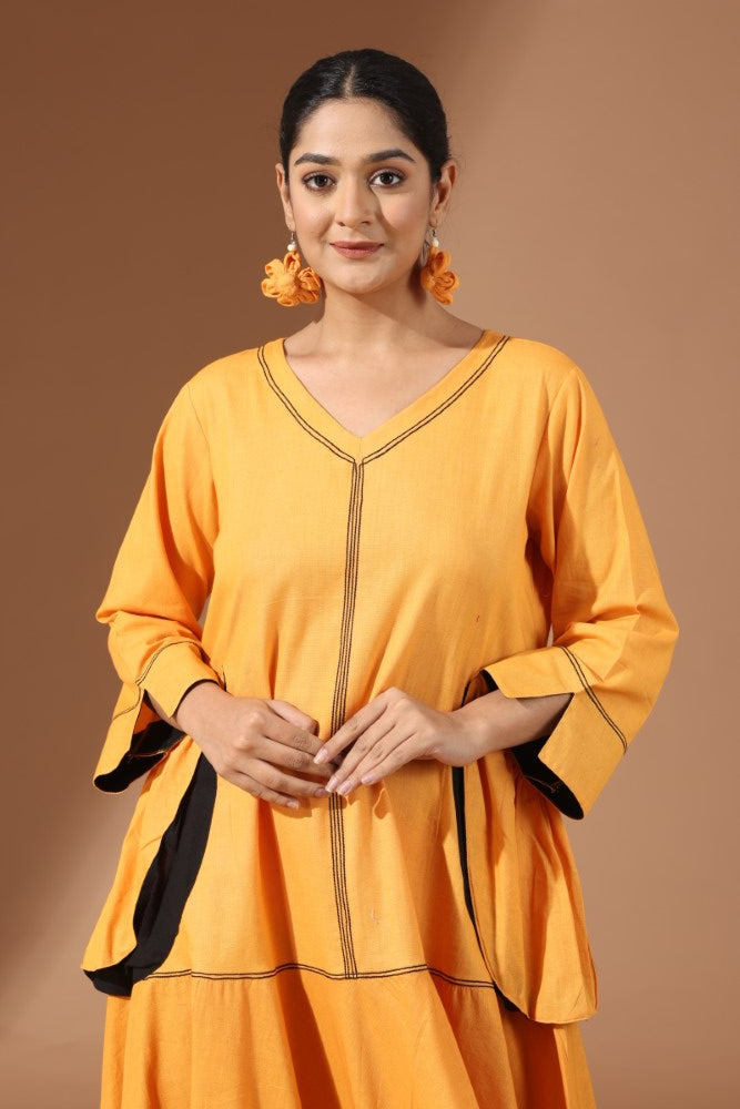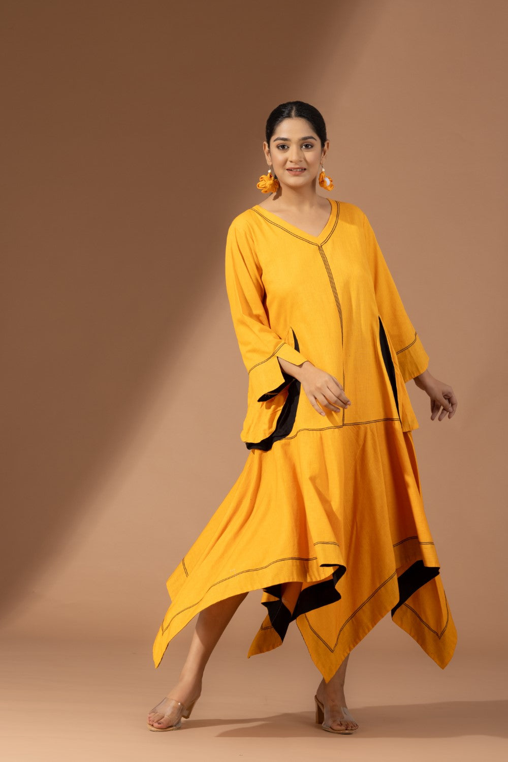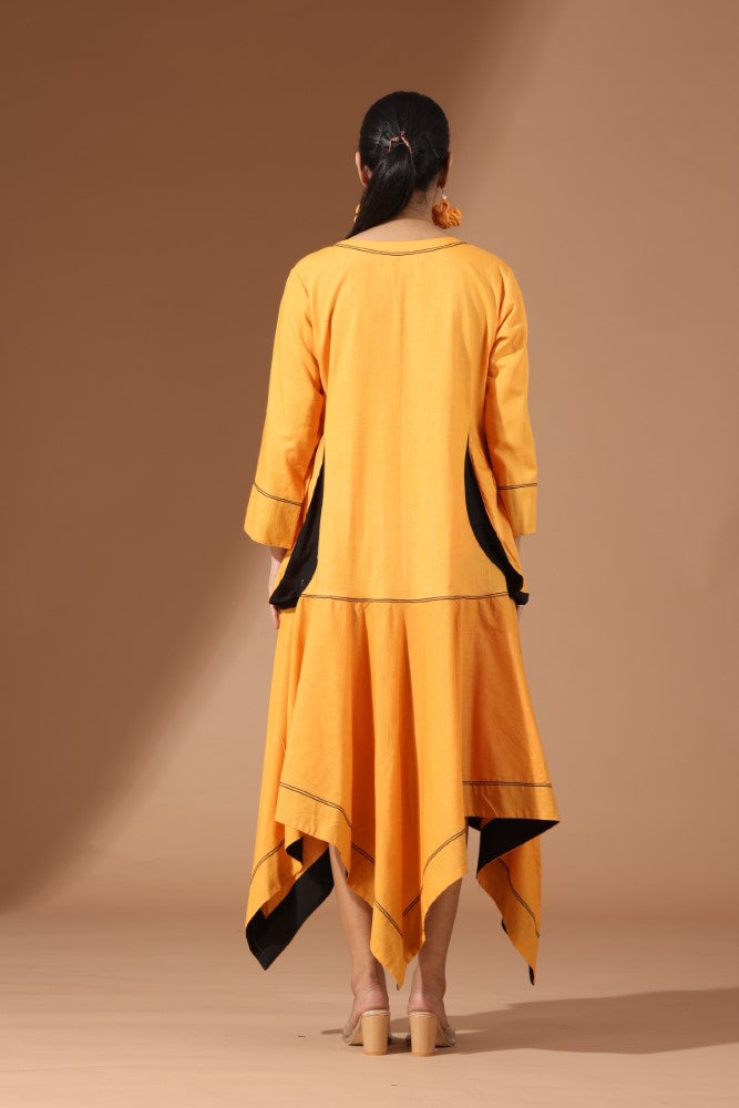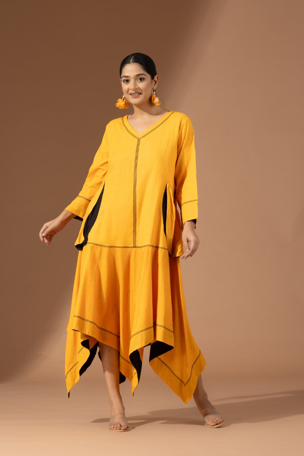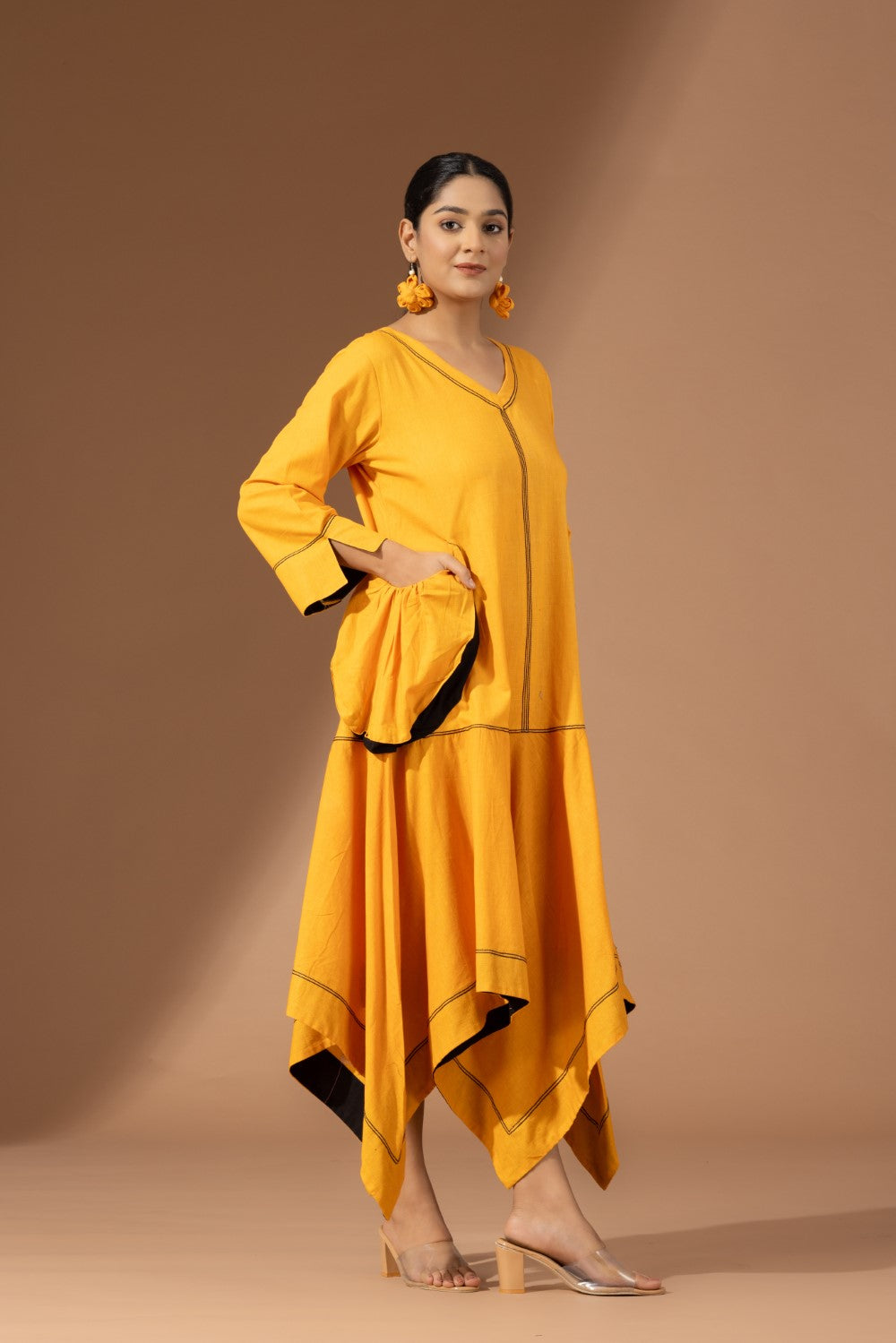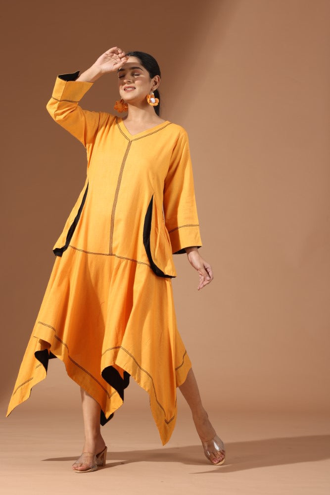 Crafted in breathable cotton linen, the Apricot Aura Dress blends effortless elegance with a touch of boho charm. The soothing apricot hue is both uplifting and sophisticated, while the jewel neckline and 3/4th sleeves add a timeless appeal. Thoughtfully designed with a bias asymmetrical hem and black facing for a striking contrast, this dress features side-patched pockets for functionality. Delicate all-over stitch detailing enhances its handcrafted essence, making it an ideal choice for a laid-back day with a hint of sophistication. Style it with artisanal jewelry and strappy flats for a chic yet relaxed look.