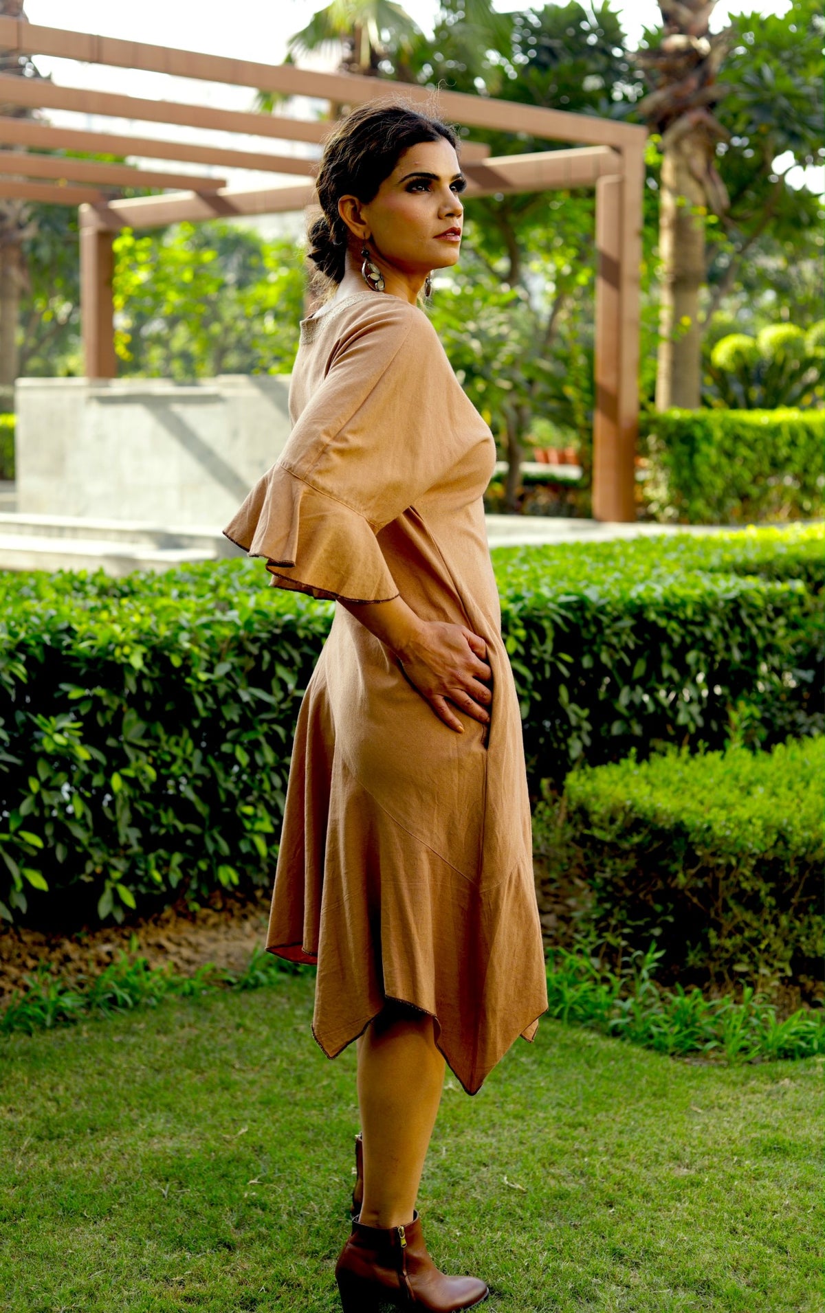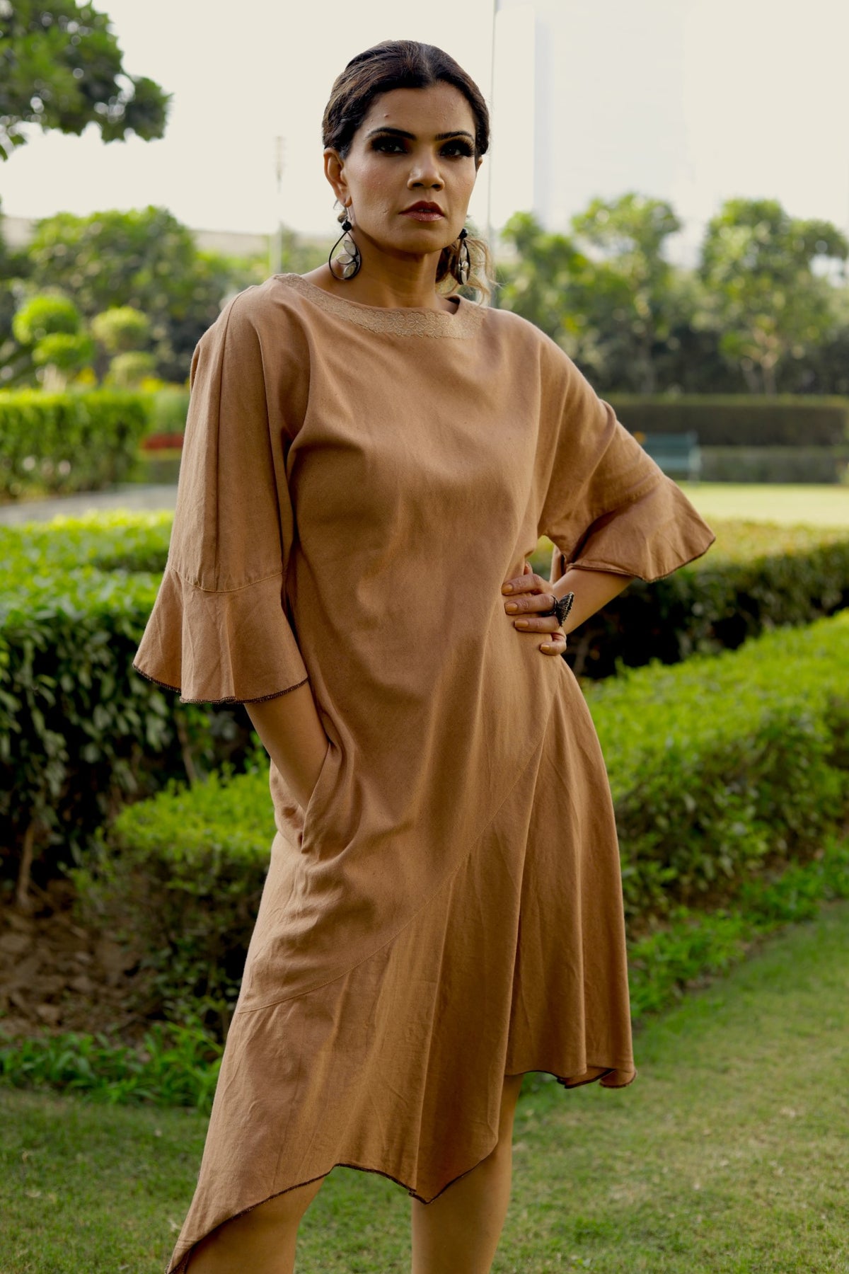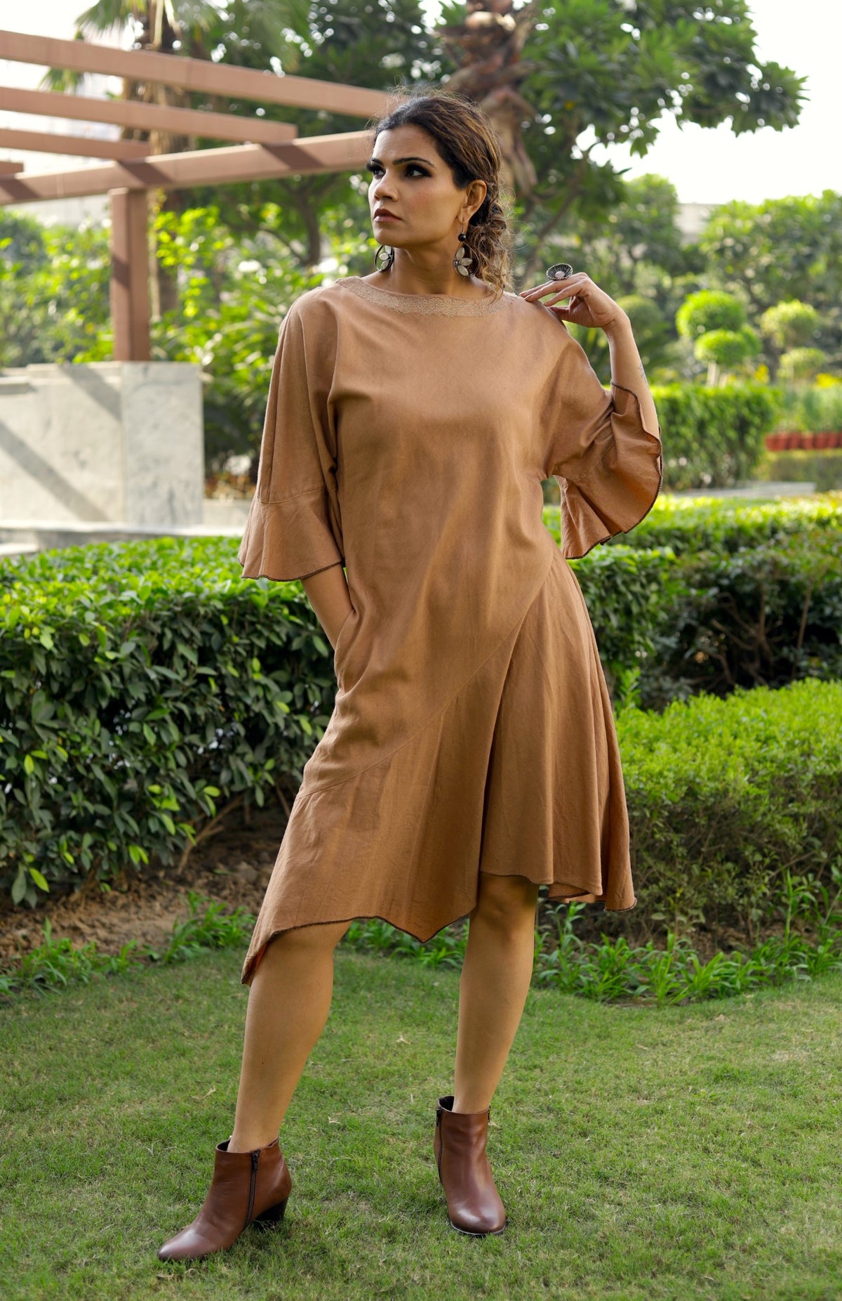 The mid-length shift dress features an asymmetric hem in a biased cut, making it both functional and stylish for all-day wear. With its boat neck adorned with fine tone-on-tone silk thread embroidery, raglan sleeves with frill detailing at the edge, and convenient side inseam pockets, this dress combines practicality with elegance.