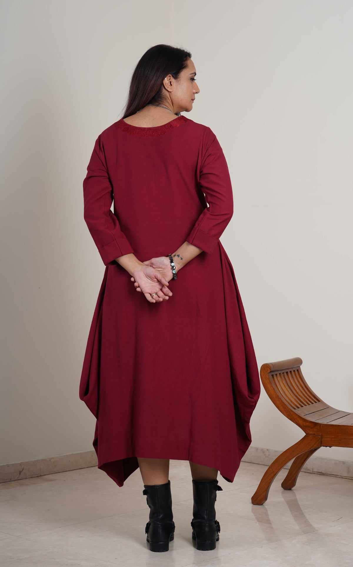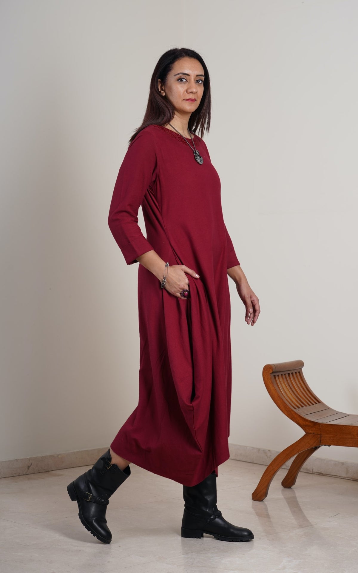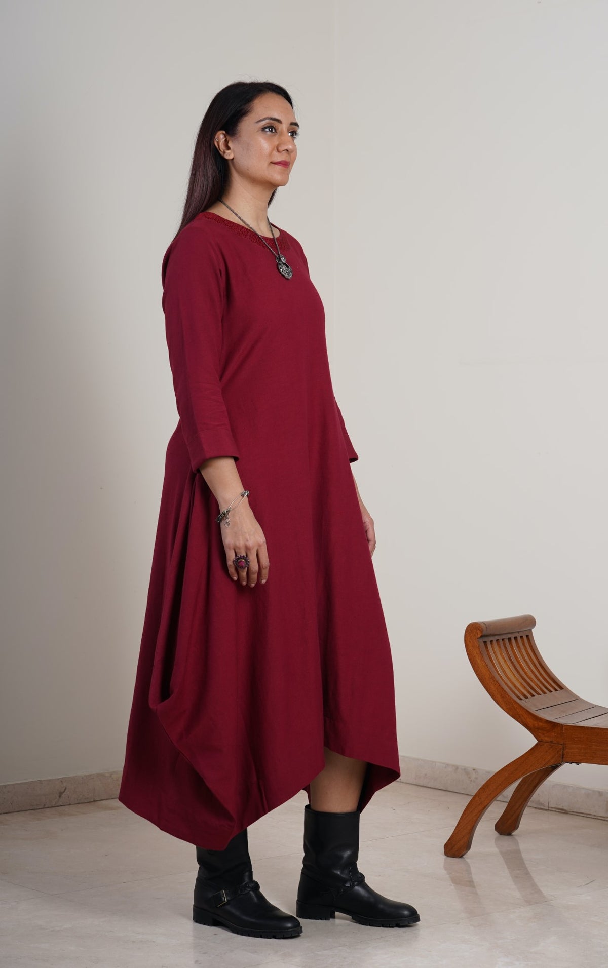 Cowl dress with fine tone-on-tone embroidery at the neck- an alluring combination of comfort and style.