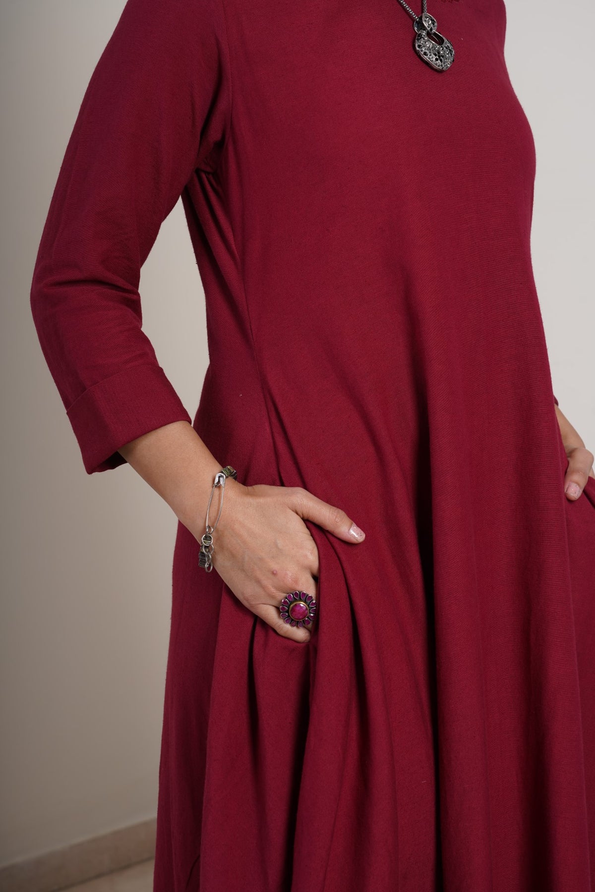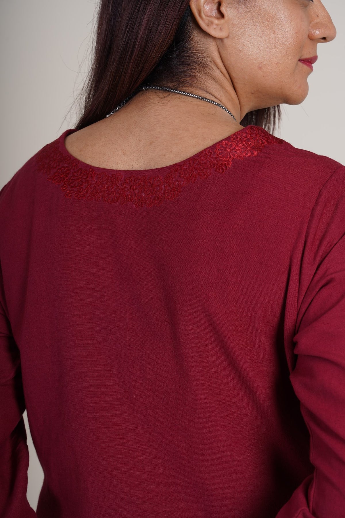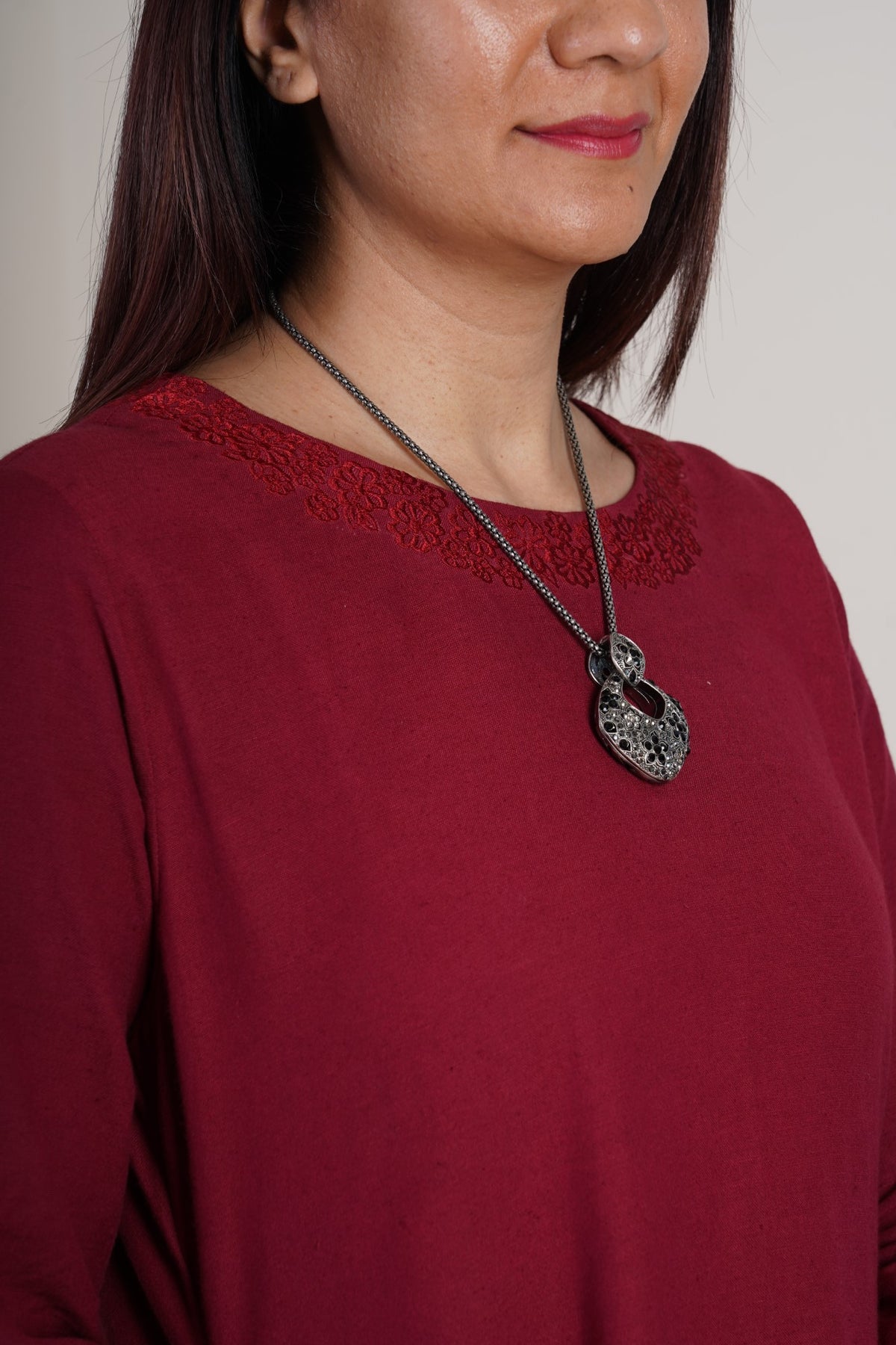 Cowl dress with fine tone-on-tone embroidery at the neck- an alluring combination of comfort and style.