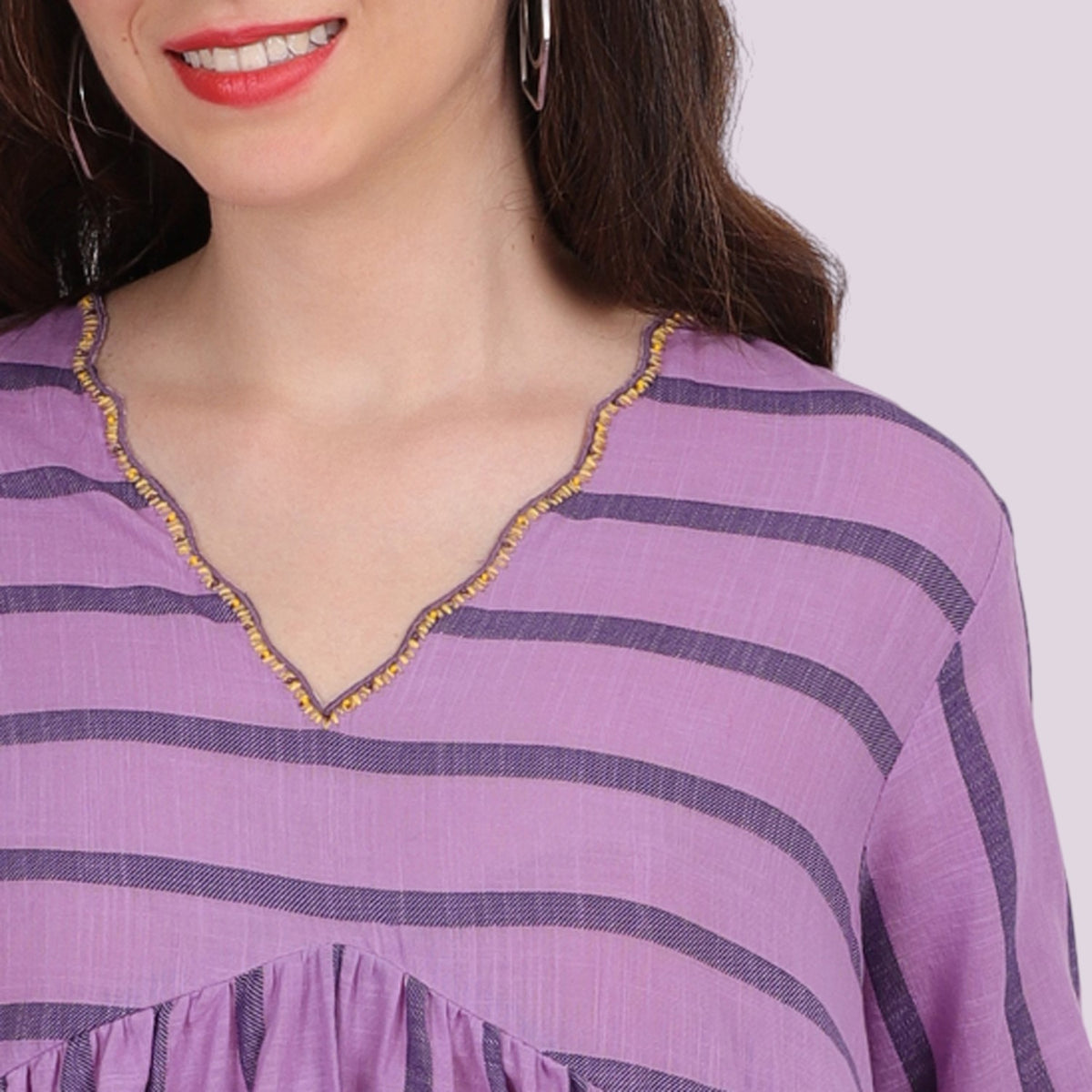 • 3/4th sleeves in striped cotton and silk cotton with dainty embroidery accentuated with beads and tassel