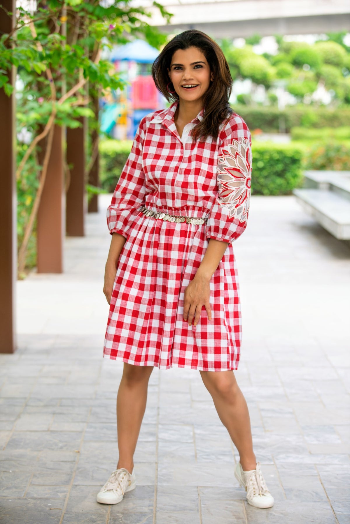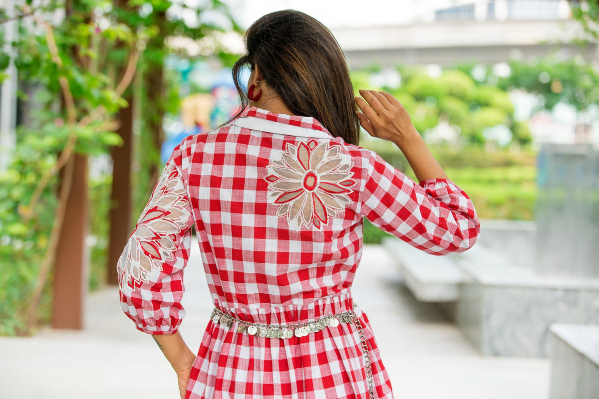 A mid-length dress with a gathered silhouette and delicate applique work, perfect for a relaxed day spent with friends.