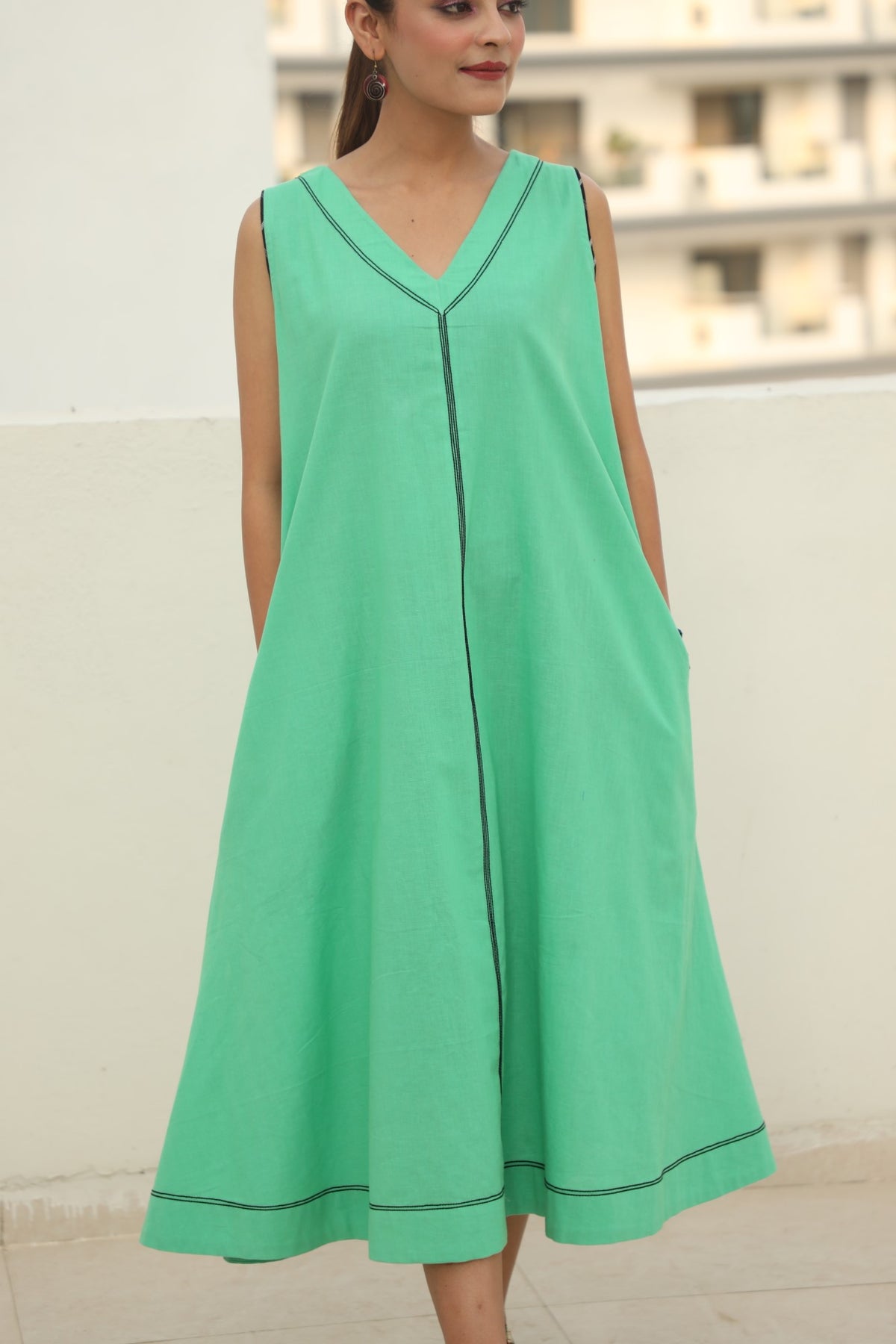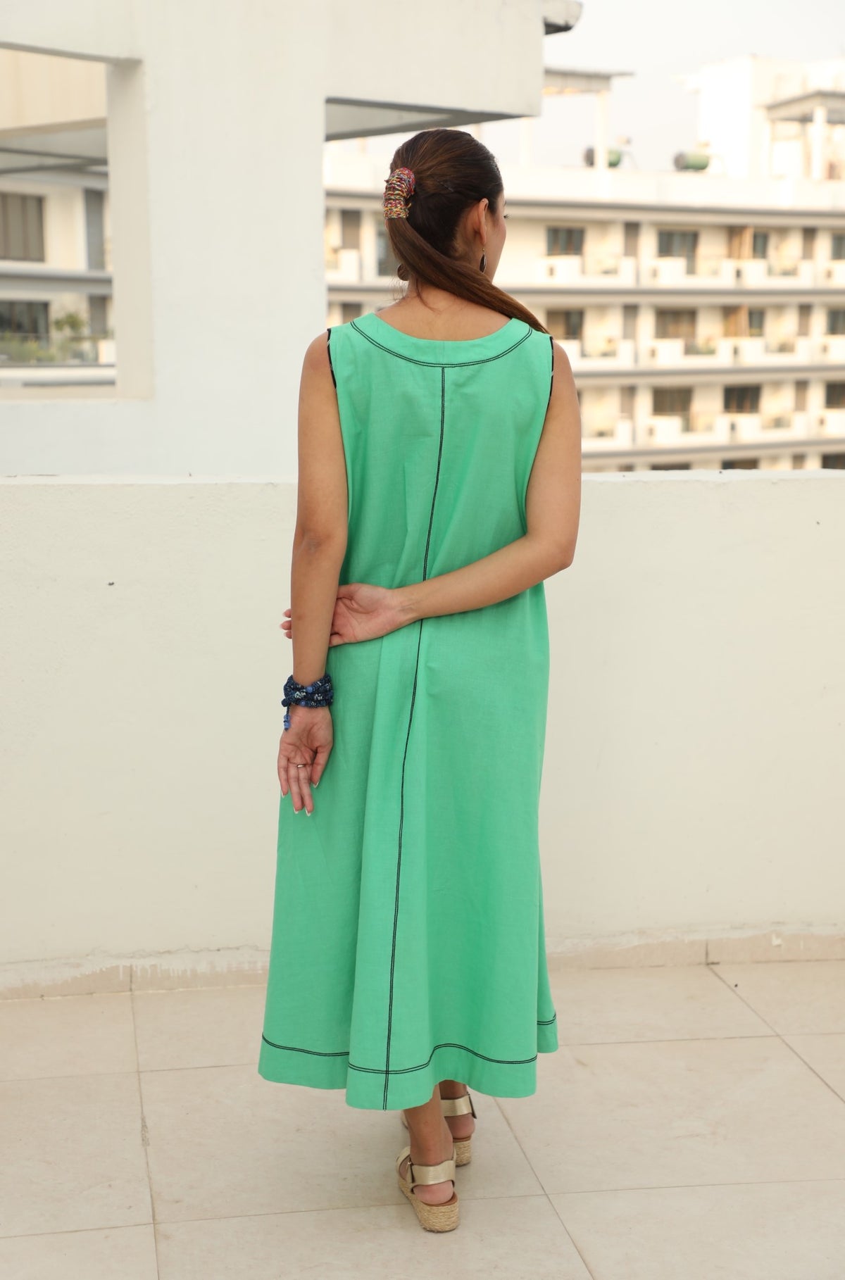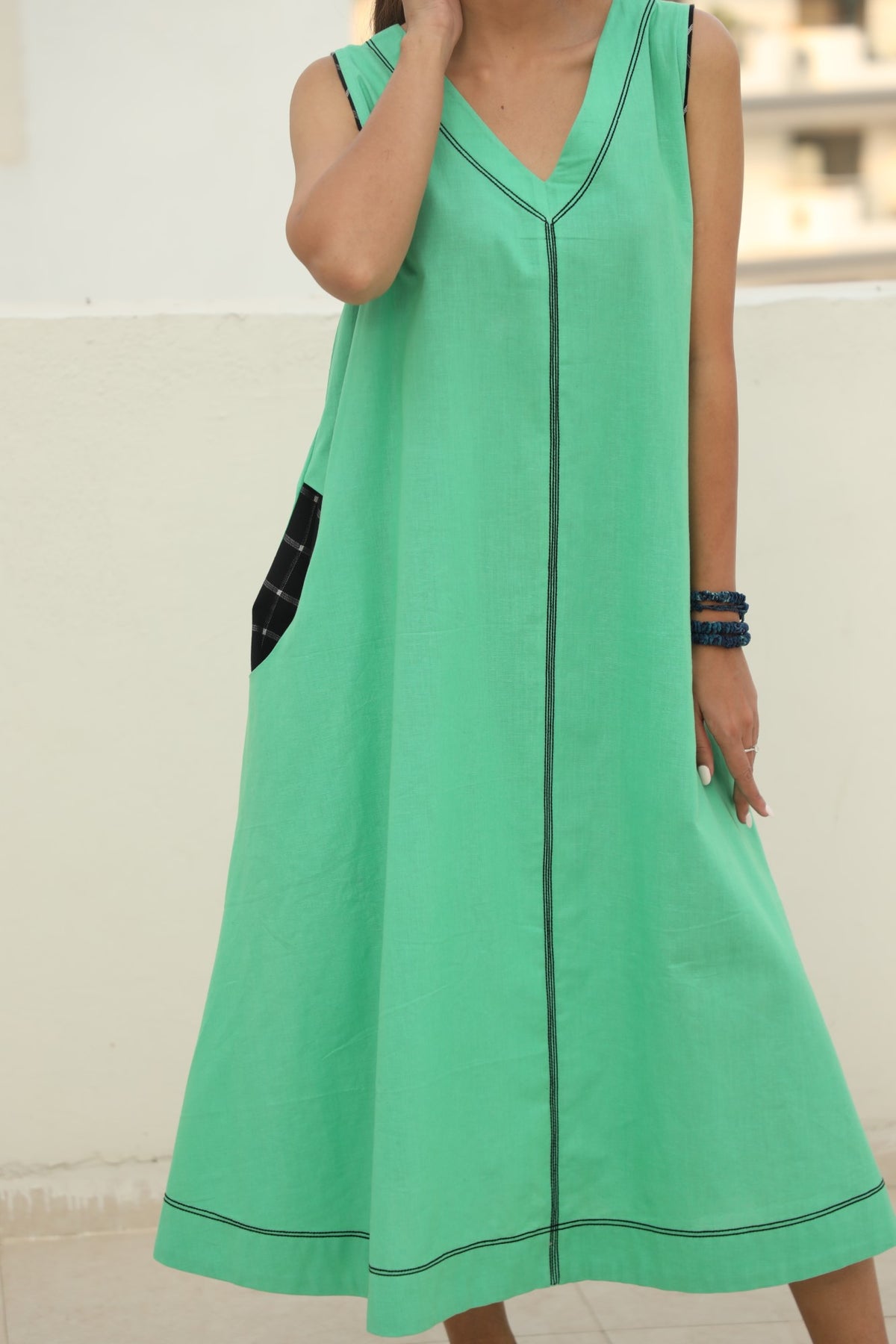 Crafted from cotton linen, this elegant dress boasts a refreshing mint green hue and a flattering A-line silhouette in Orabe. Accentuated with delicate silk thread detailing and contrasting color-facing on the exposed pockets, it exudes sophistication with a touch of charm. Perfect for both professional settings and relaxed weekend gatherings, its breezy fabric ensures comfort throughout the day. Pair it with your trousers or Palazzo to complete the outfit.