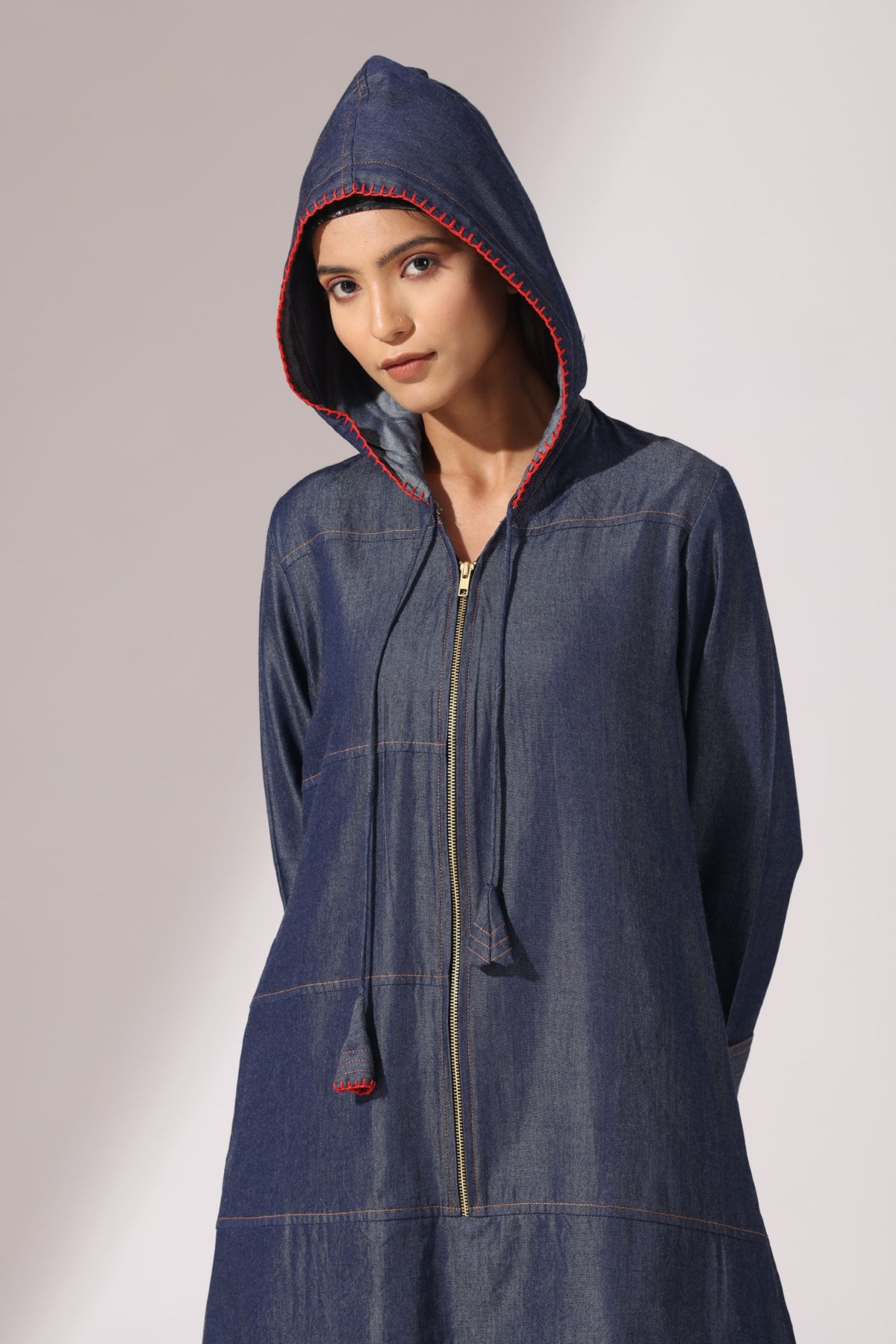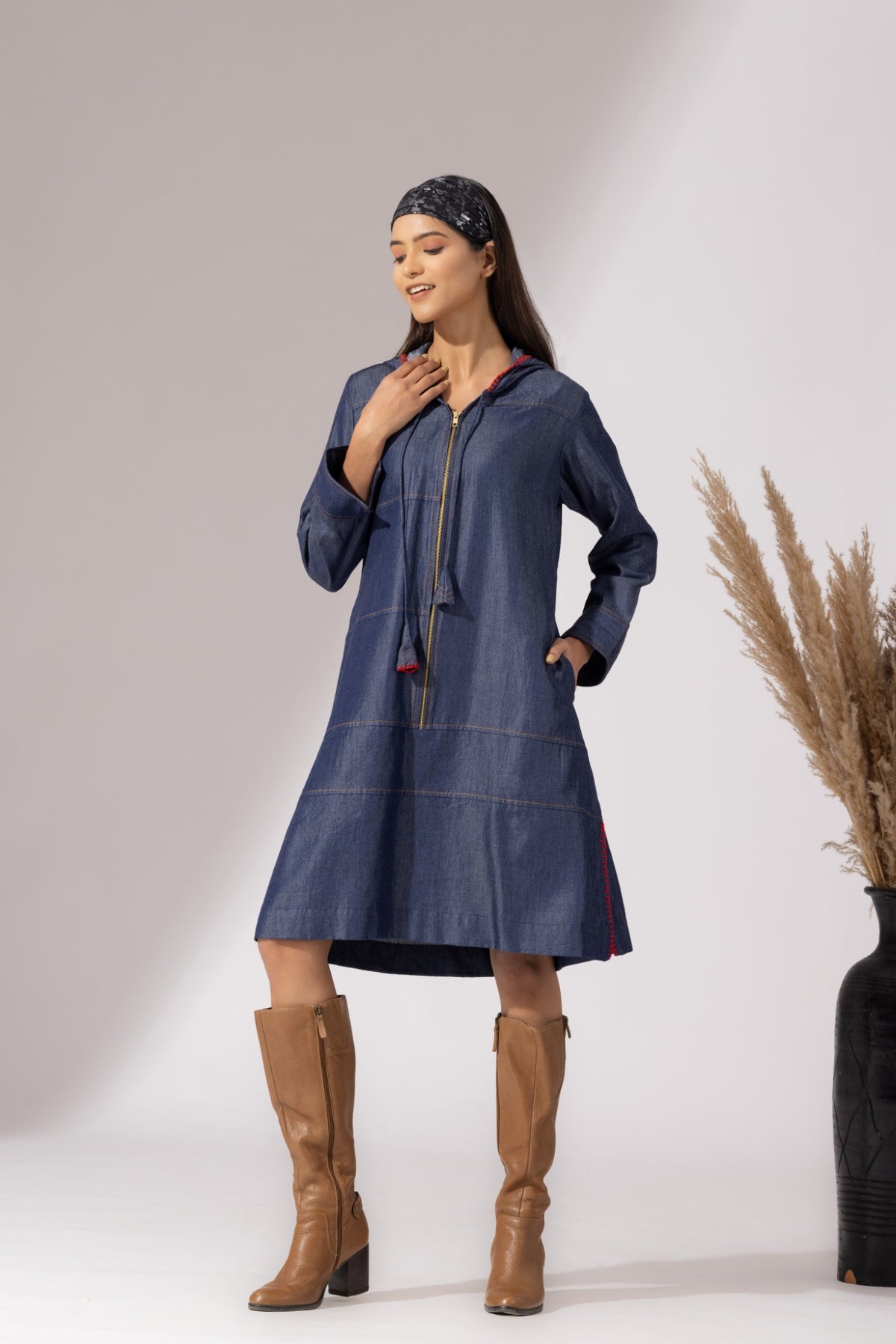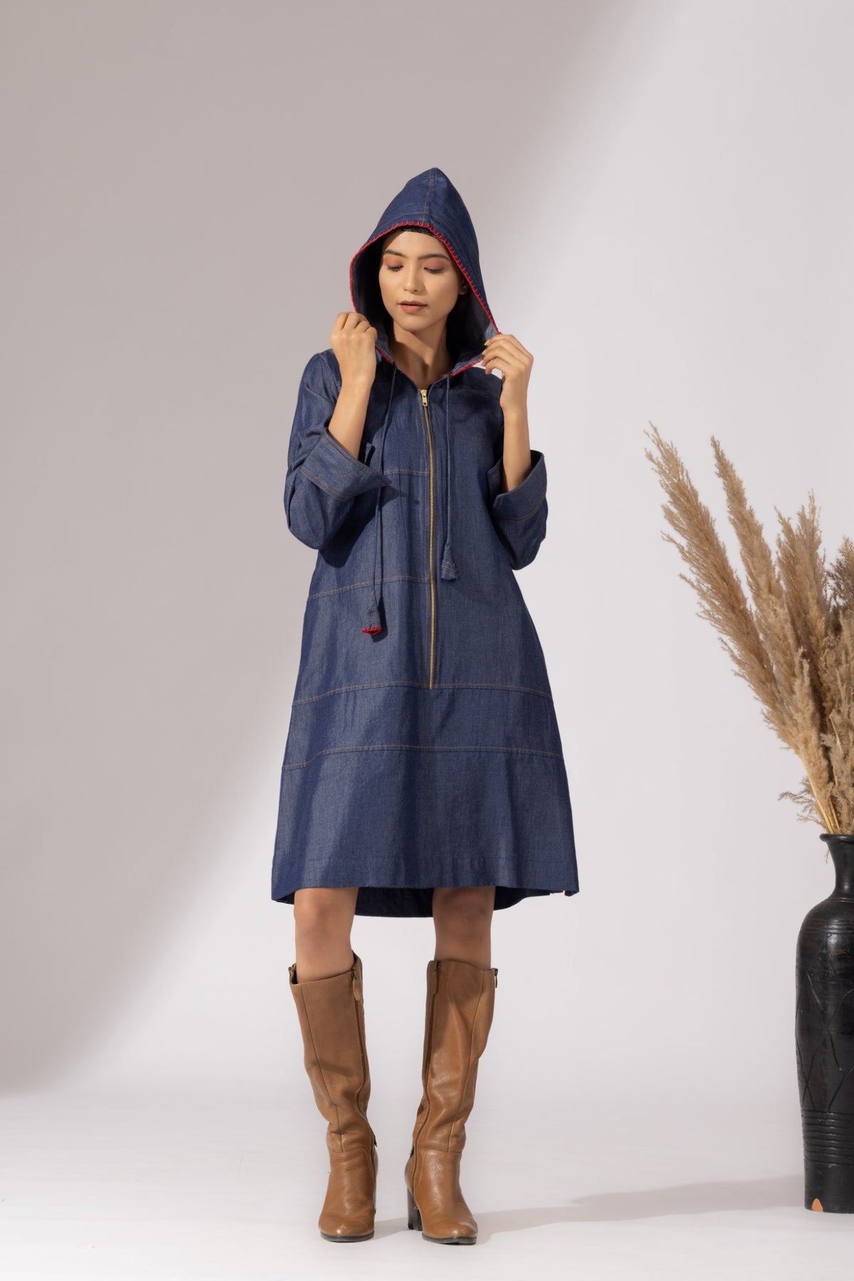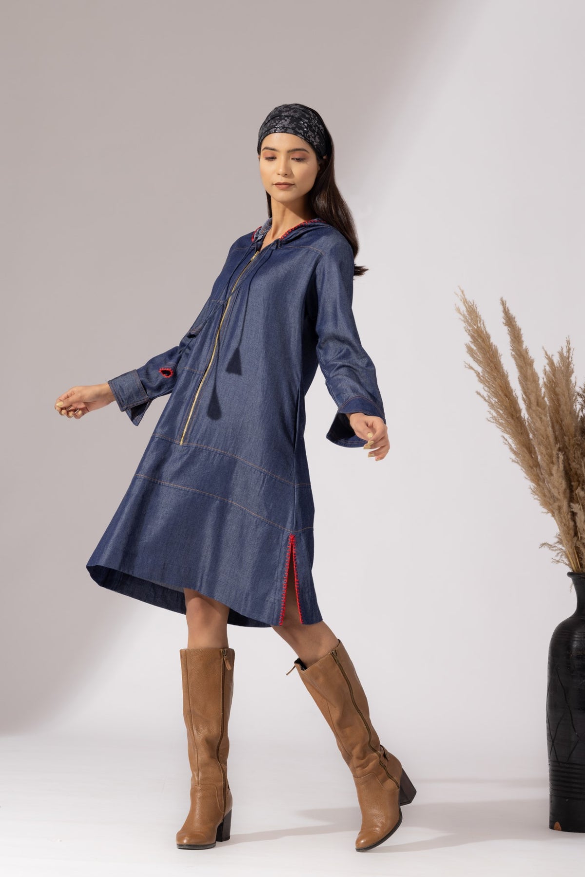 Featuring a sleek front metal zipper, long folded cuff sleeves, a functional hood, and side pockets, this dress balances style and practicality effortlessly. A side slit adds a hint of elegance, while the contrast color hand embroidery and fine detailing showcase its artisanal craftsmanship. Ideal for casual outings or elevated daywear, this versatile piece is a wardrobe essential.