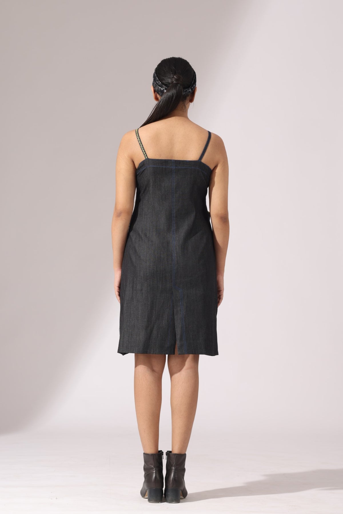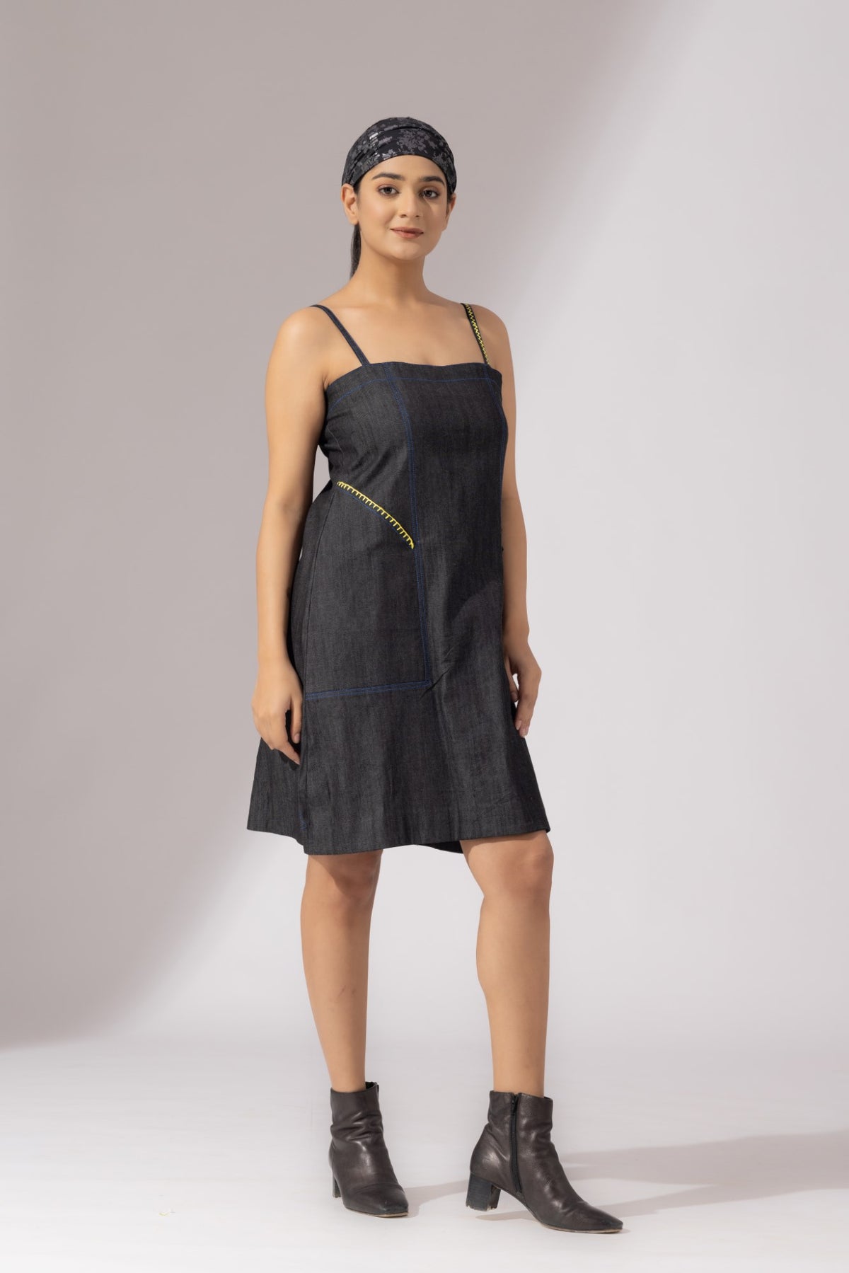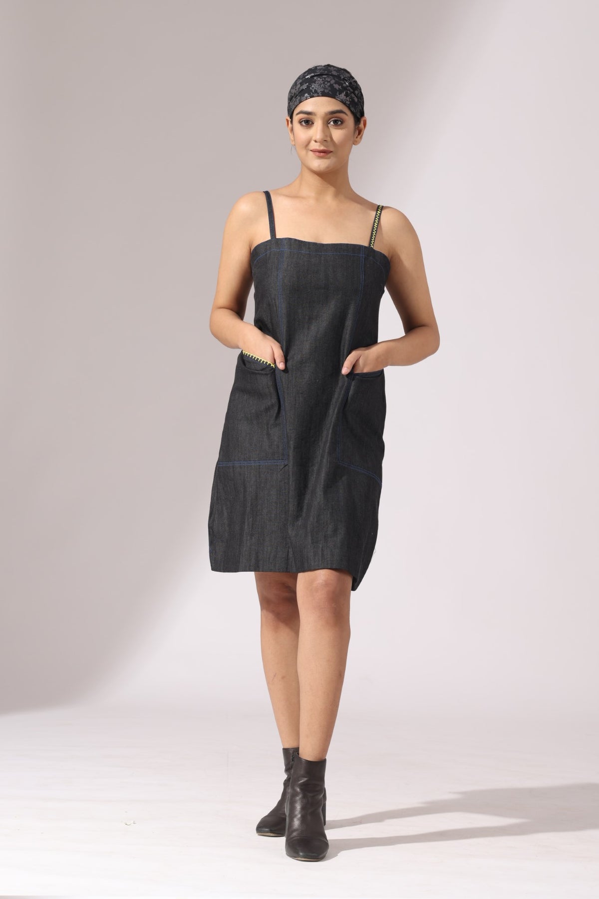 Effortlessly stylish and modern, this denim spaghetti strap mini dress is perfect for casual outings or elevated layering. Featuring a flattering back slit and functional front pockets, it combines utility with flair. The contrast color hand embroidery and fine detailing add a pop of artistry, making it a standout piece. Pair it with our long denim jacket for a chic, sophisticated look that transitions seamlessly from day to night.