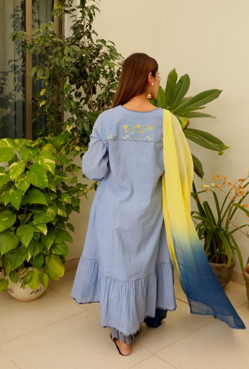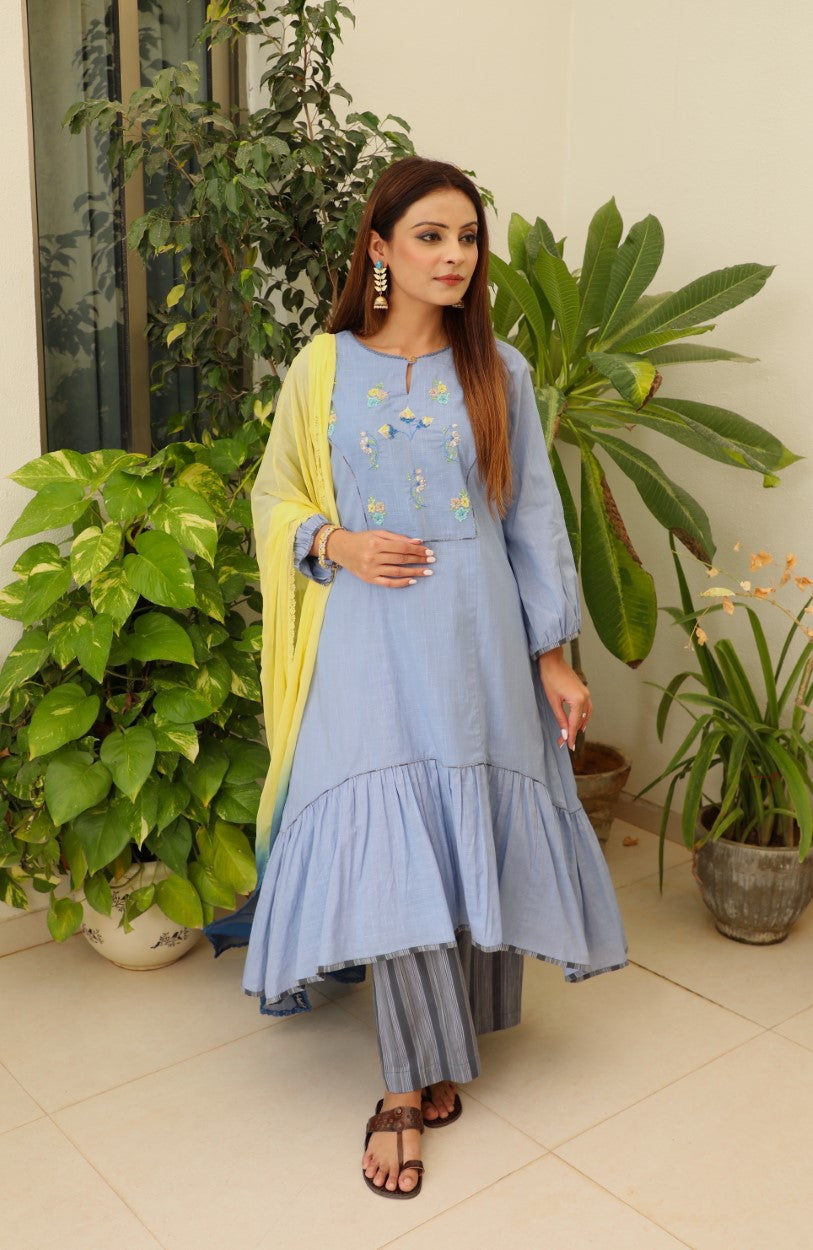 Stay effortlessly stylish in our soothing hues high-low kurta set featuring elegant embroidery and functional side pockets in breezy cotton, keeping you cool and chic. Skip the dupatta and Palazzo, and rock the tunic as a dress for a trendy, versatile look. Perfect for any gathering!
