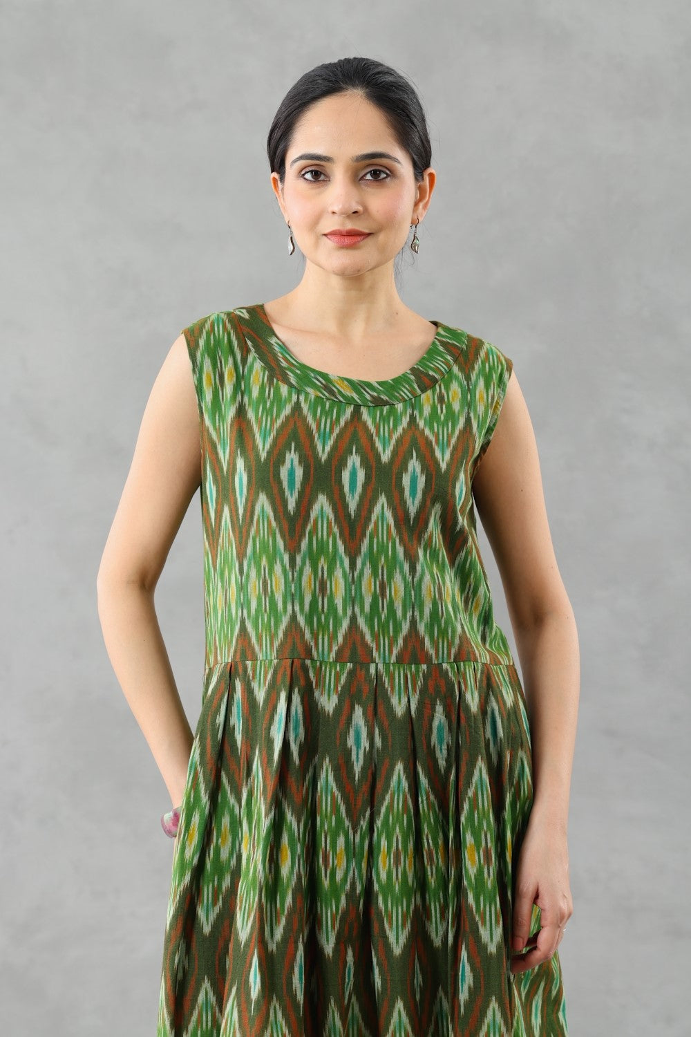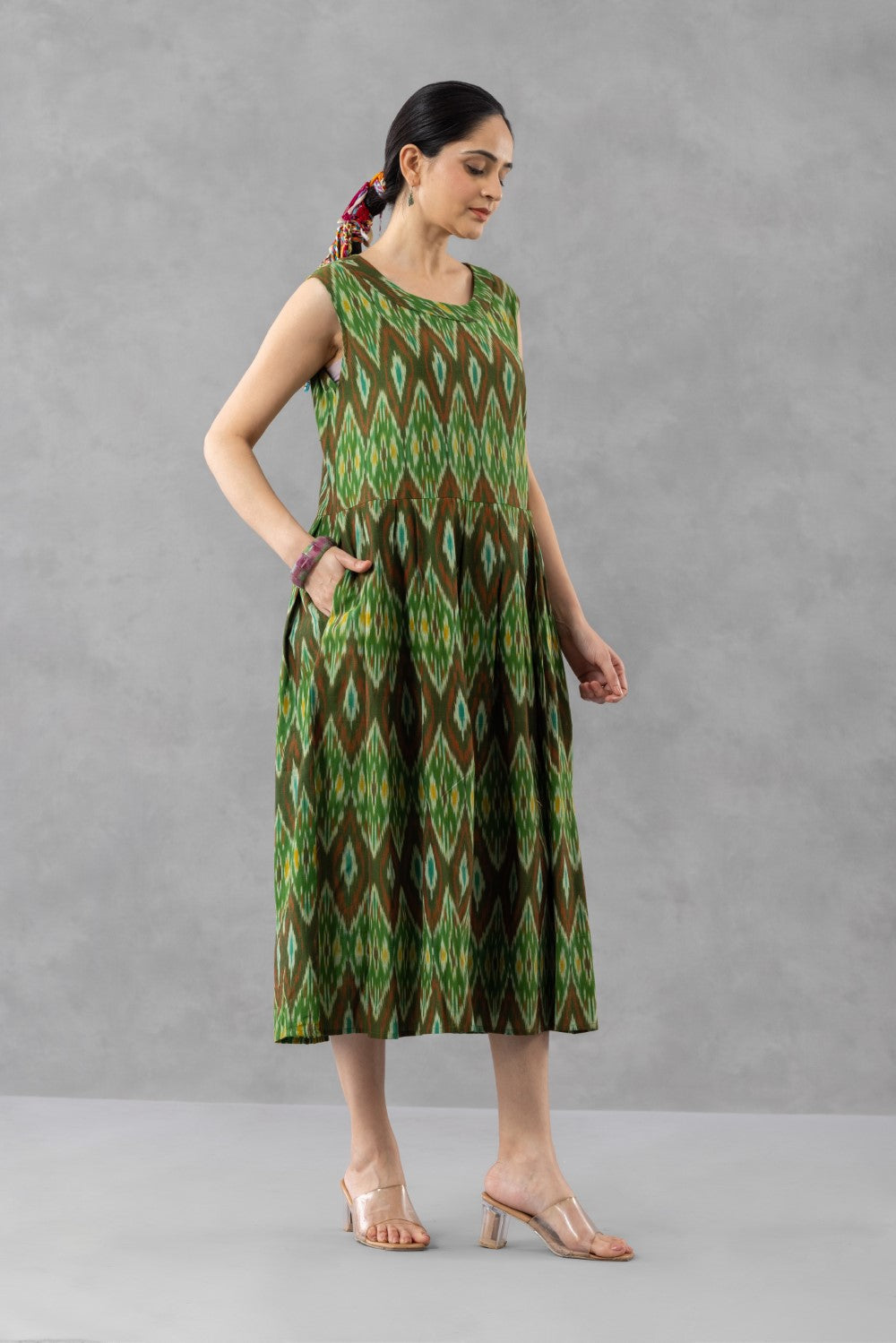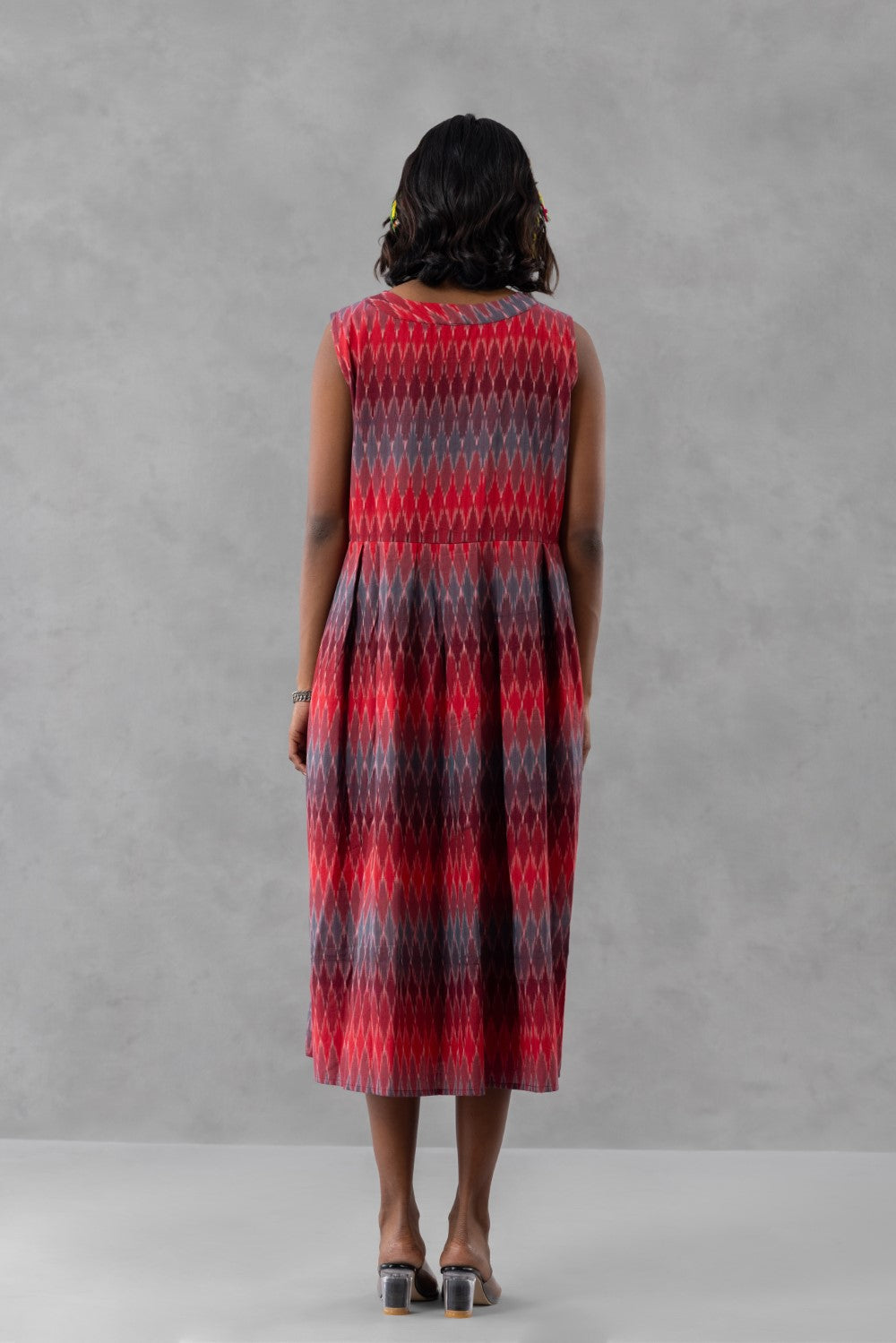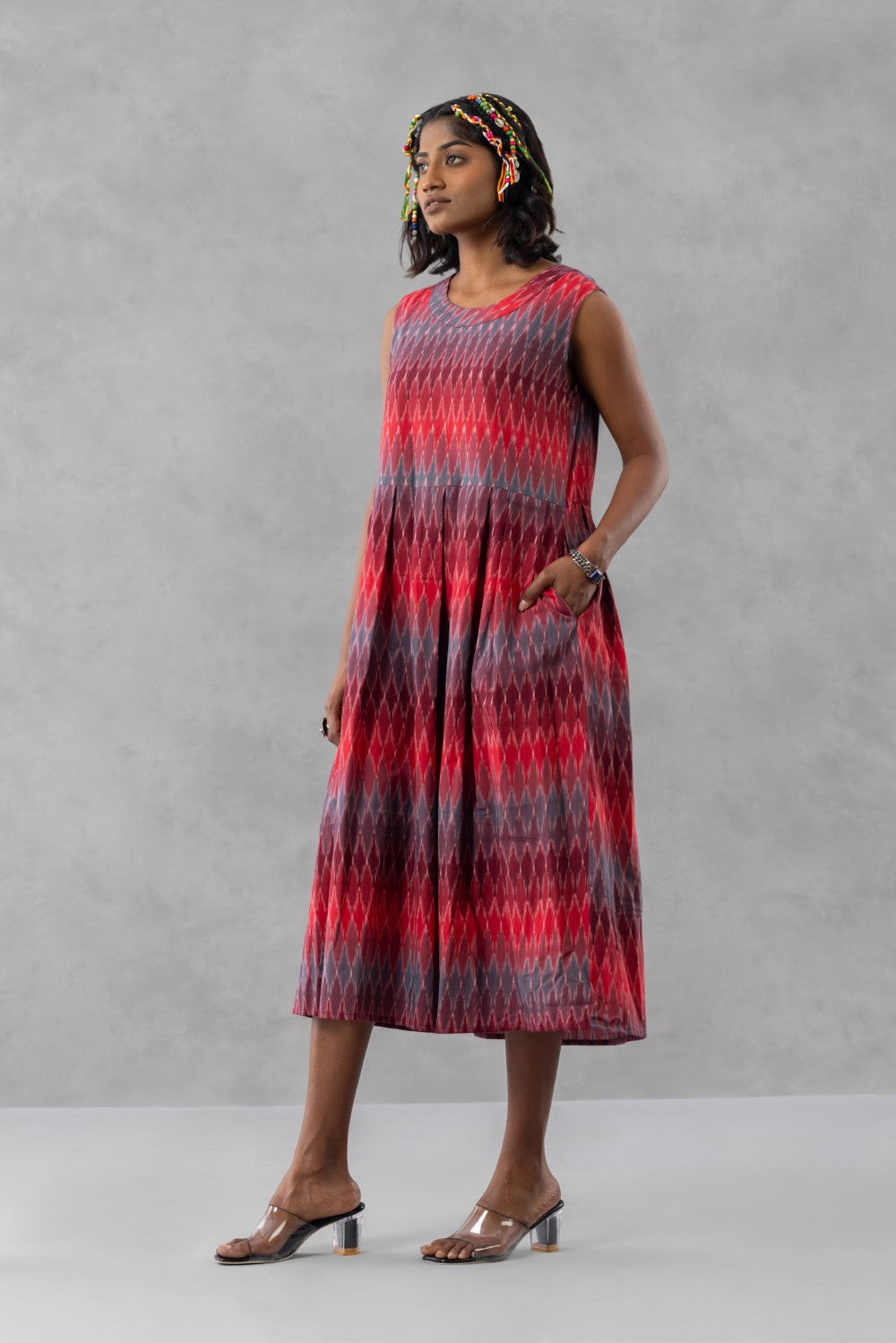 Effortless and timeless, the Ikat Ease Dress is crafted in handloom Ikat cotton and designed for all-day comfort. Featuring a clean round neckline and a sleeveless silhouette, the dress falls into soft box pleats that create gentle volume and movement.