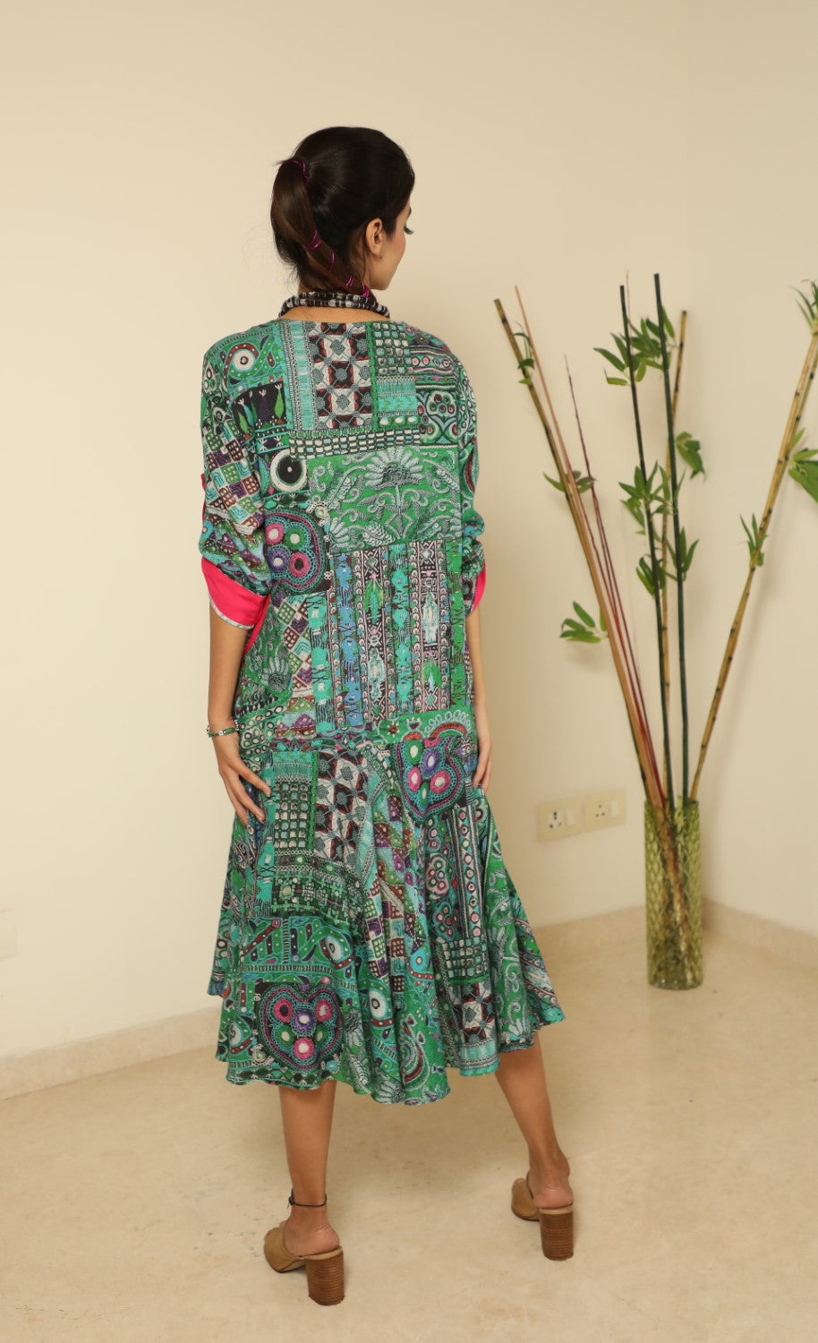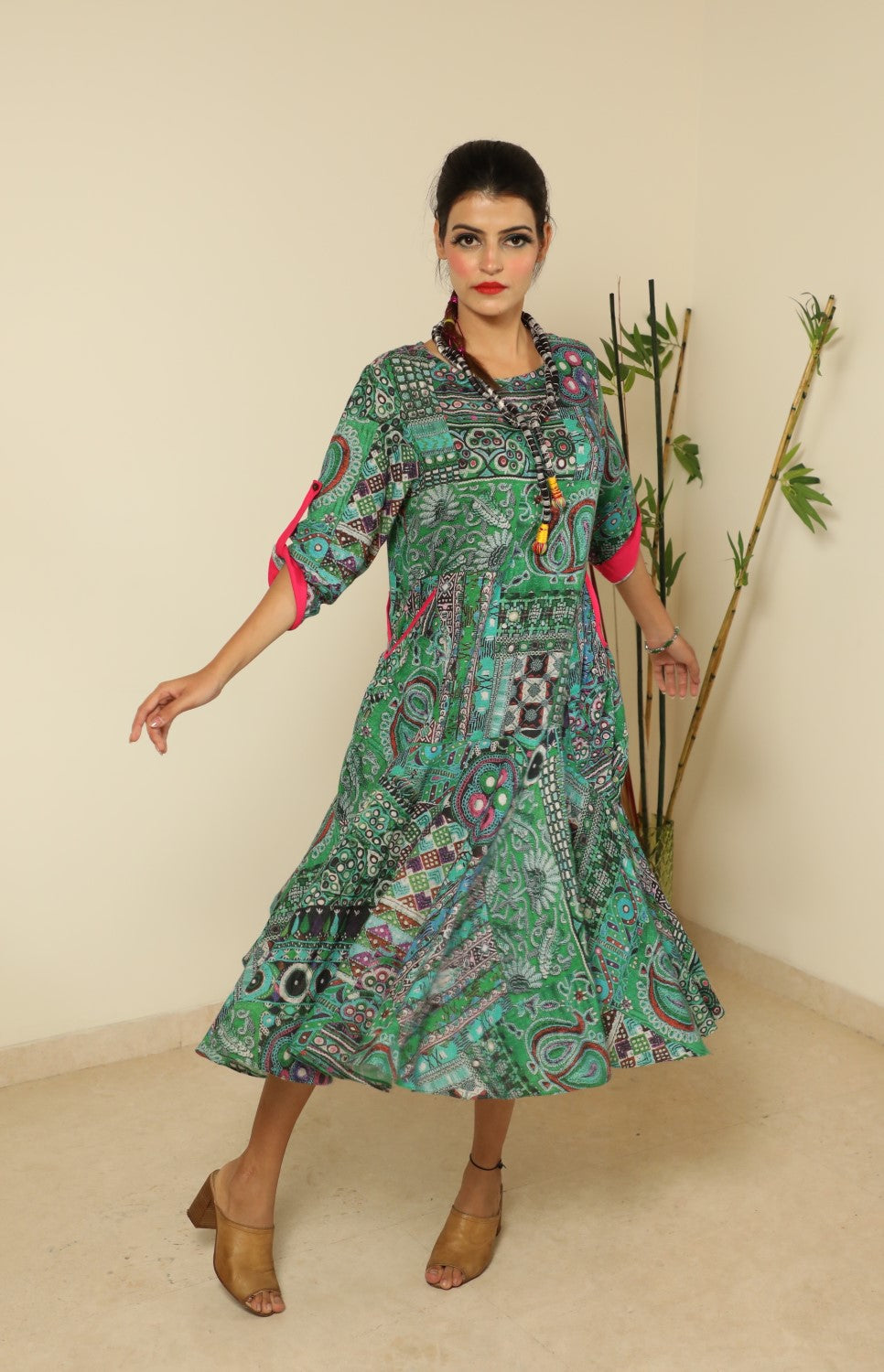 This Tourmaline dress stands out with its unique combination of a contemporary silhouette and traditional Kutch prints in a patchwork style. Enhance your look by pairing it with our handcrafted jewelry, making a bold and stylish statement at any gathering.
