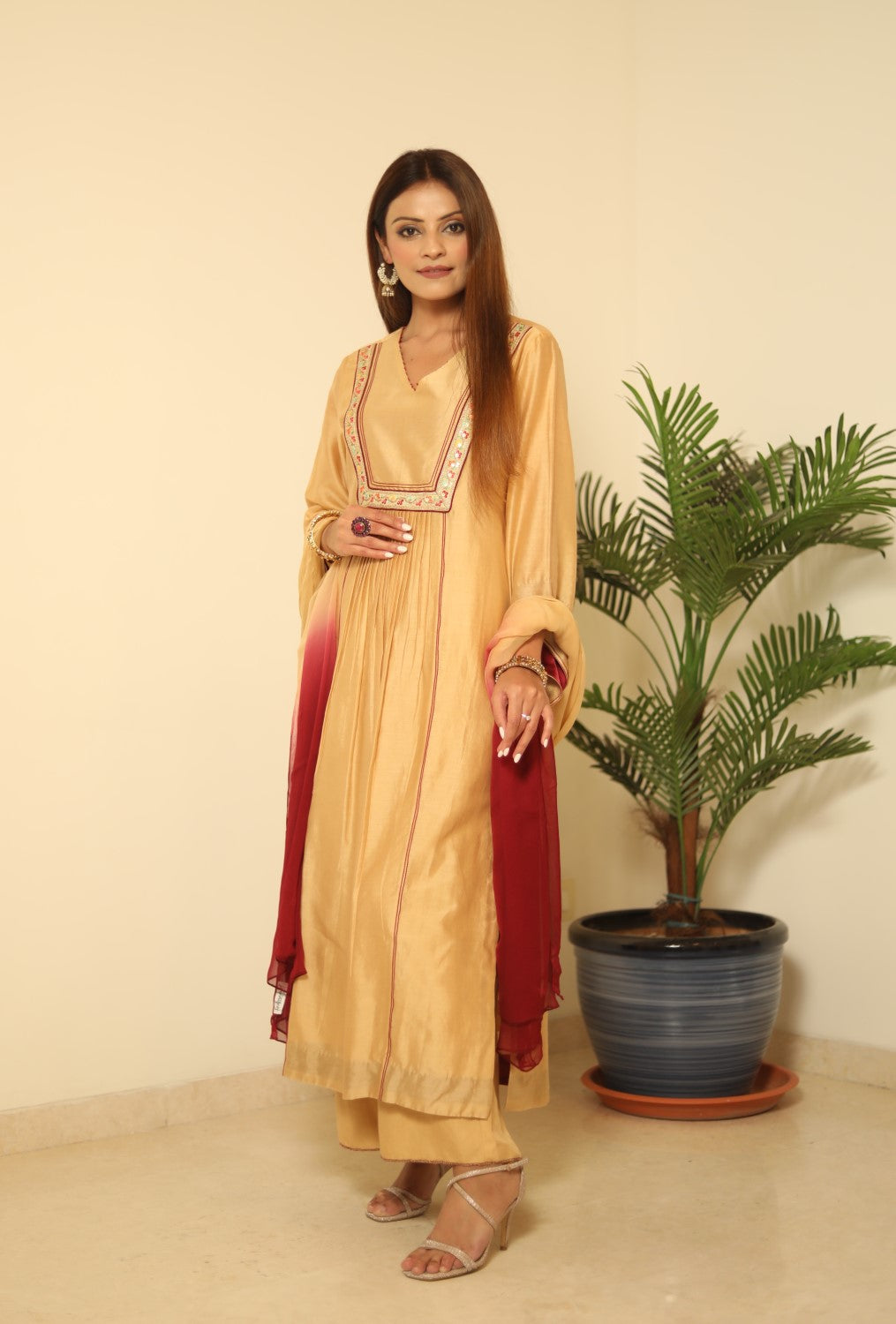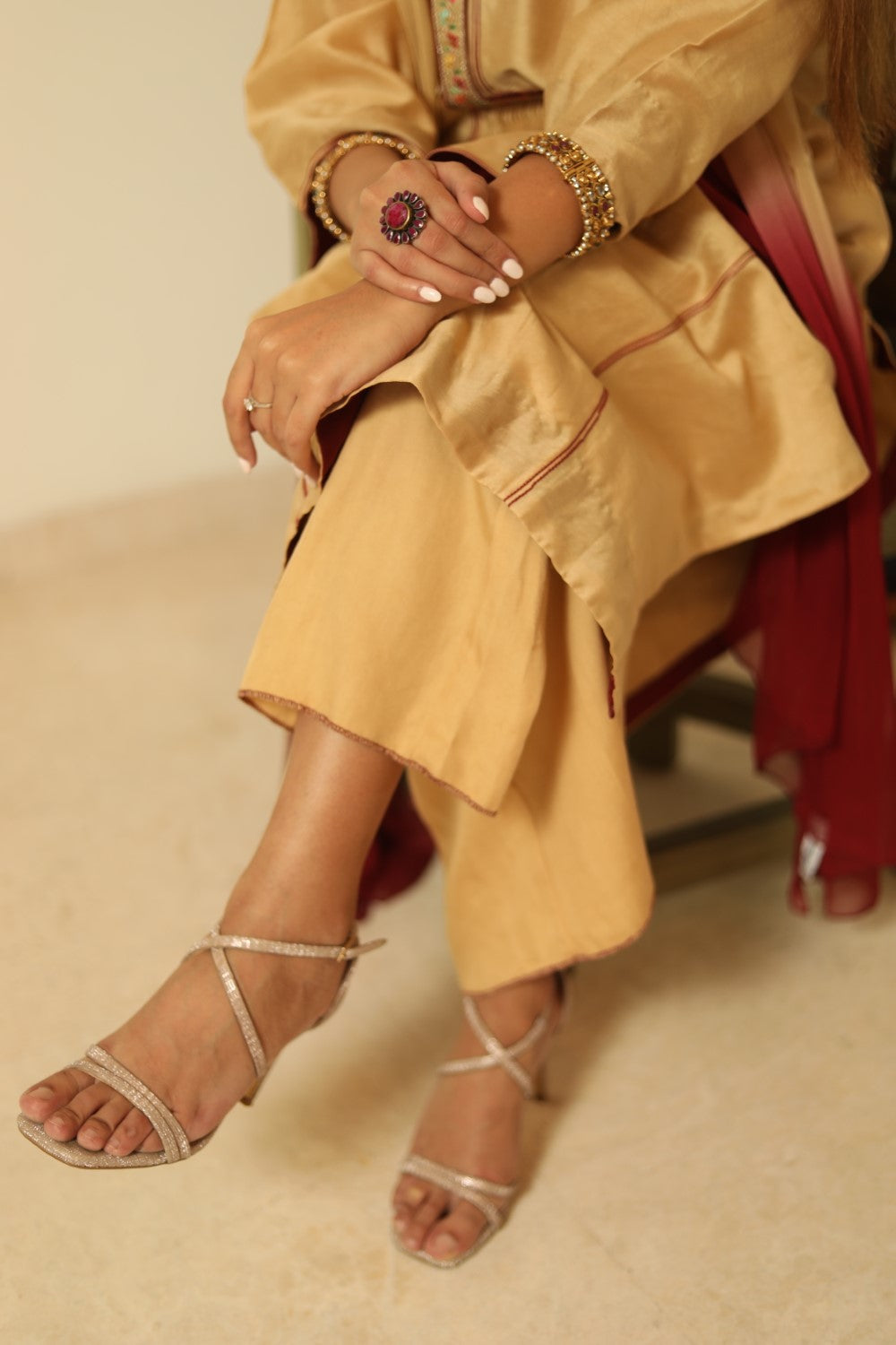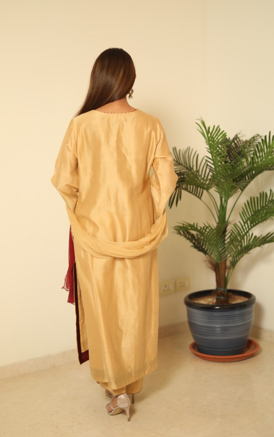 This long tunic in luxurious Chanderi silk radiates elegance, making it the perfect choice for festive seasons and formal functions. The V-neckline is delicately embellished with pearls along the edges, adding a touch of refinement. Gota detailing on the yoke, enhanced with intricate thread stitching, brings a traditional yet modern flair to the design. Soft pleats at the center of the front body, flanked by vertical stitching from the yoke to the hem, create a flattering and graceful silhouette. The 3/4th Mughal sleeves, adorned with detailed stitching at the hem, exude timeless elegance, while satin facing along the neck, slits, and sleeves adds a touch of luxe.