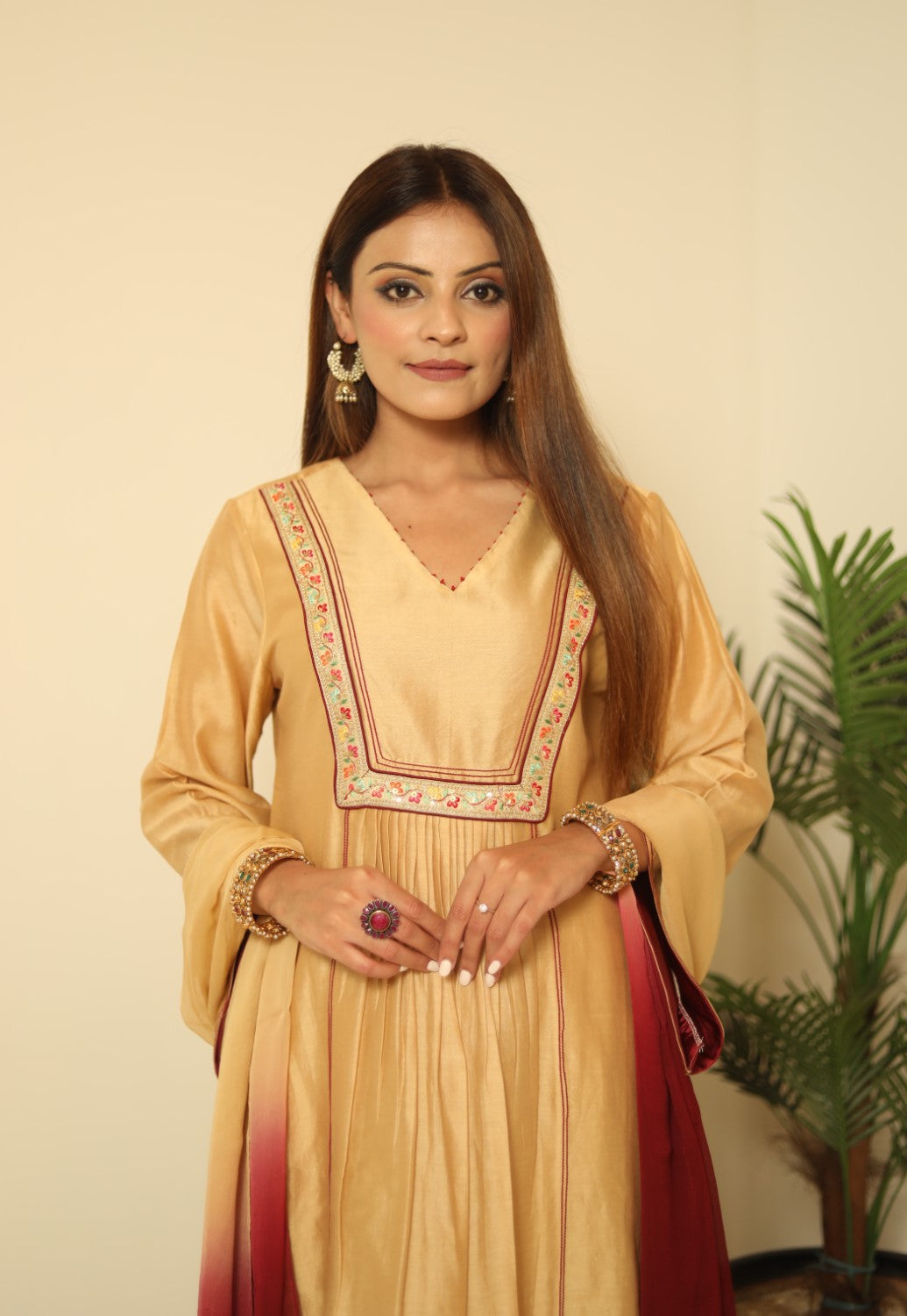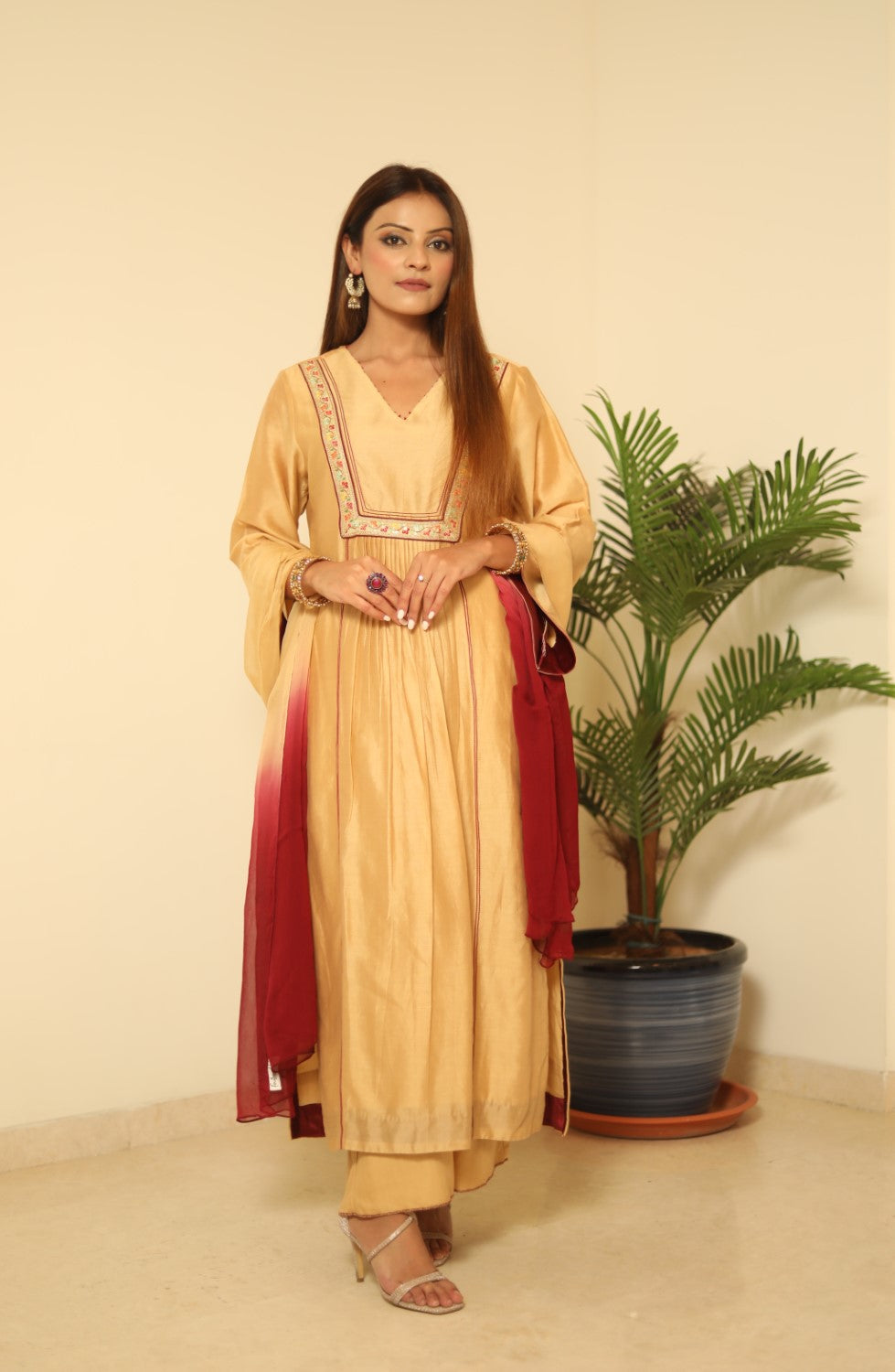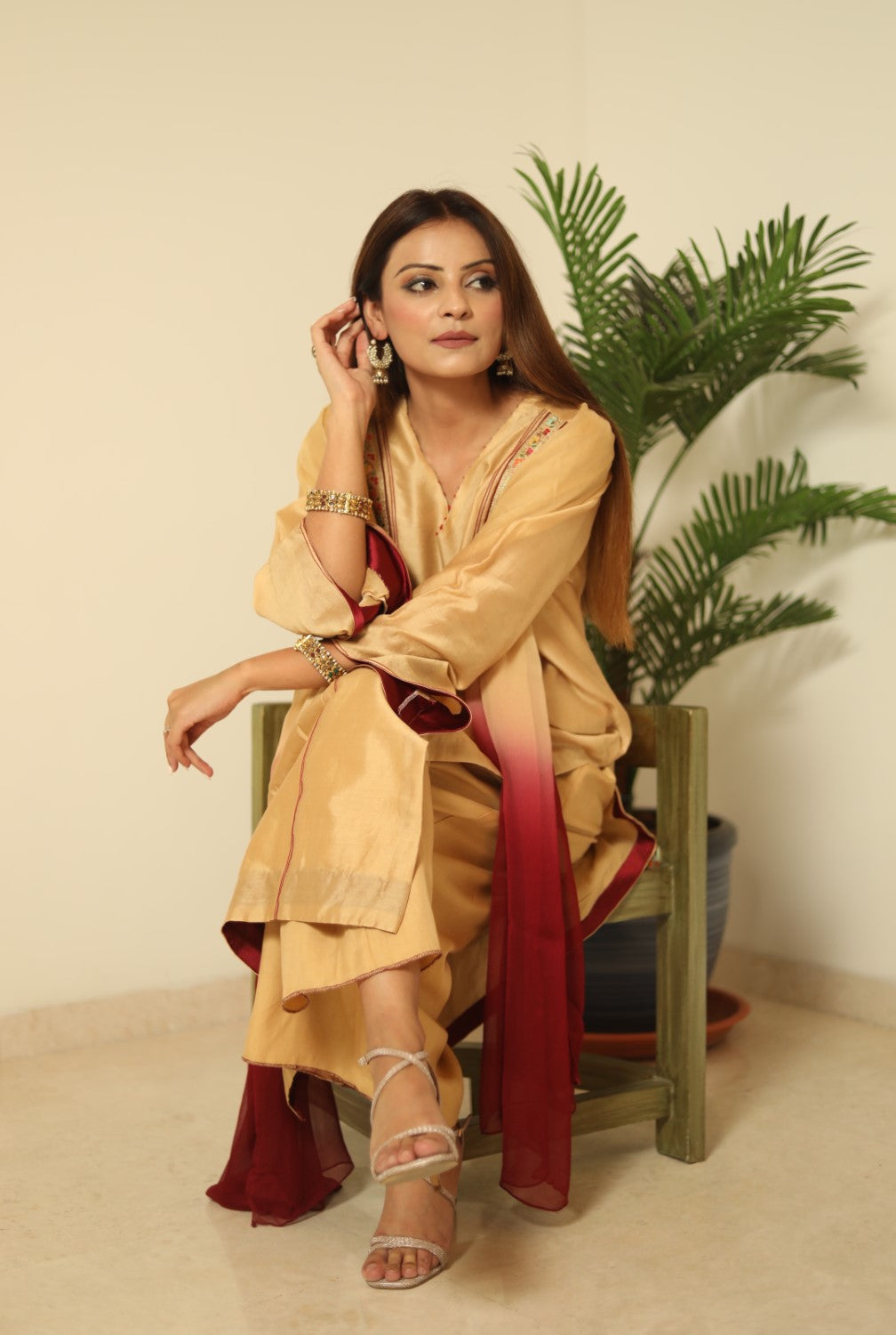 This long tunic in luxurious Chanderi silk radiates elegance, making it the perfect choice for festive seasons and formal functions. The V-neckline is delicately embellished with pearls along the edges, adding a touch of refinement. Gota detailing on the yoke, enhanced with intricate thread stitching, brings a traditional yet modern flair to the design. Soft pleats at the center of the front body, flanked by vertical stitching from the yoke to the hem, create a flattering and graceful silhouette. The 3/4th Mughal sleeves, adorned with detailed stitching at the hem, exude timeless elegance, while satin facing along the neck, slits, and sleeves adds a touch of luxe.