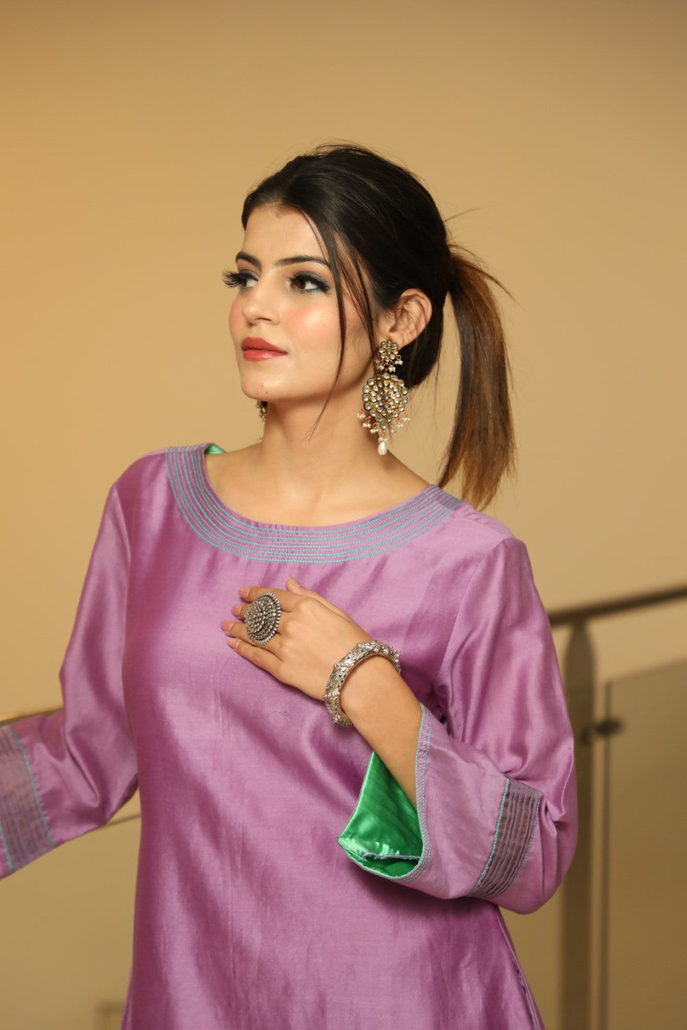 This mid-length A-line tunic is a perfect blend of sophistication and versatility, making it suitable for formal, festive, and casual settings. The boat neck design, complemented by delicate silk thread stitching at the neck and sleeves, exudes understated elegance. The 3/4th sleeves are adorned with pintuck organza inserts, adding texture and a subtle touch of luxury. Satin facing at the neck and sleeves further enhances the refined finish of the tunic.