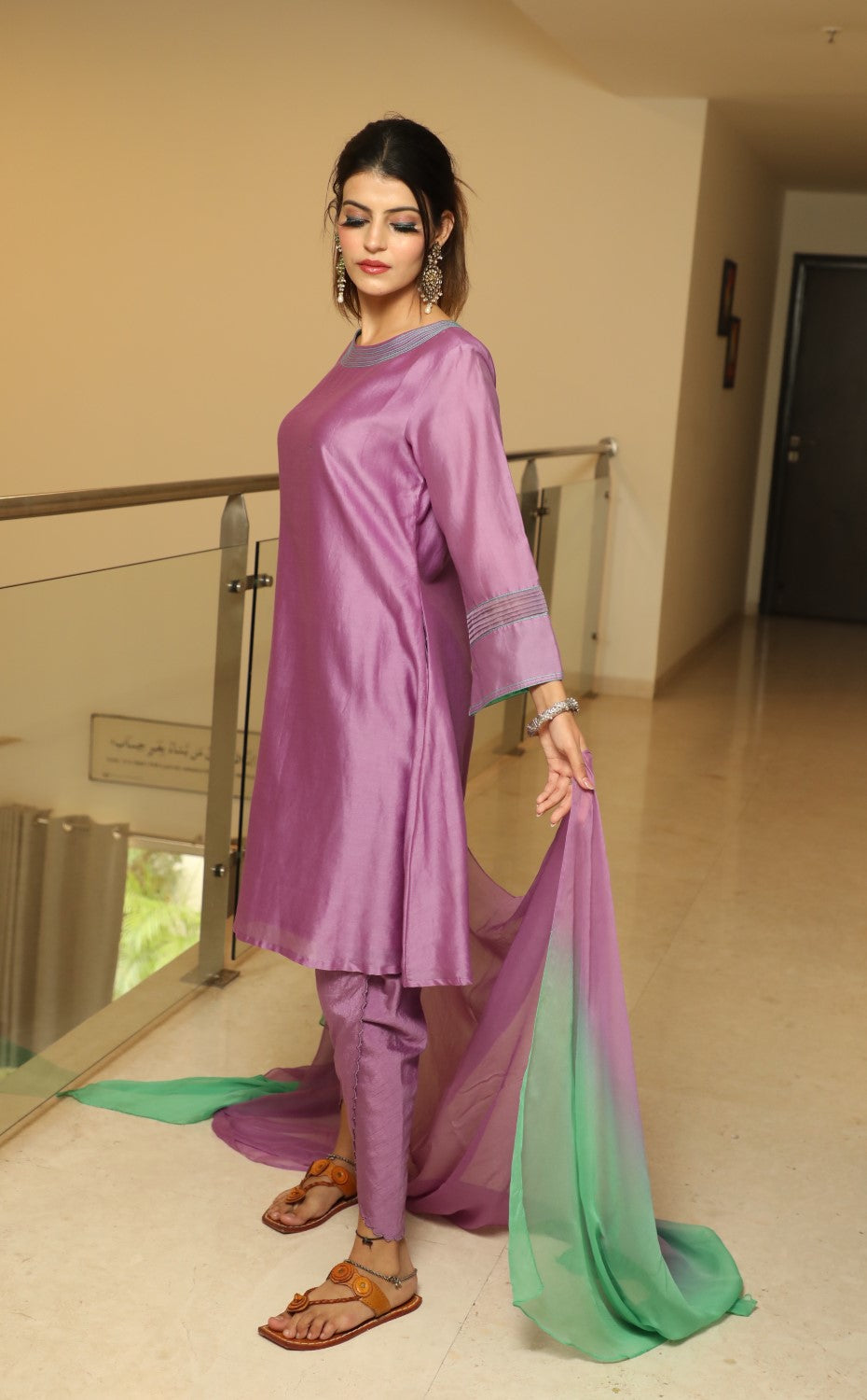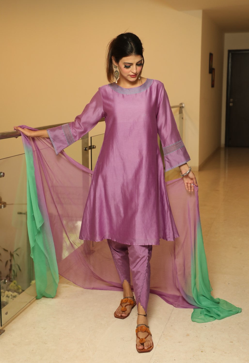 Paired with stylish dupion tulip pants, this ensemble offers a chic and comfortable silhouette. The look is completed with a three-color ombré-dyed chiffon dupatta, adding a vibrant and flowing element to the outfit. Whether you're attending a festive occasion or a casual gathering, accessorize with your favorite festive jewelry to elevate the look, making it effortlessly transition from casual elegance to festive glamour.