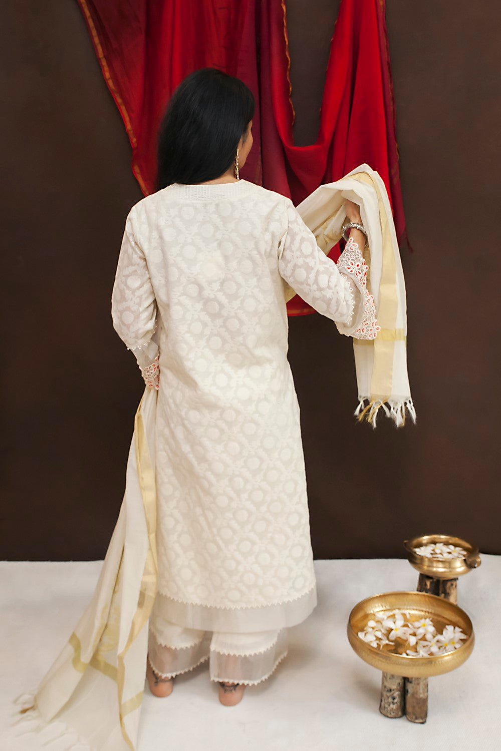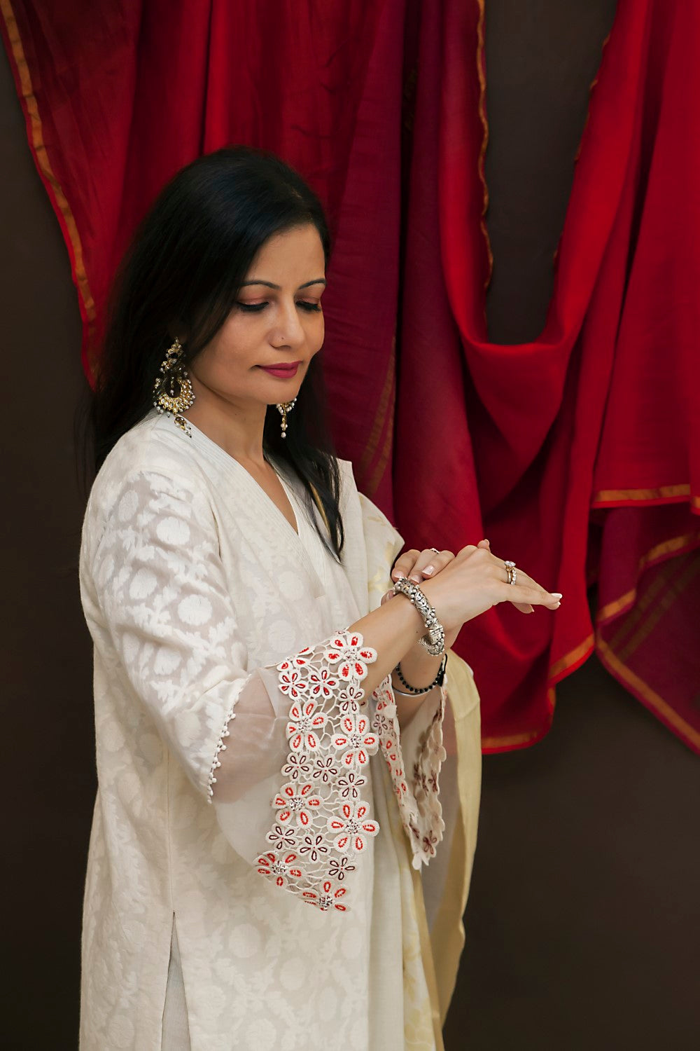 • Paired with off-white Crinkled cotton Palazzo, finished with Organza and floral lace