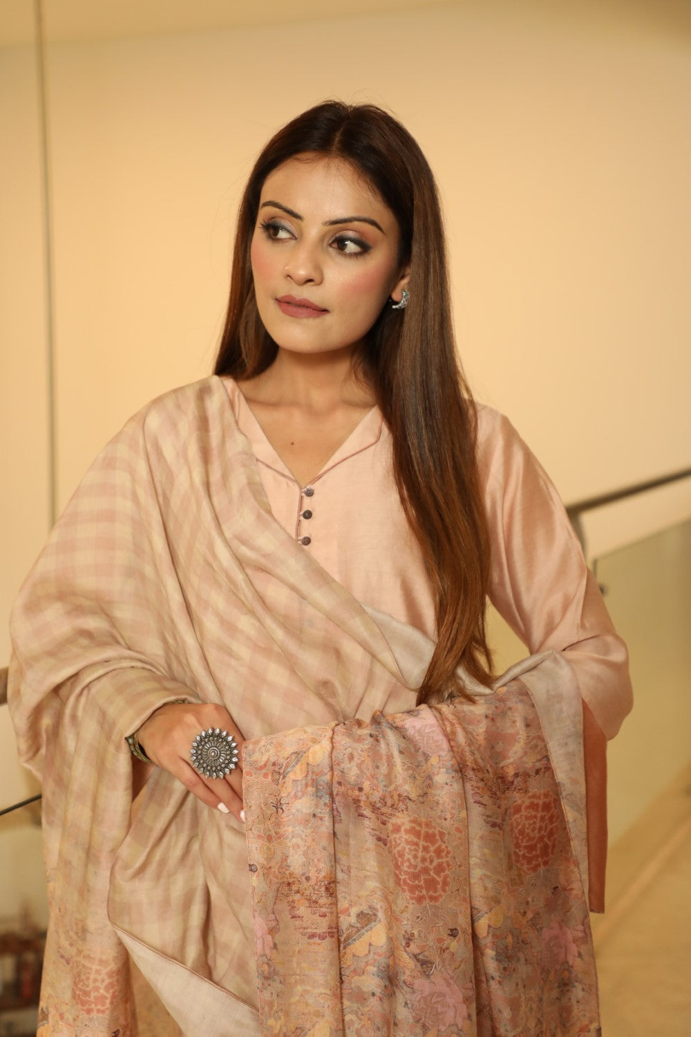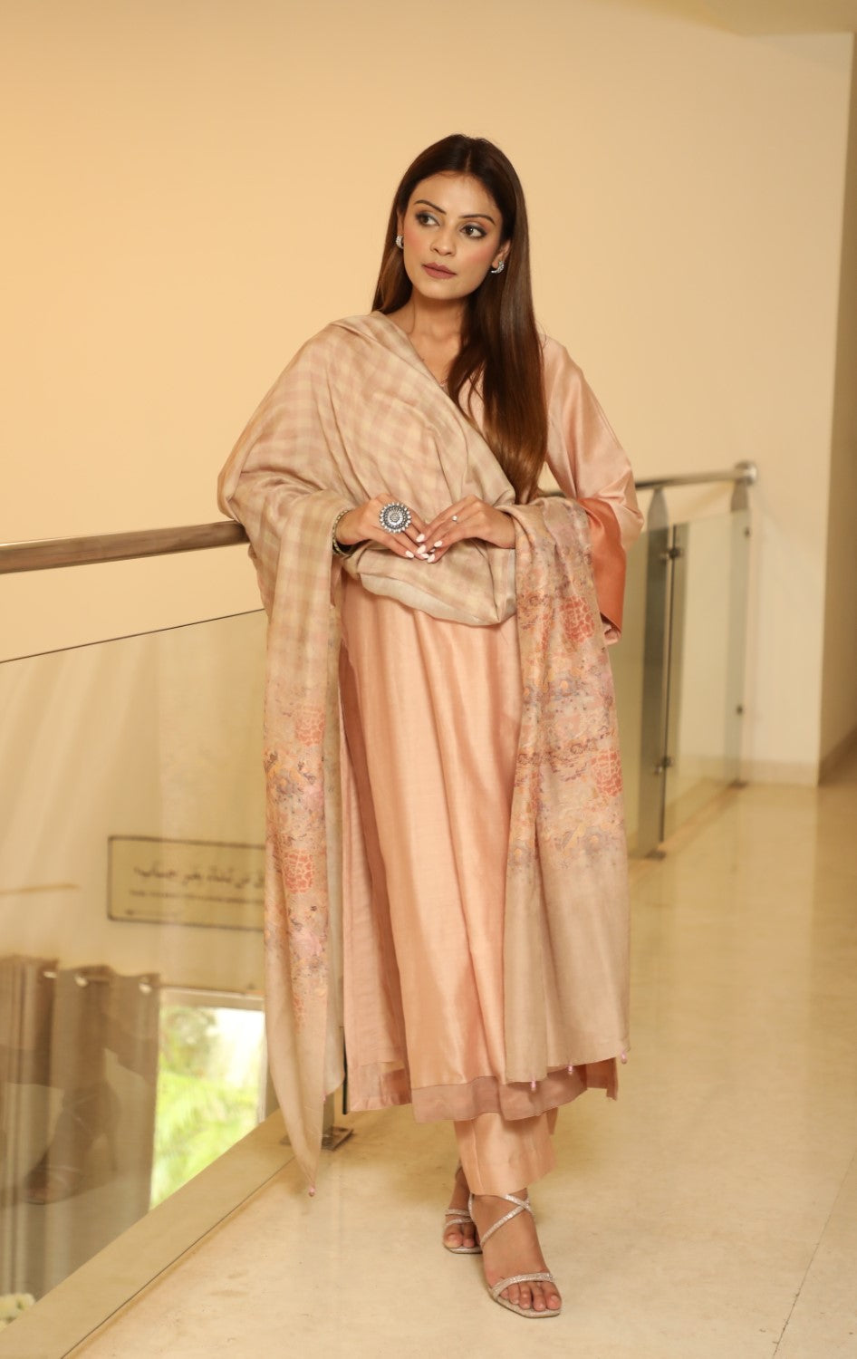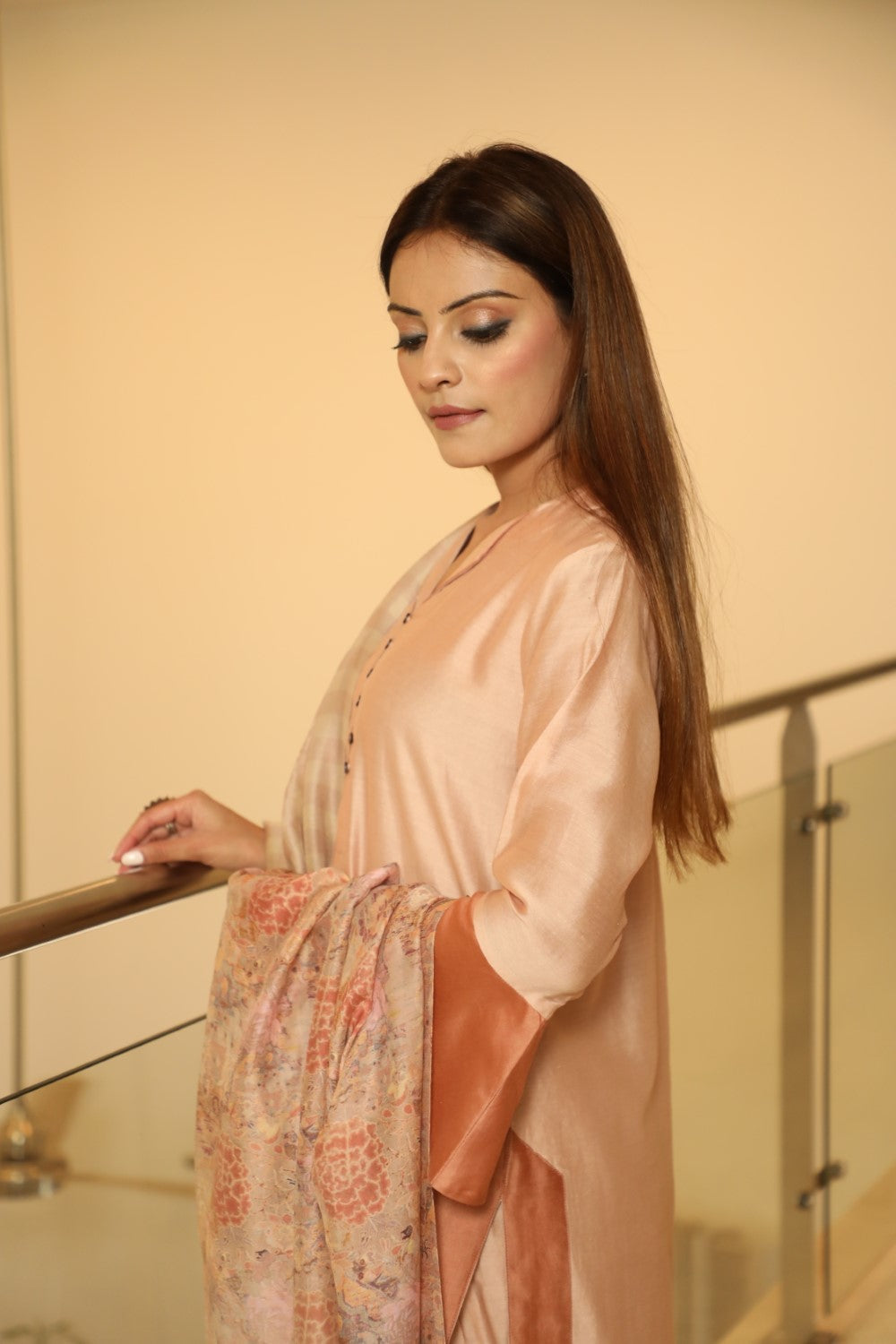 The Kurta is paired with Chanderi silk trousers, designed to match the sophistication of the top while ensuring comfort and ease of movement. Completing the ensemble is a signature printed Chanderi silk dupatta, adding an element of elegance and making it perfect for formal settings and office wear. The entire outfit is lined with soft cotton mulmul, ensuring a comfortable fit throughout the day. This ensemble is ideal for those seeking a refined and polished look for formal occasions.