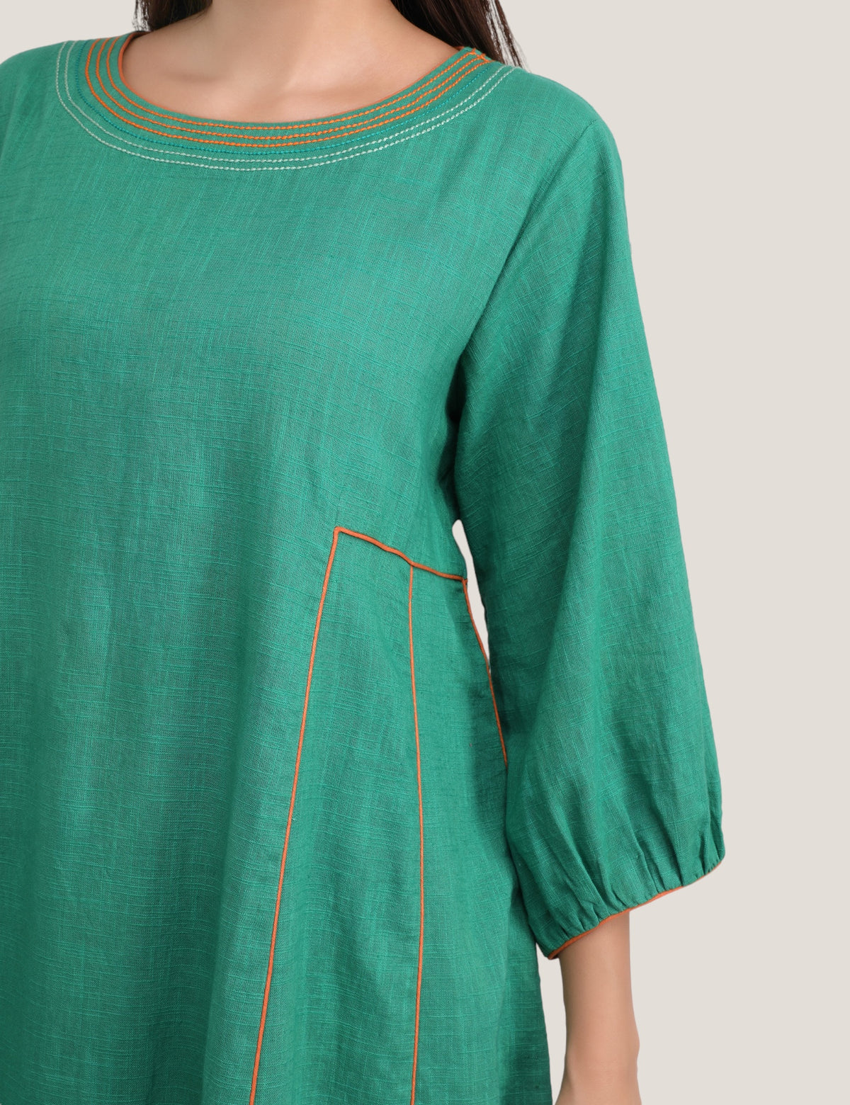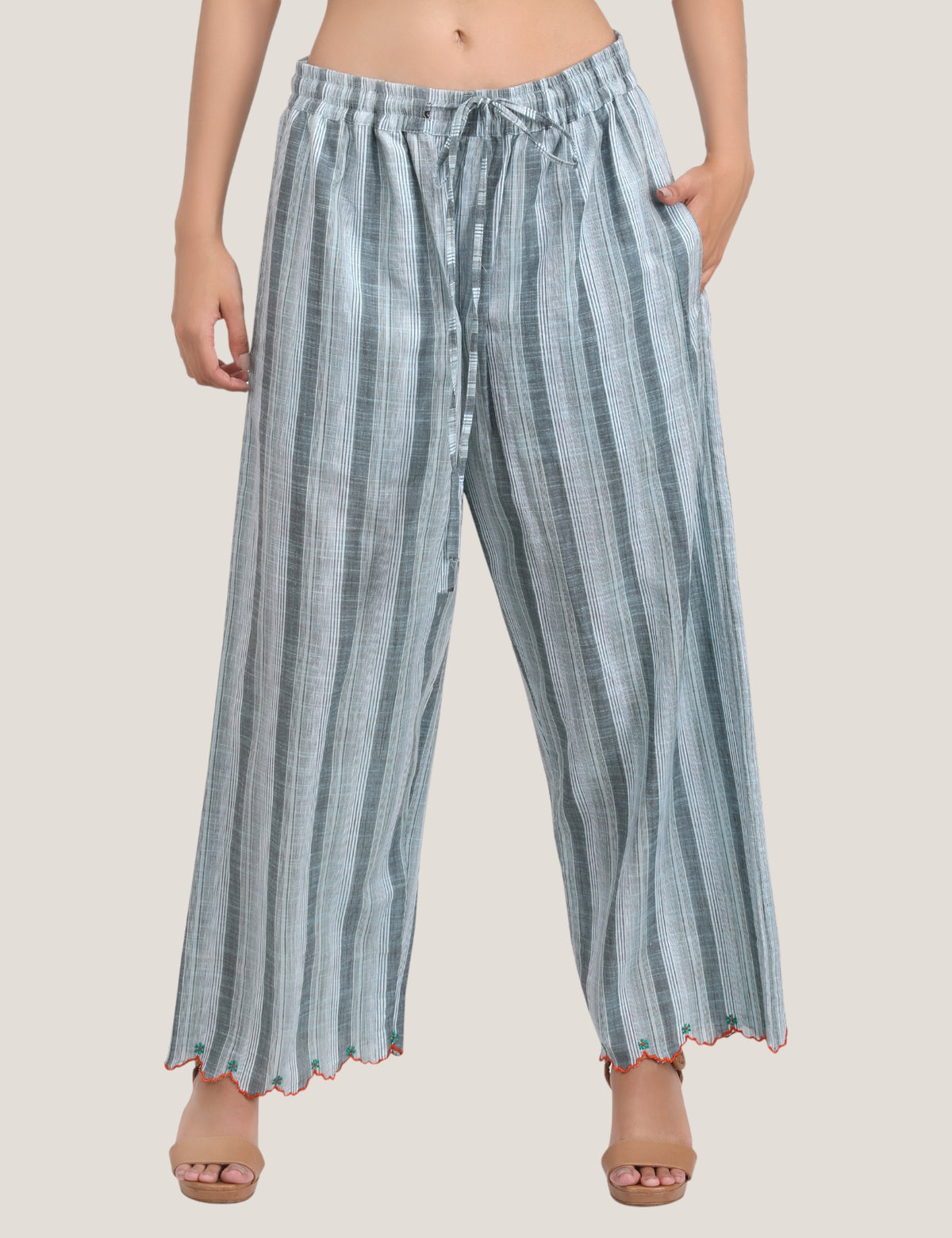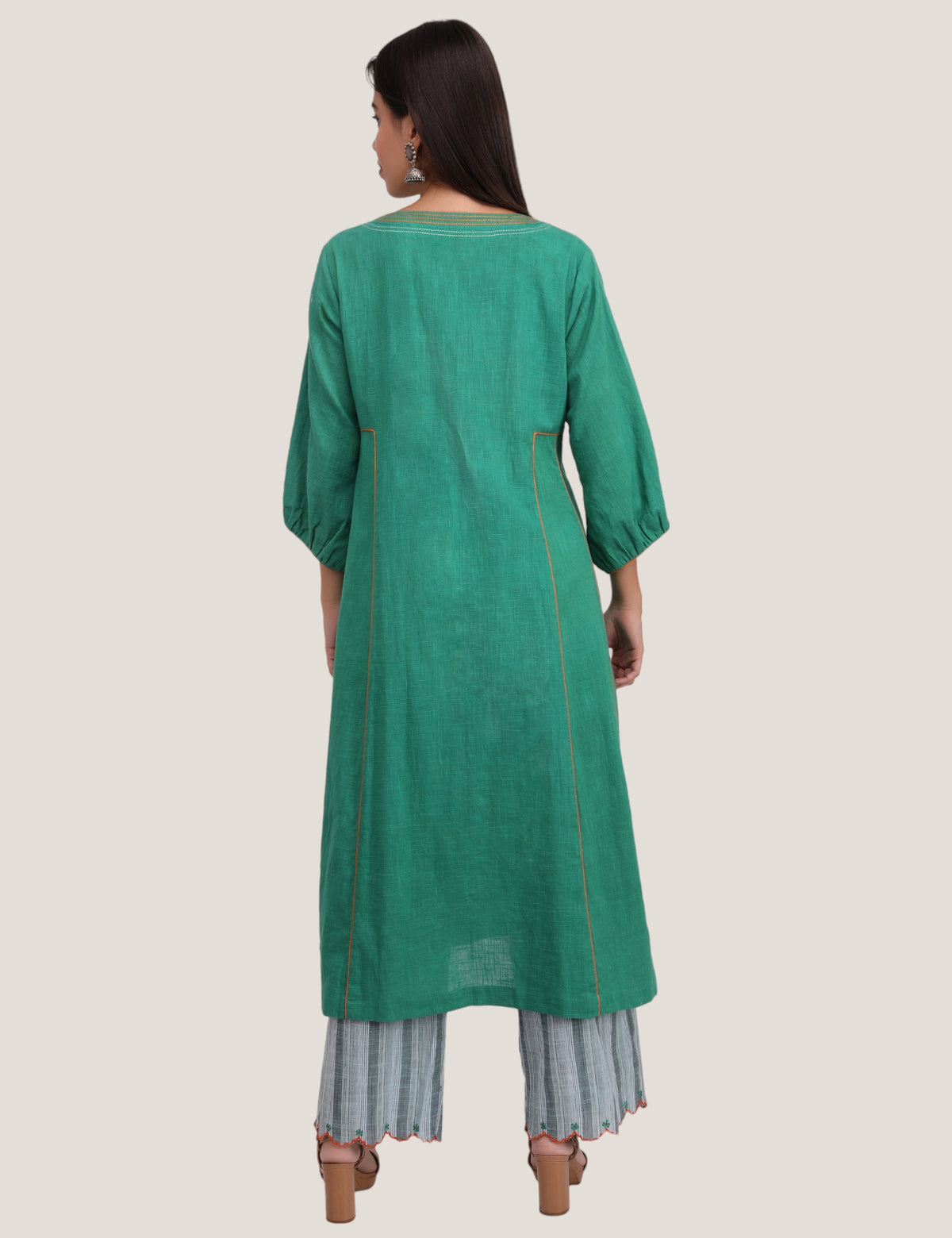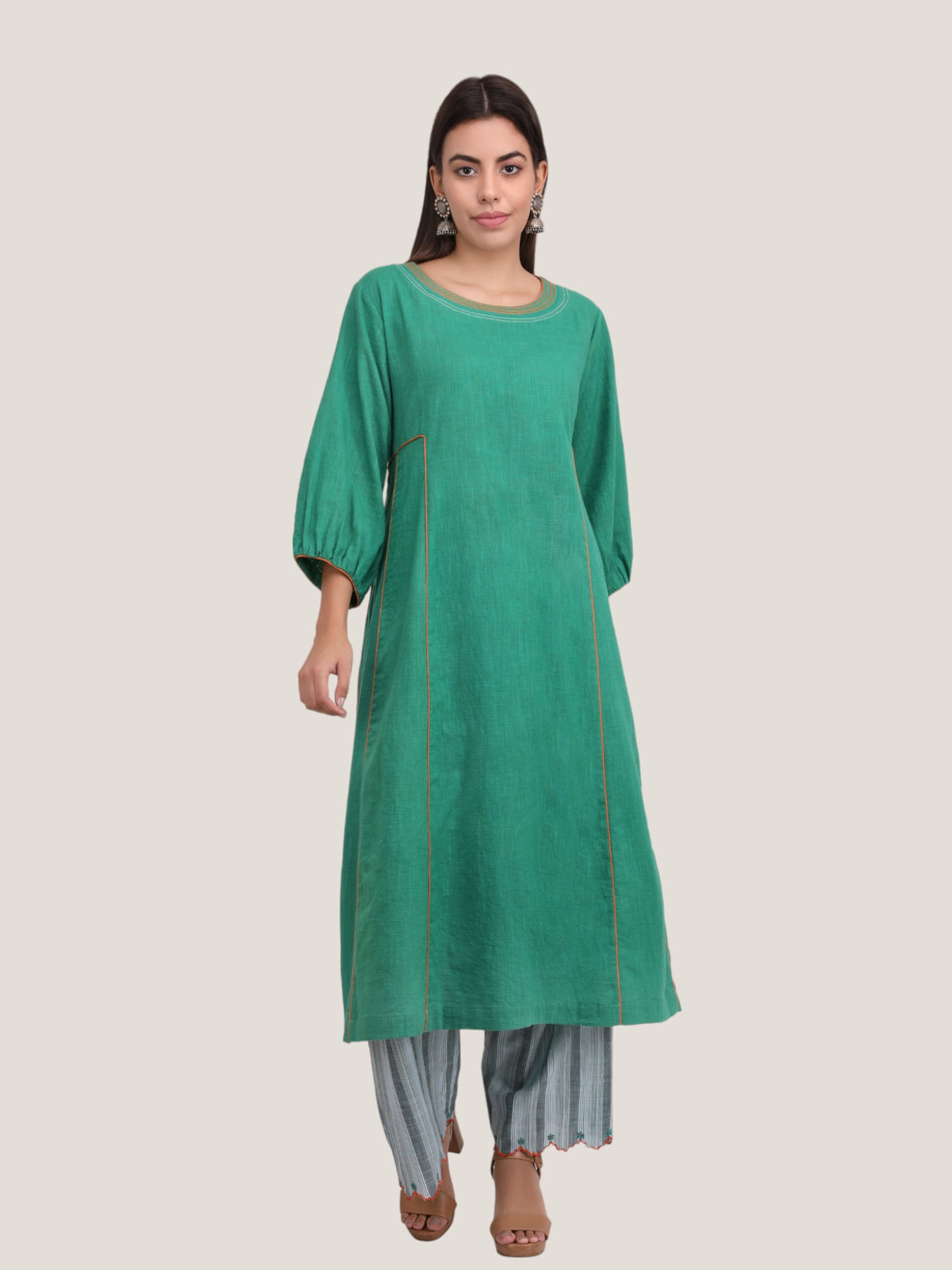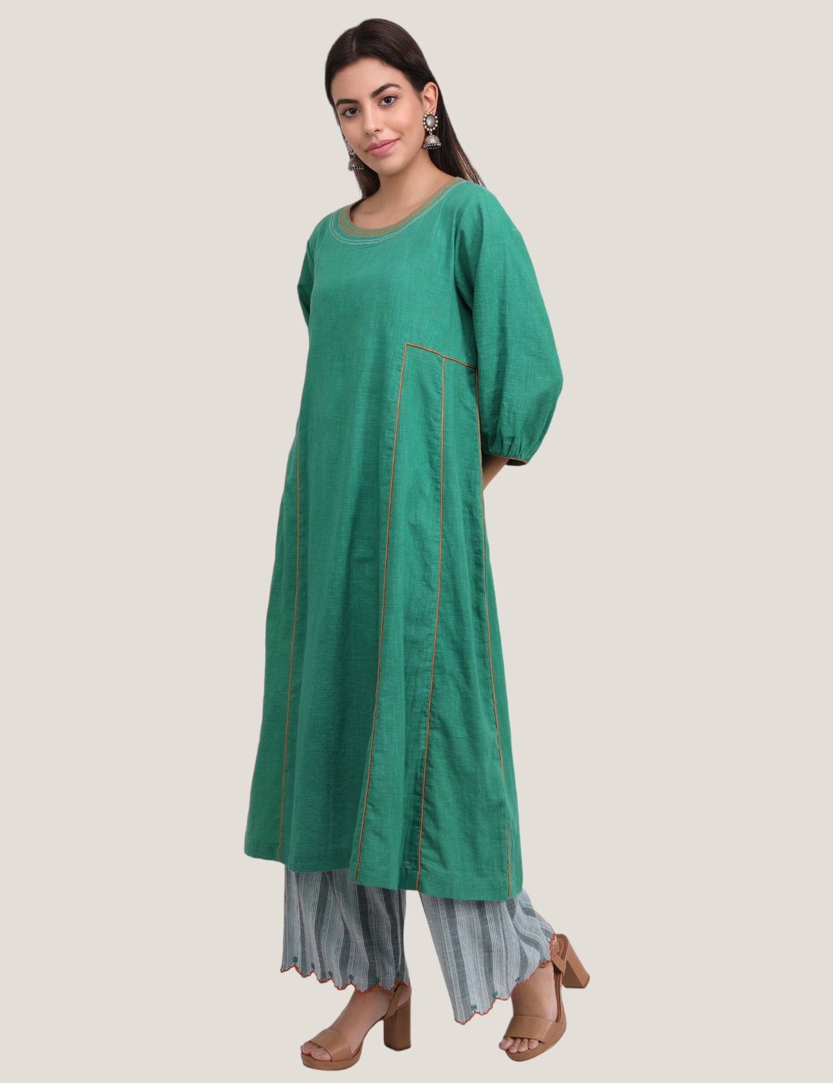 Long kurta in pure slub cotton featuring side panels Round neck accentuated with thread stitching 3/4th sleeves Contrast colour piping at the panels, sleeves and neck Paired with pure cotton striped palazzo featuring scalloped and booti at the hem Kurta length- 46" Sleeves length- 18" Palazzo length- 38" Fabric- Pure slub cotton and pure cotton Wash & Care- Handwash with mild detergent Handmade in India Note: The subtle imperfections and variations in the weave, texture, embroidery and colours are a natural outcome of a handcrafted product and not a defect.