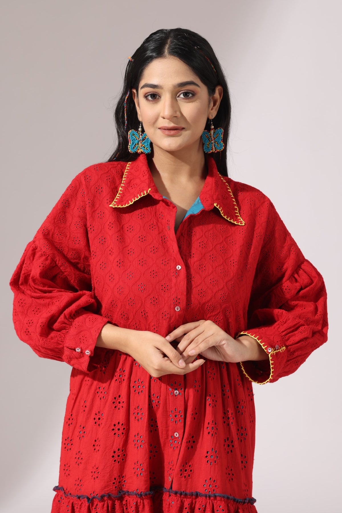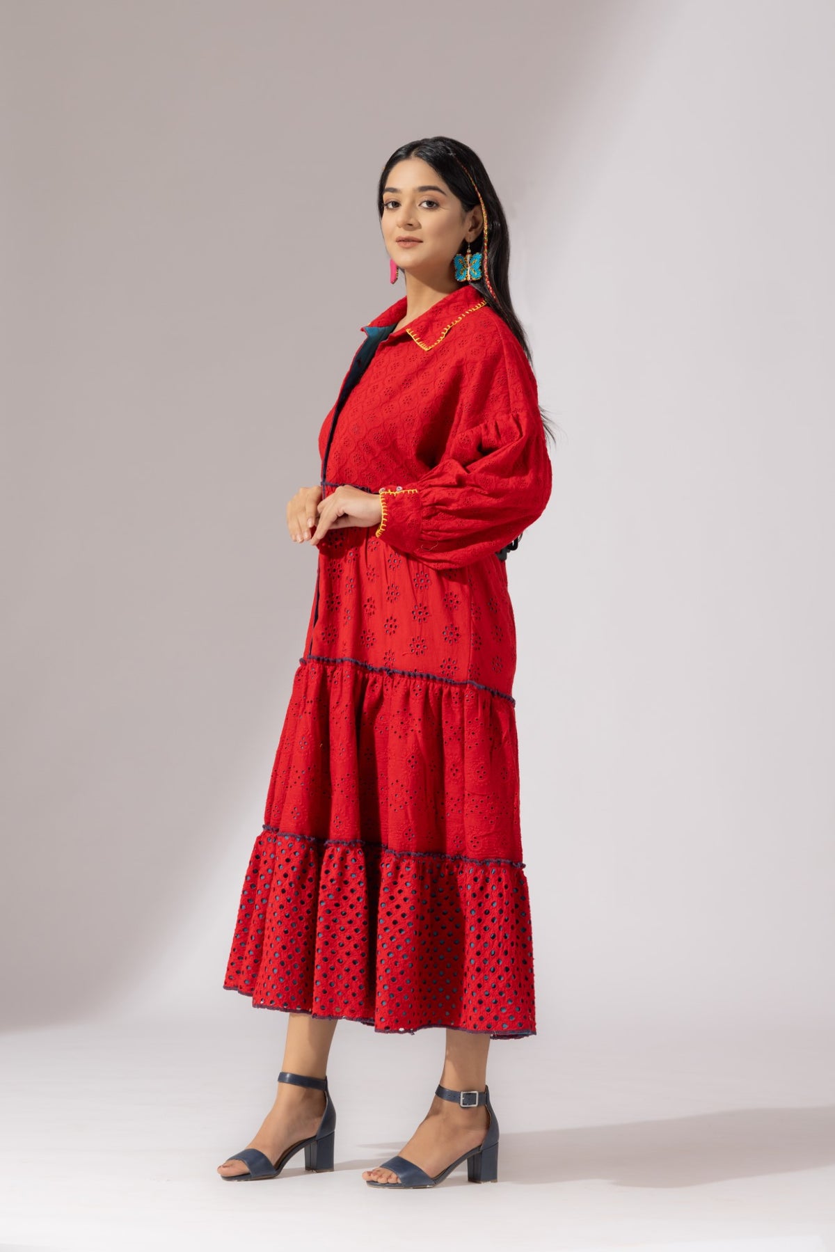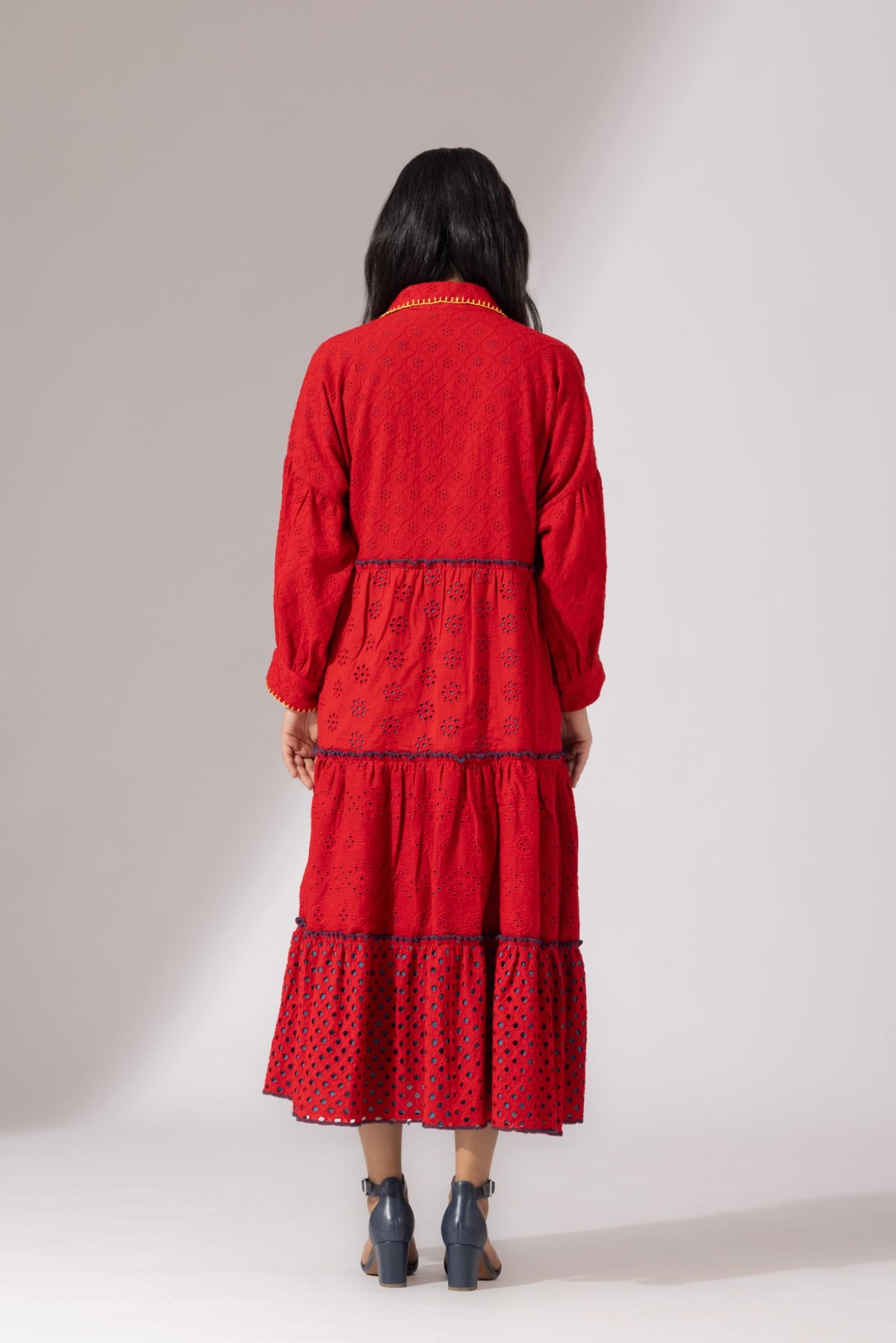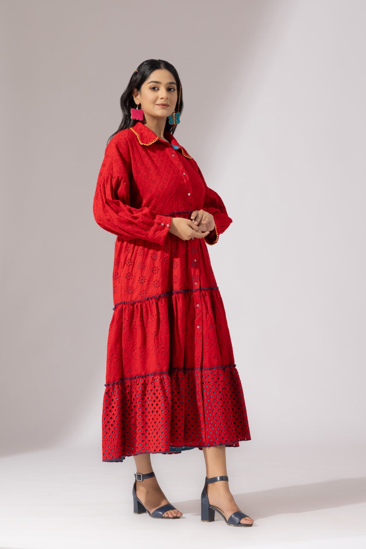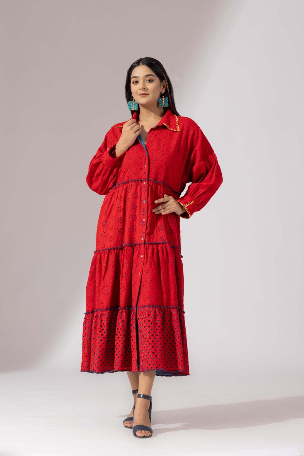 Grace meets comfort in this exquisite long tiered maxi dress, crafted in Chilli Red cotton hakooba. Featuring spread collars, drop shoulder peasant sleeves, and front snap button closures, it combines a relaxed silhouette with polished detailing. Delicate baby ruching at each tier adds soft texture, while contrast color lining and hand embroidery enhance its vibrant appeal. Perfect for casual outings or serene evenings, this dress is a timeless blend of elegance and ease.