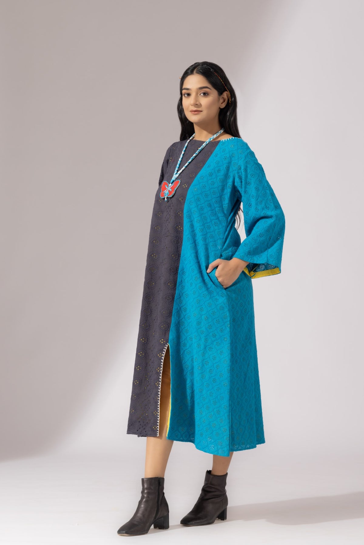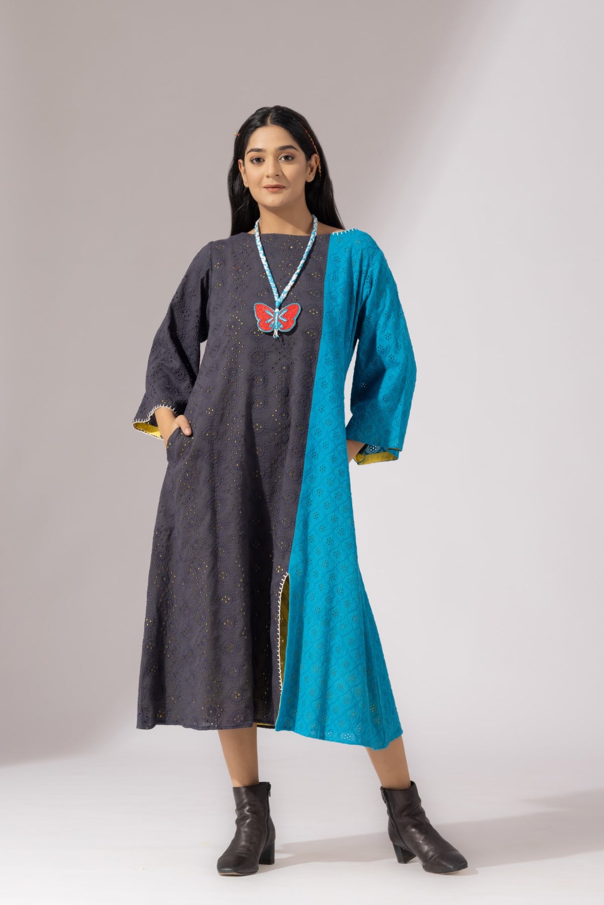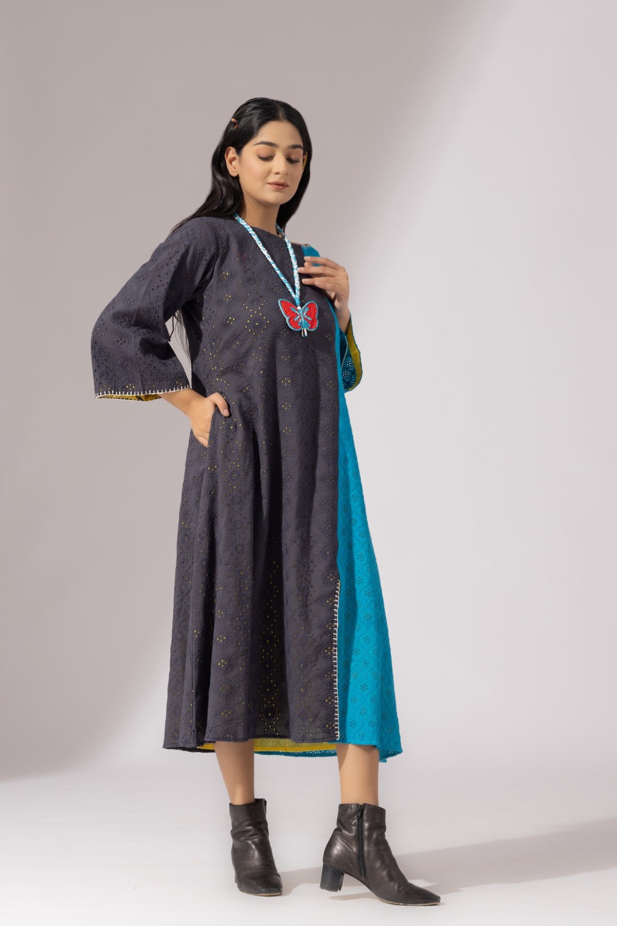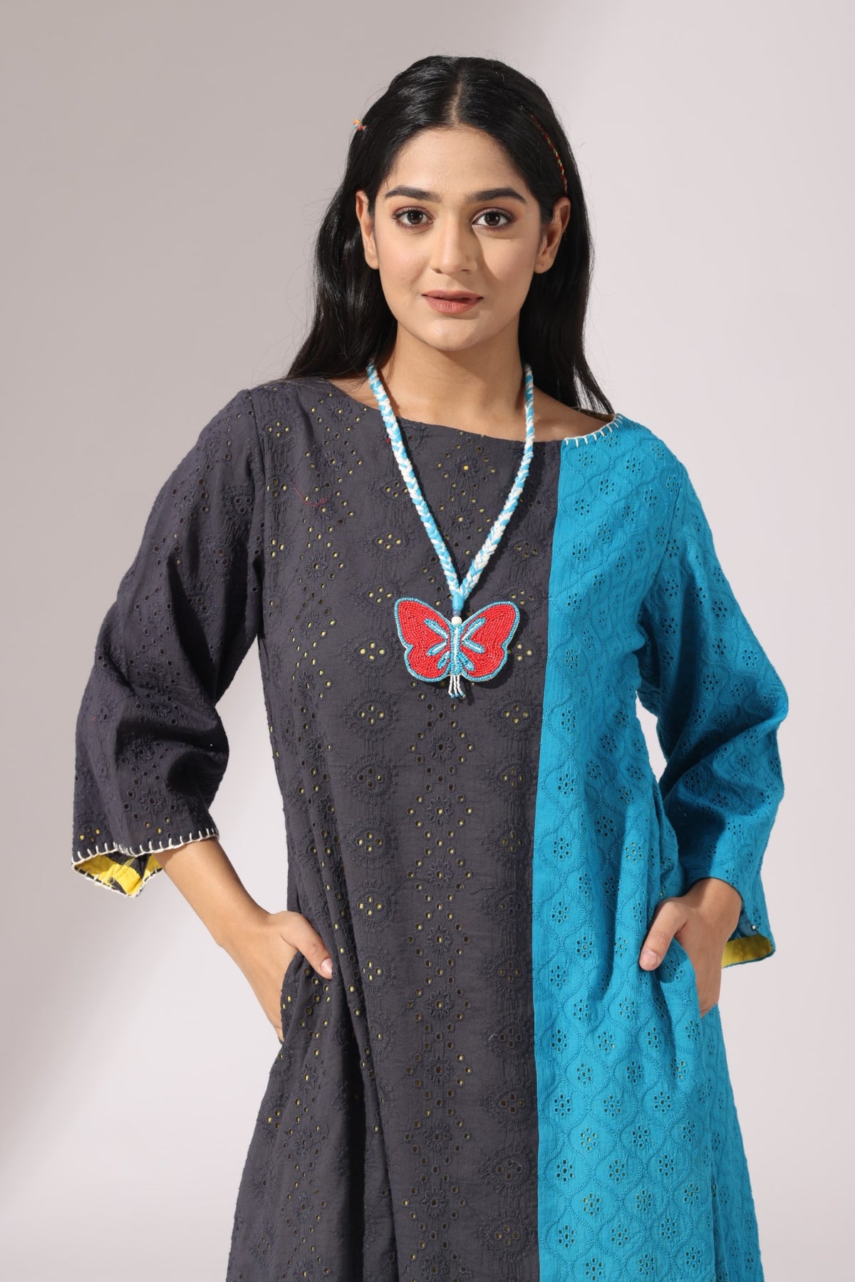 Elevate your wardrobe with this sophisticated sheath dress, crafted in dual shades of Anchor Charcoal Grey and French Blue cotton hakooba. Featuring a chic boat neck, dramatic bell sleeves, and a stylish front side slit, this dress embodies understated elegance. Hand embroidery graces the neck, sleeves, and slit, adding a touch of artisanal charm. Designed with functionality in mind, it includes side inseam pockets and a contrast color mul lining that adds a playful pop. Perfect for work or casual outings, this sheath dress is a versatile addition to any fashion-forward collection.