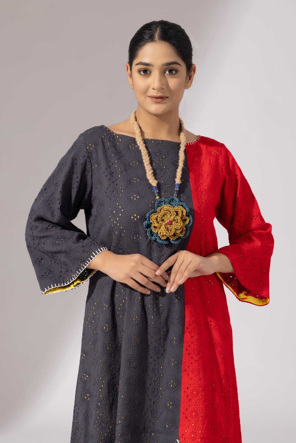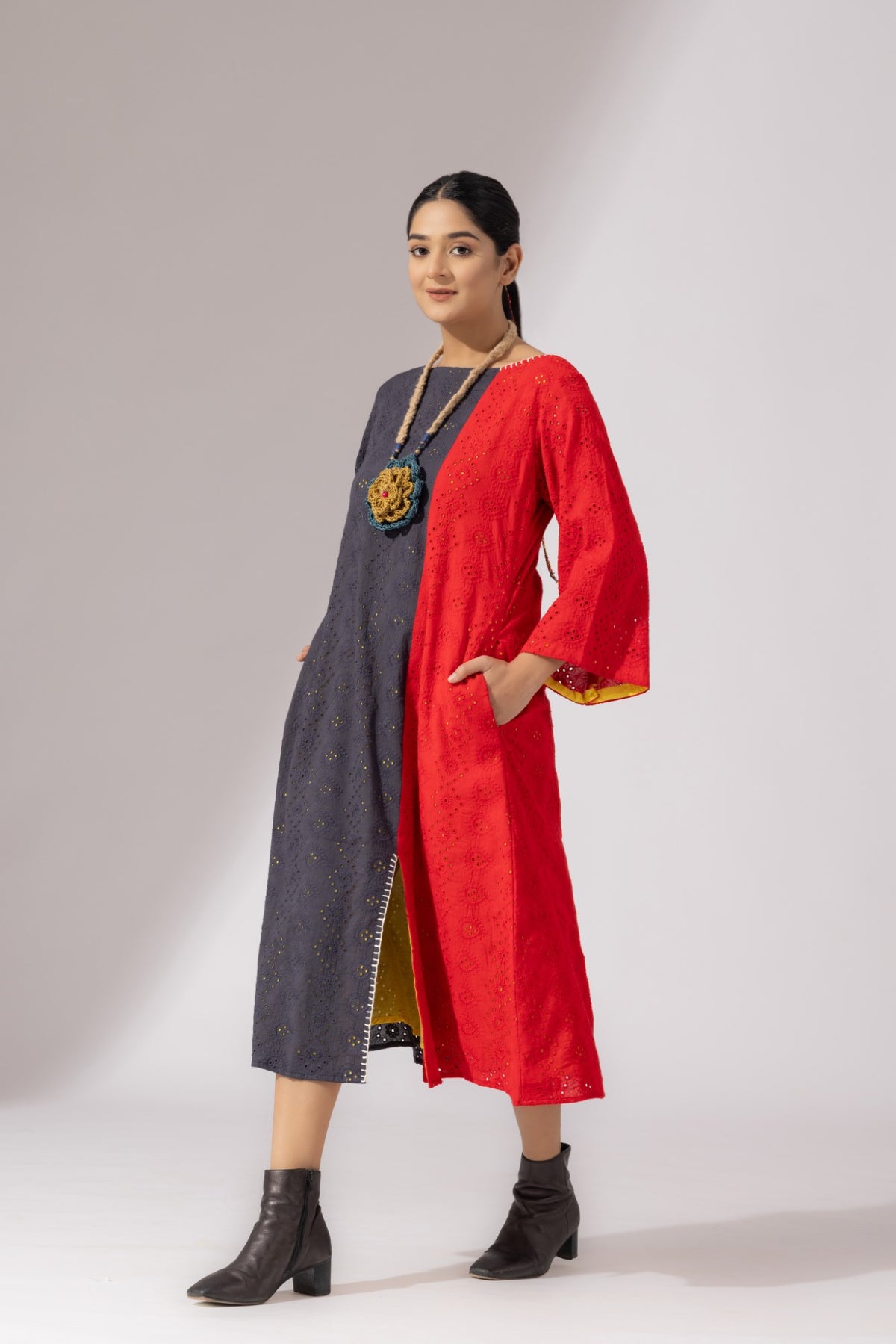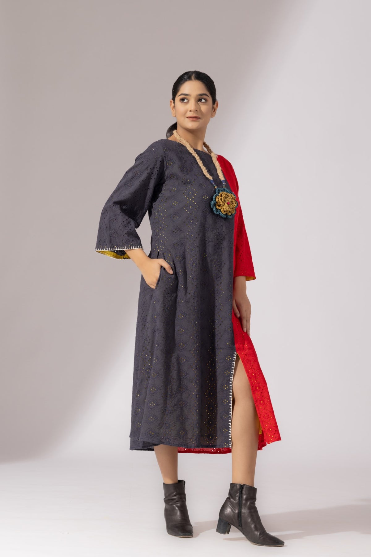 Elevate your wardrobe with this sophisticated sheath dress, crafted in dual shades of Anchor Charcoal Grey and Chilli Red cotton hakooba. Featuring a chic boat neck, dramatic bell sleeves, and a stylish front side slit, this dress embodies understated elegance. Hand embroidery graces the neck, sleeves, and slit, adding a touch of artisanal charm. Designed with functionality in mind, it includes side inseam pockets and a contrast color mul lining that adds a playful pop. Perfect for work or casual outings, this sheath dress is a versatile addition to any fashion-forward collection.
