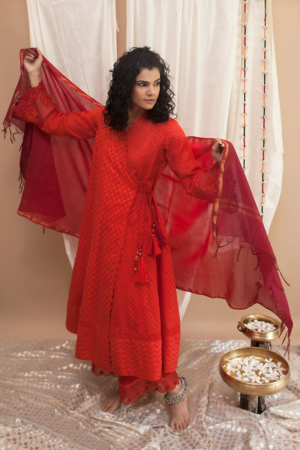 • The Angrakha features traditional silhouette, 24 panels, dori tie with tassels and lace detailing