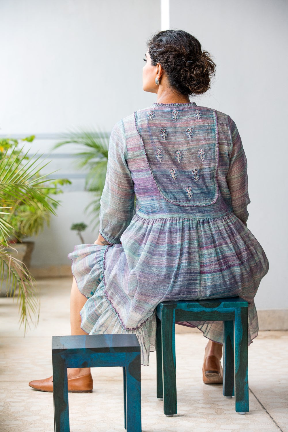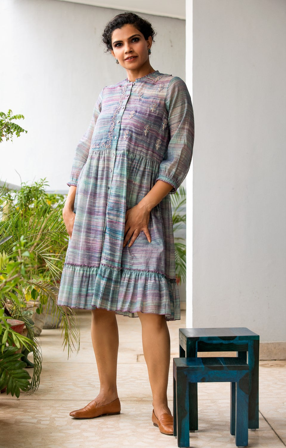 Front open, tiered dress in the shades of teal blue and violet, handcrafted in a rich and sheer texture featuring close neck, fine embroidery and romantic billowy bishop sleeves.