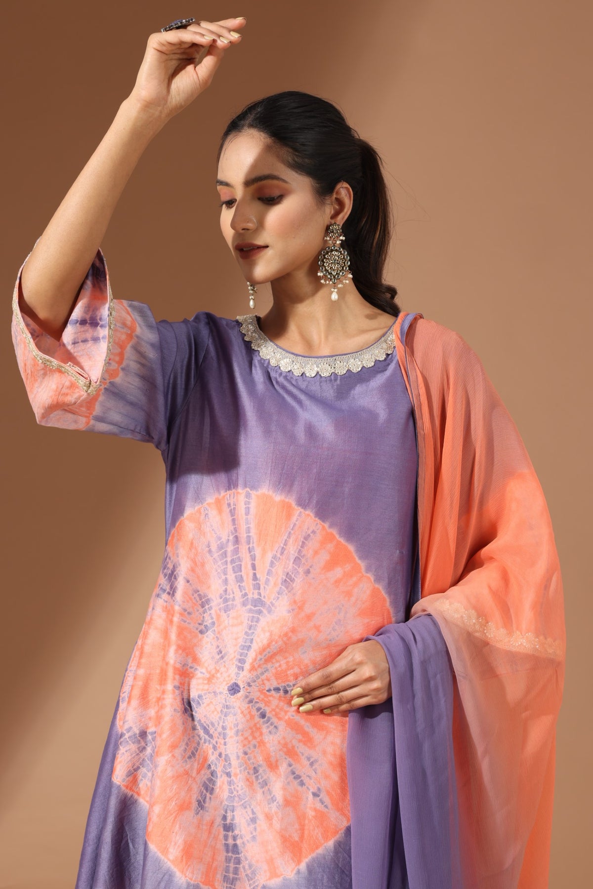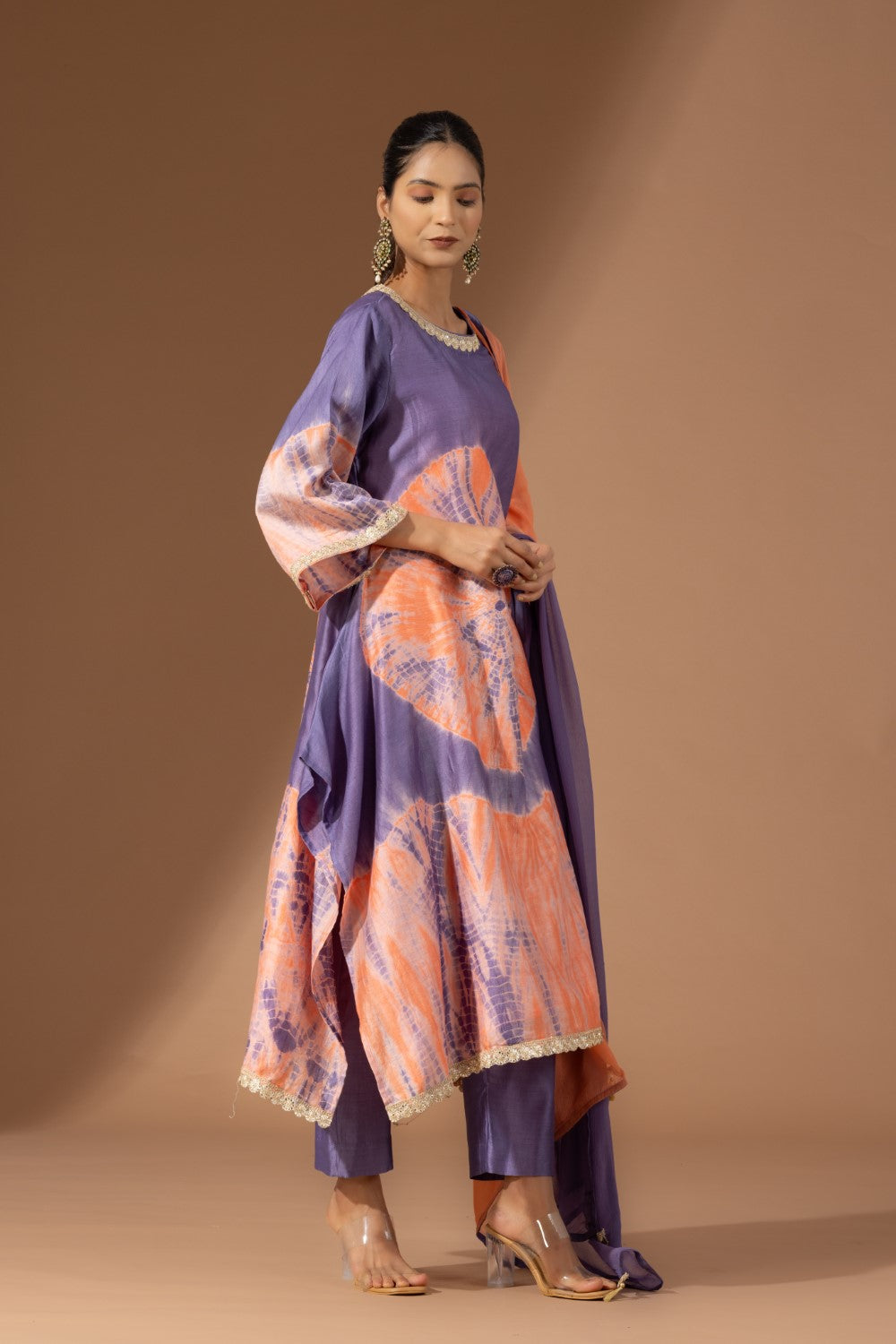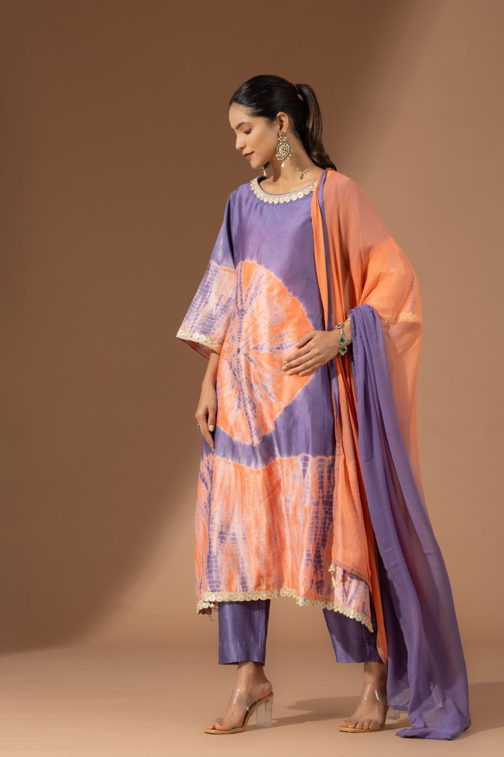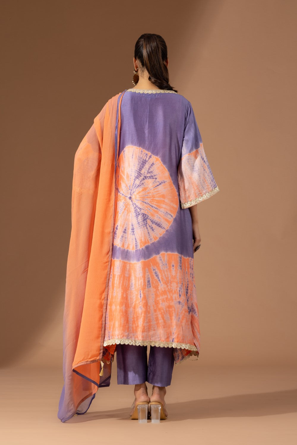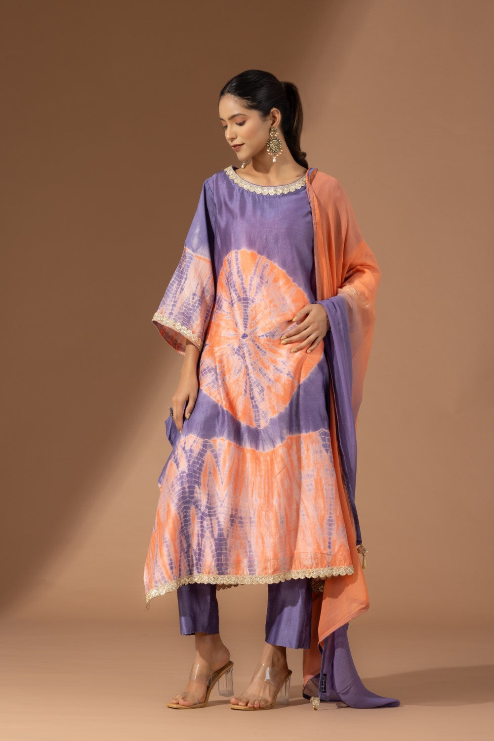 Step into elegance with our Coral Mist Kurta Set, crafted in luxurious handloom Chanderi silk. This long A-line asymmetric tunic showcases a striking hand tie-dye in hues of hot coral and English violet, creating a vibrant yet graceful look. The boat neckline and 3/4th sleeves are highlighted with delicate gota embellishments on the neck, sleeves, and hem for a subtle festive touch. Paired with straight-cut trousers and an ombre-dyed chiffon dupatta finished with tassels, this fully cotton mulmul lined ensemble beautifully blends tradition with contemporary charm — making it perfect for festive gatherings, intimate celebrations, or refined day-to-evening wear.