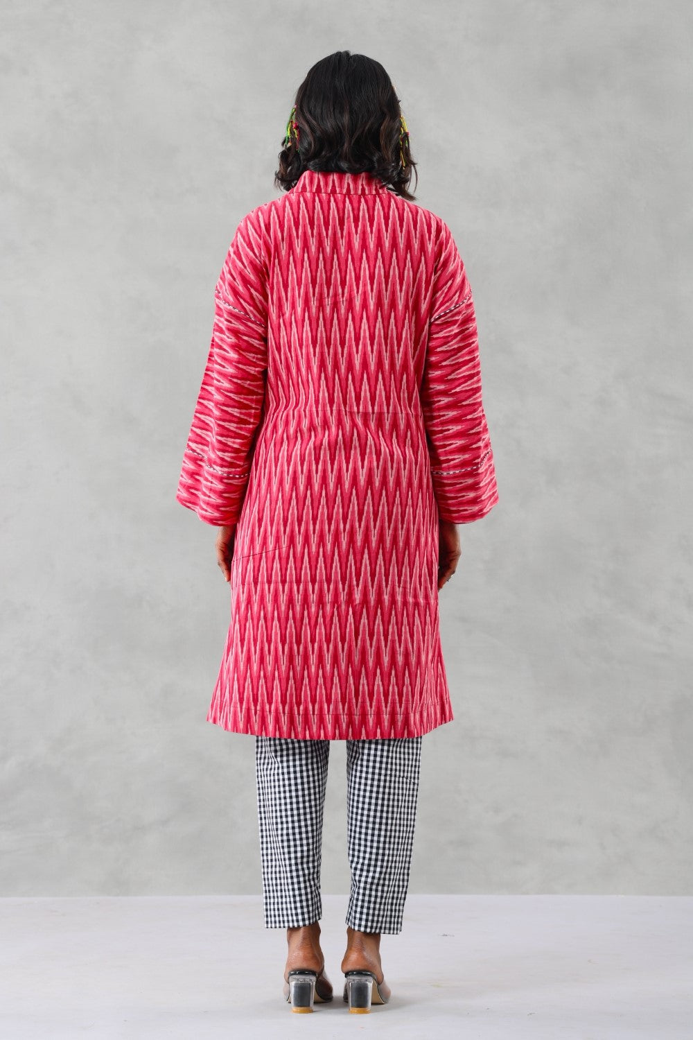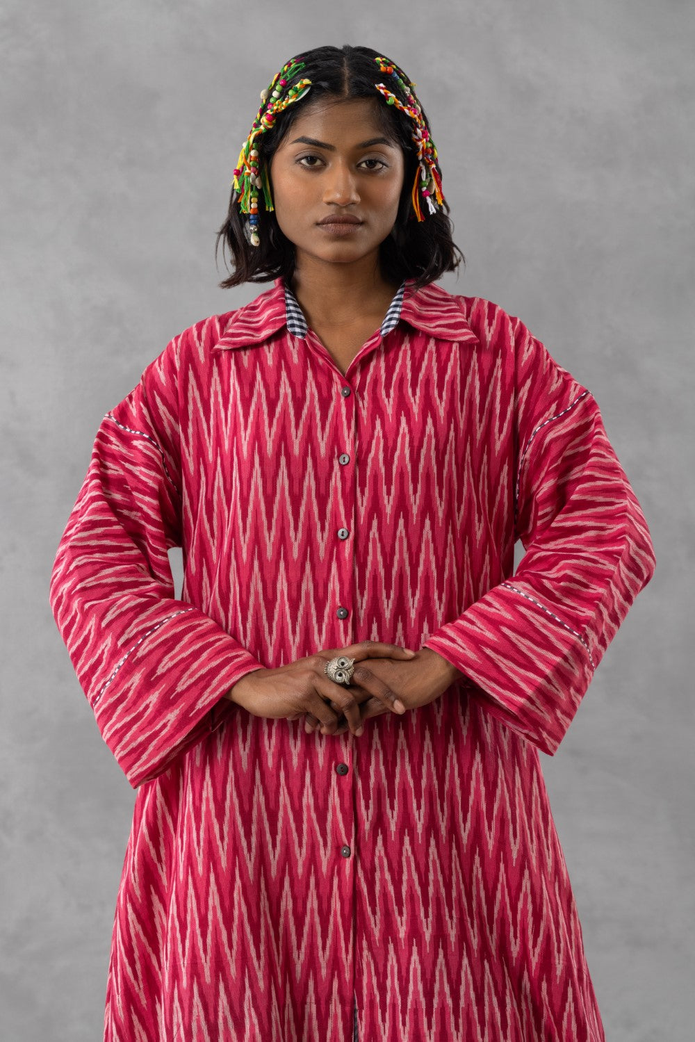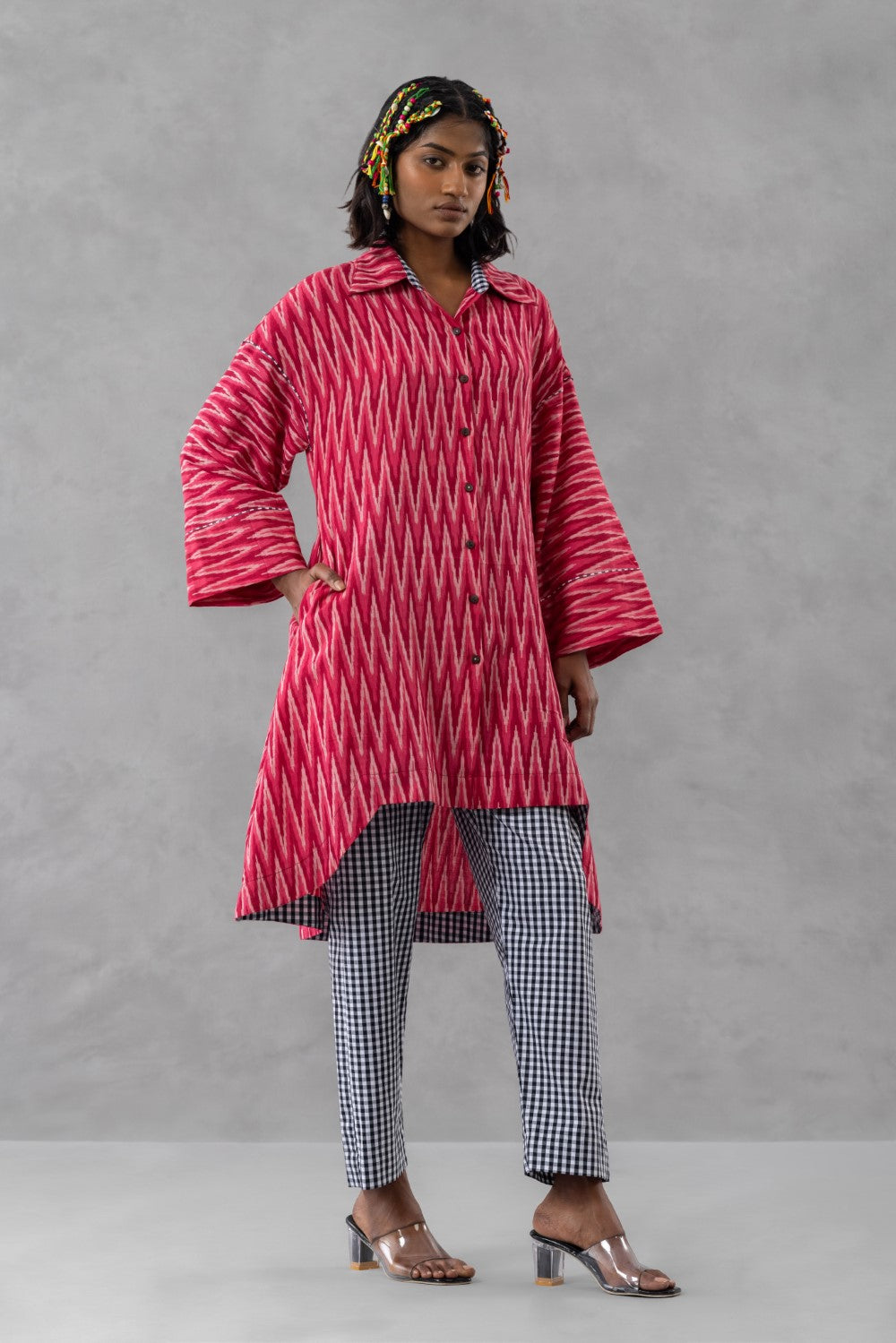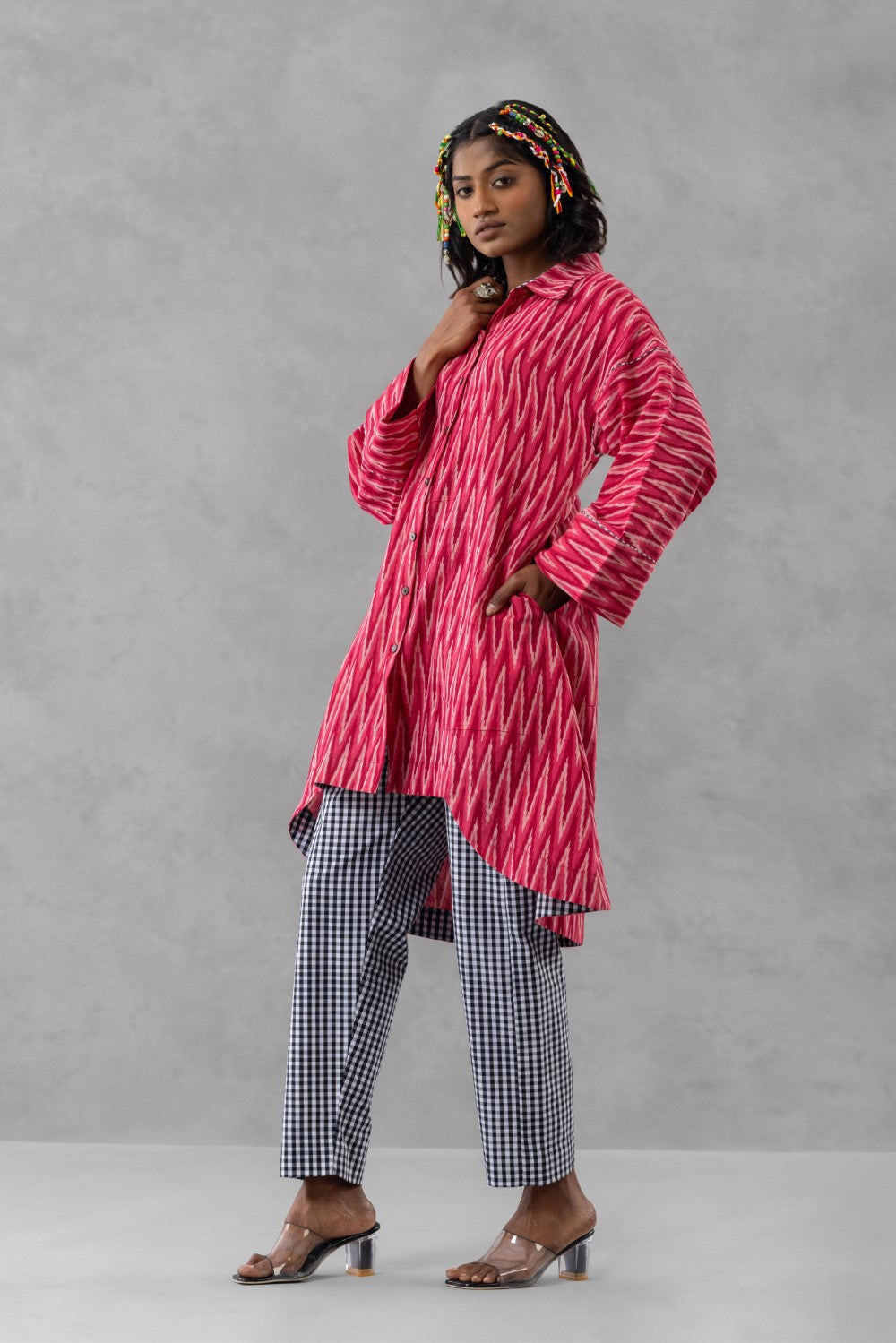 A contemporary take on handcrafted dressing, the Ikat Edge Coord Set pairs a high-low tunic in handloom Ikat cotton with classic cotton check trousers. The tunic features a relaxed silhouette with a collared neckline, front-open coconut button closures, and dropped shoulders for an effortless fit.