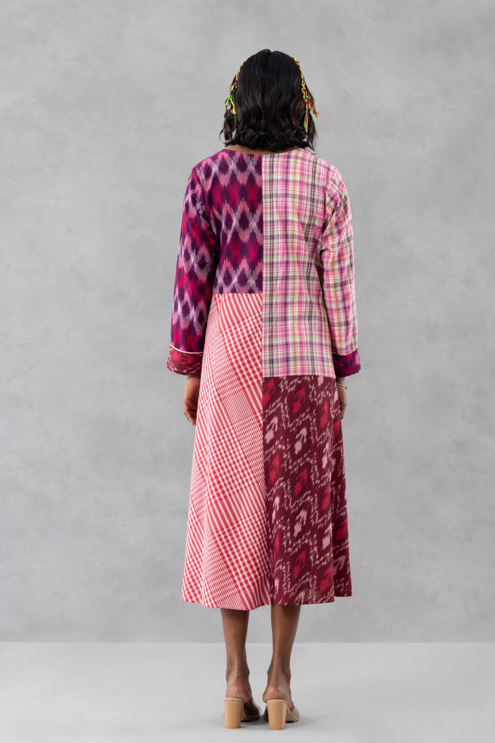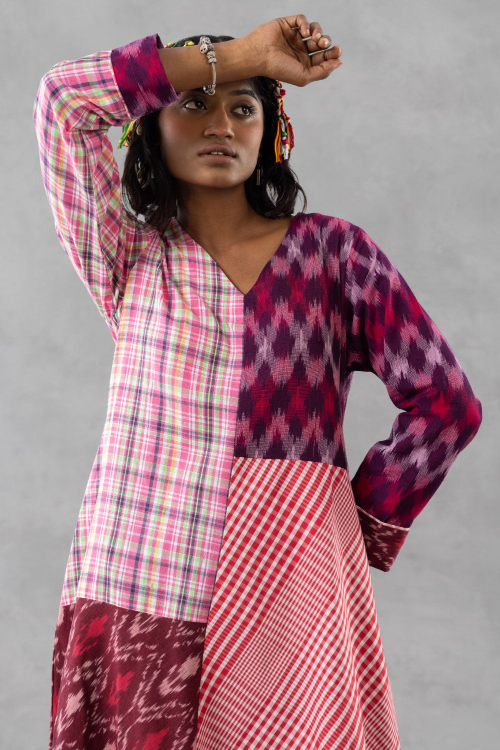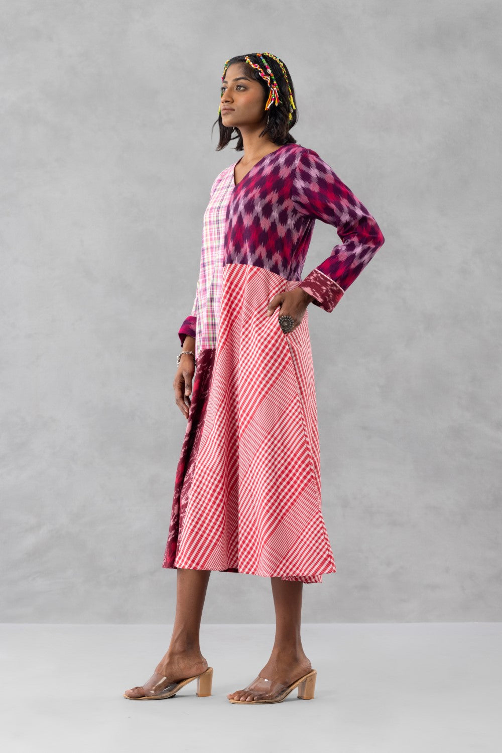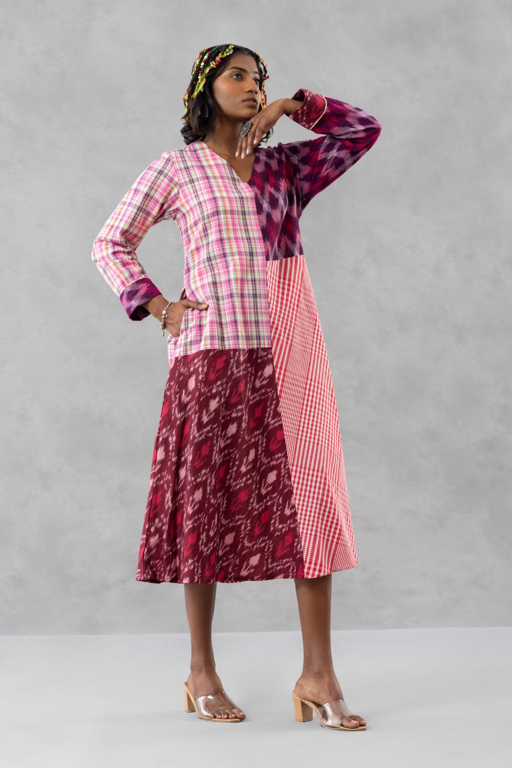 The panelled construction highlights the contrast of maroon Ikat with red and pink checks, creating a look that is both bold and balanced. Complete with functional side pockets, this dress blends artisanal detail with everyday ease—perfect for making a quiet yet confident statement.