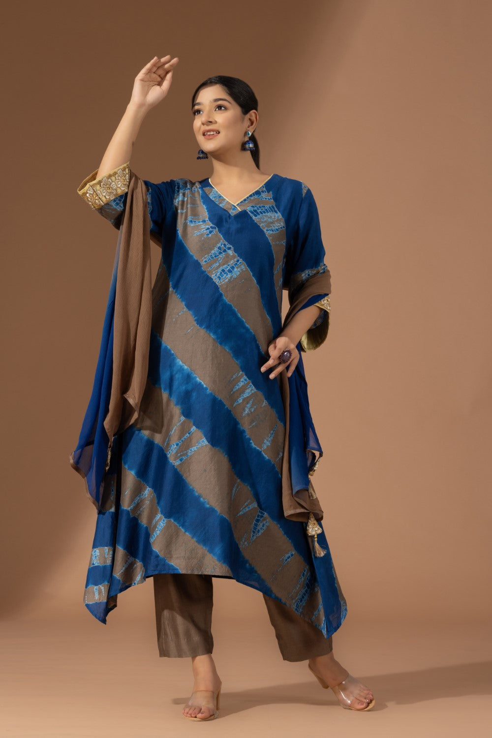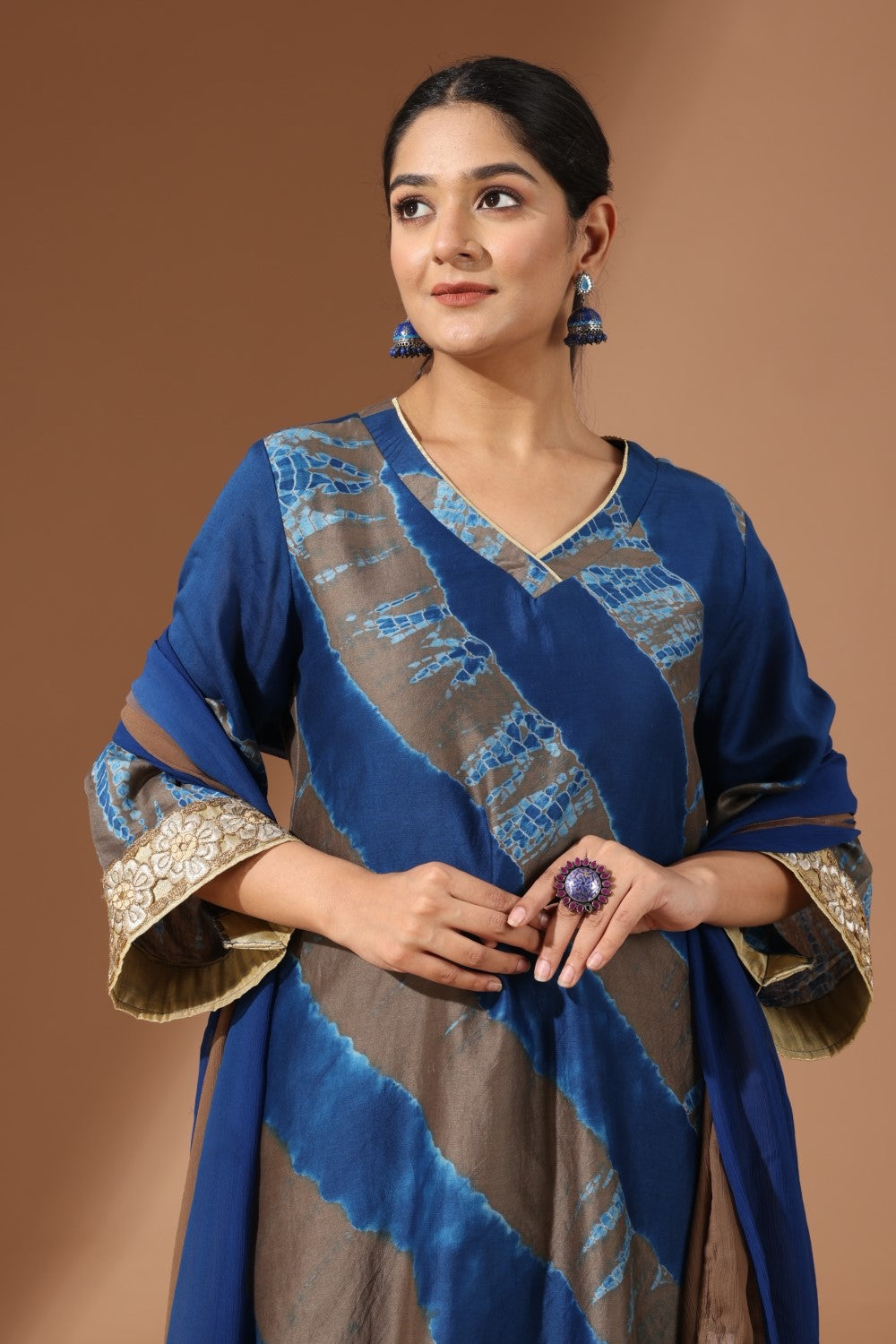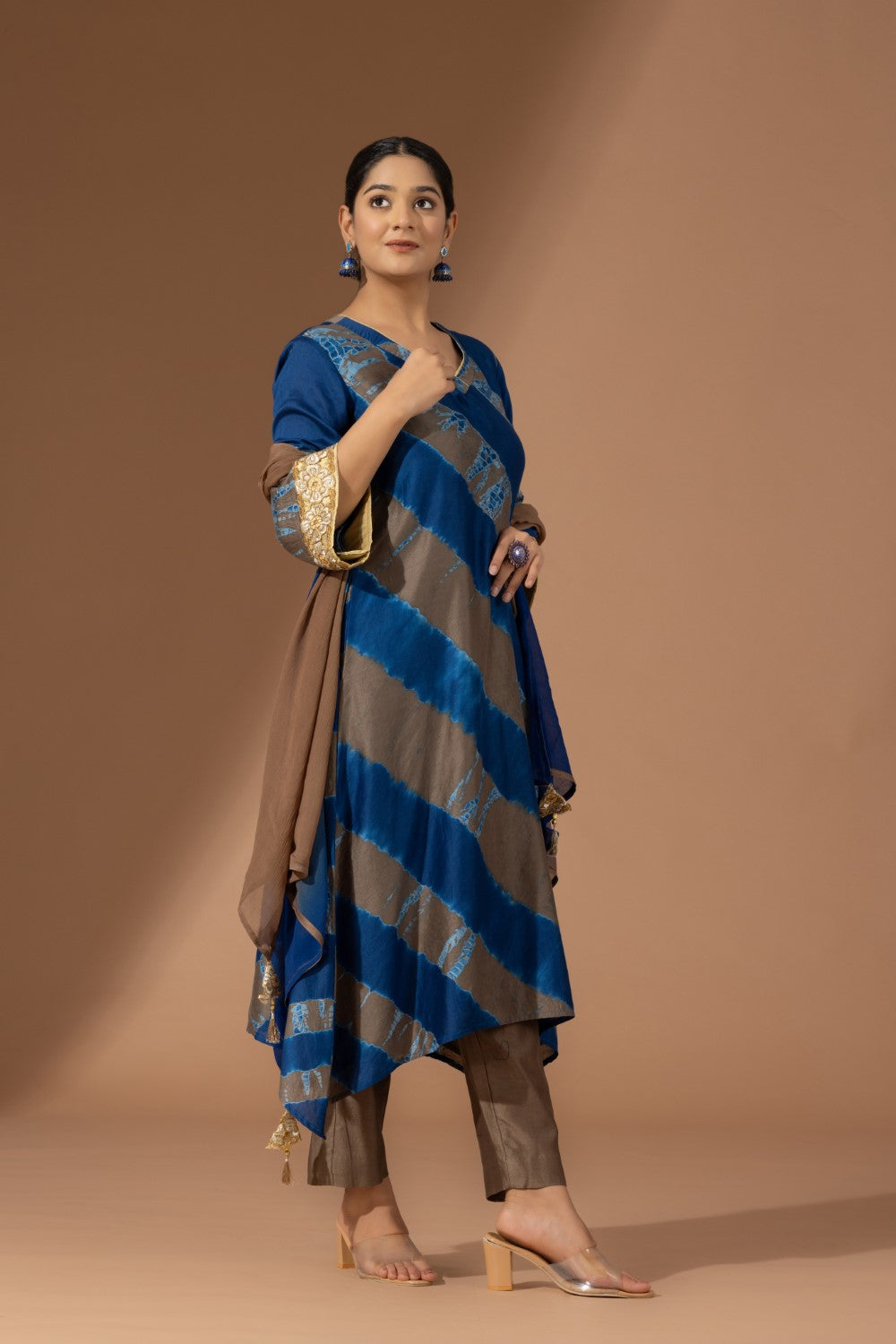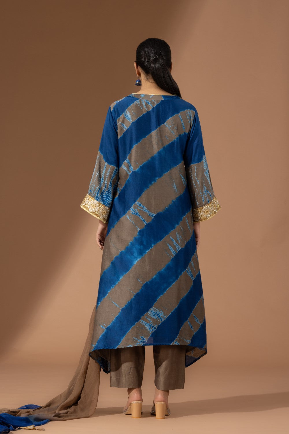Elevate your festive and formal wardrobe with our Midnight Taupe Kurta Set, crafted in luxurious handloom Chanderi silk. This long A-line tunic features a hand tie-dye in refined shades of taupe and midnight blue, creating a bold yet graceful contrast. The design is enhanced with an asymmetric hemline, a jewel neckline with subtle tissue detailing, and 3/4th sleeves accentuated with delicate gota work. Thoughtfully designed with side inseam pockets for modern functionality, it is paired with sleek trousers and an ombre-dyed chiffon dupatta finished with handmade tassels. A perfect blend of tradition and contemporary flair, this fully cotton mulmul lined ensemble is versatile for both festive occasions and elegant evening gatherings.