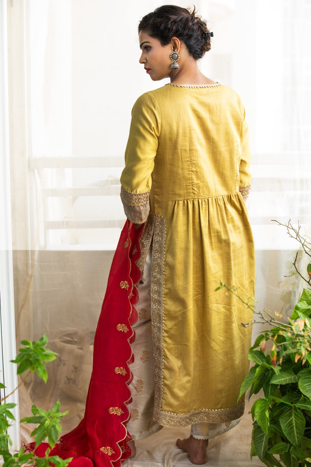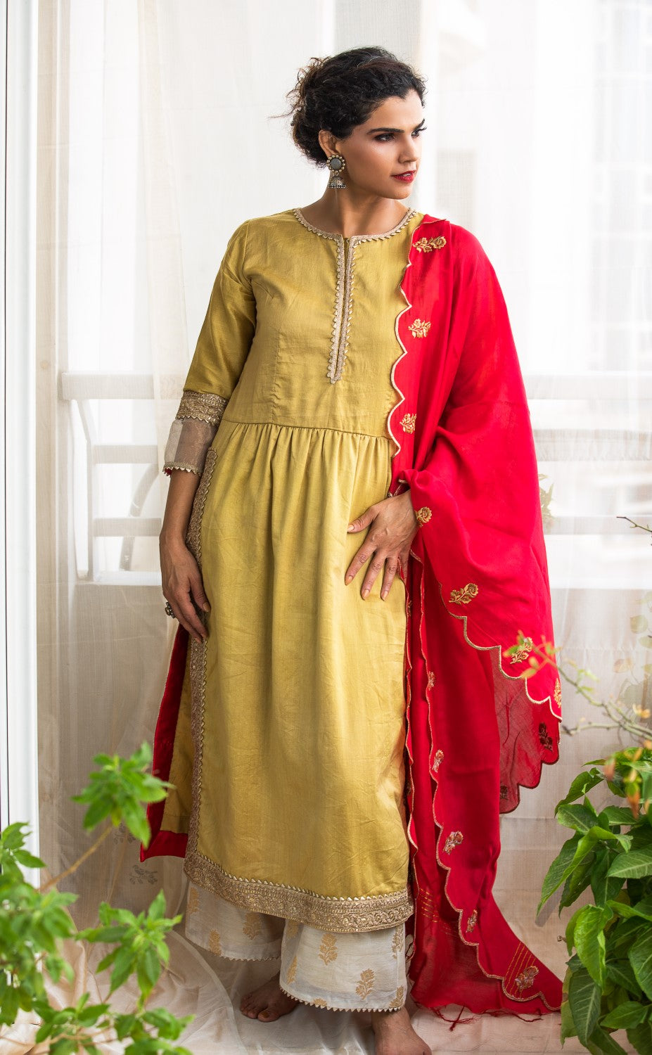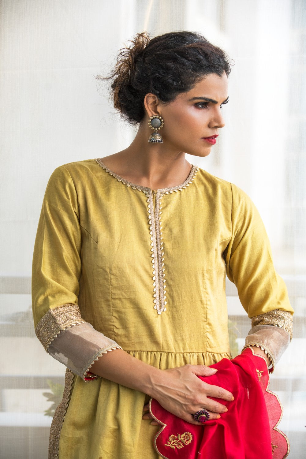 • Long tunic featuring gathers at the body and high slits with gota detailing.