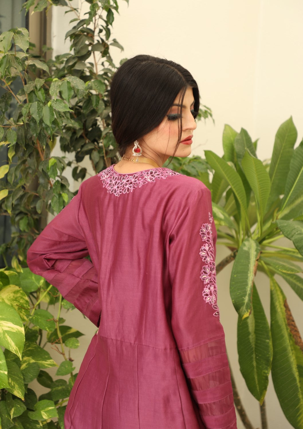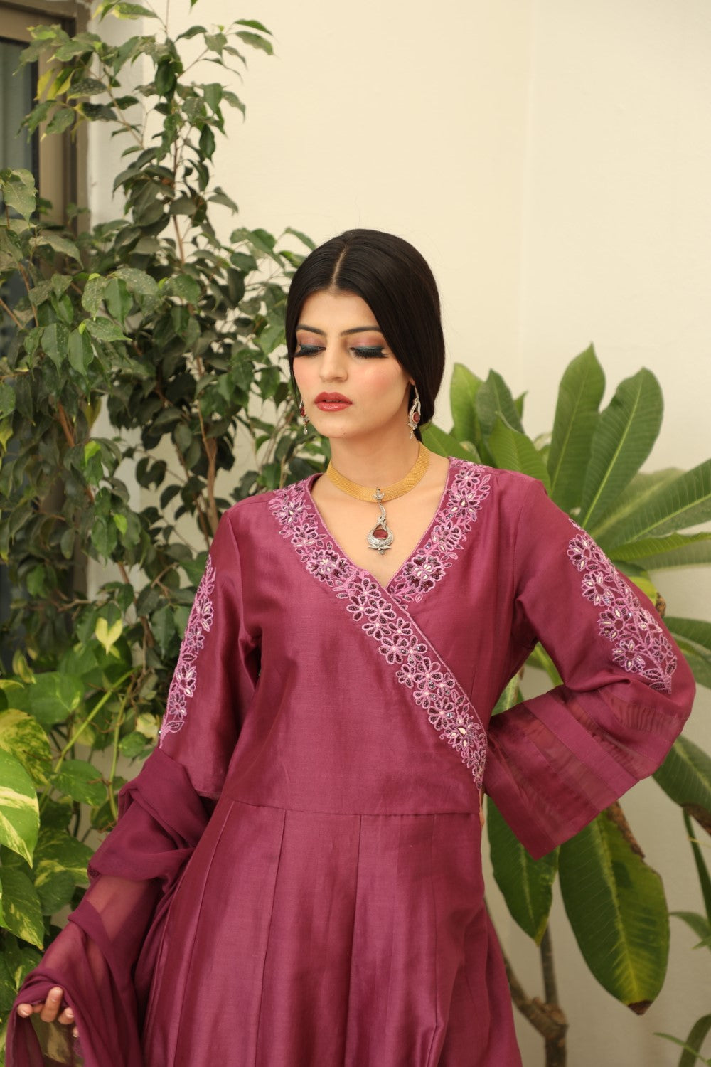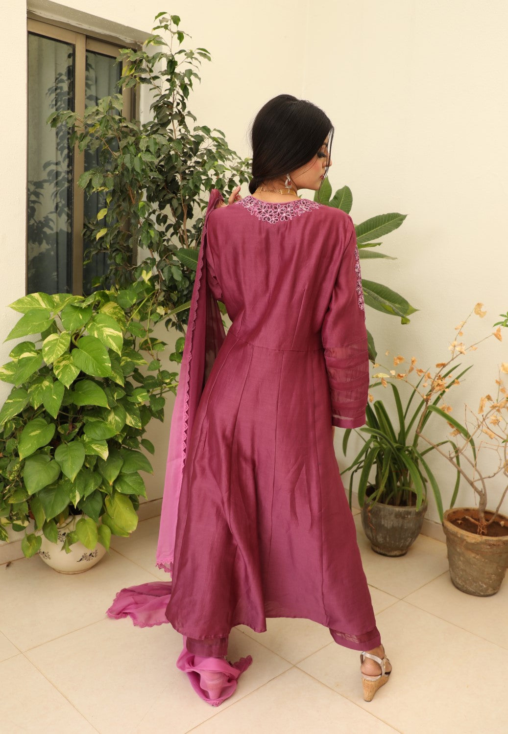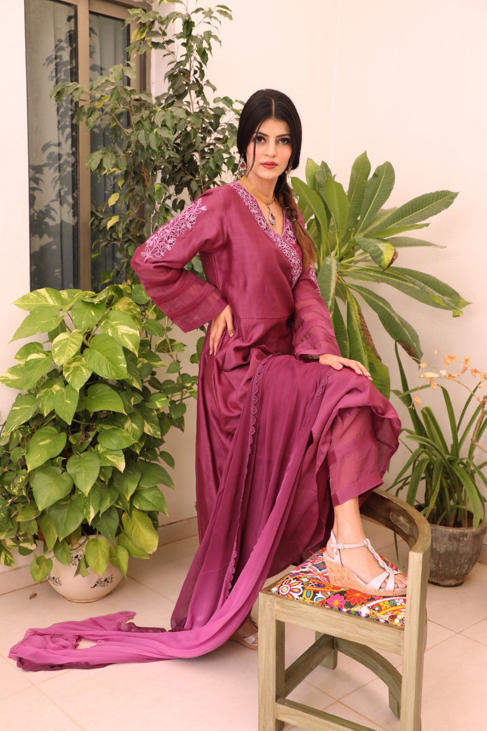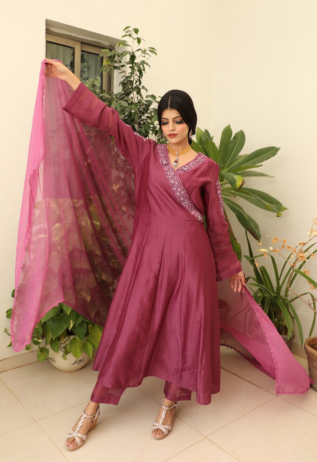 Celebrate timeless elegance with Mehr, a regal Anarkali crafted in handloom Chanderi silk. This 12-paneled beauty features an intricately embroidered overlapping neckline, accentuated with delicate sequins and beadwork. The full sleeves are adorned with alternating bands of sheer organza and Chanderi, adding a modern touch to the classic silhouette. Paired with tailored Chanderi silk trousers and an ombré-dyed chiffon dupatta, this ensemble is lined with soft cotton mulmul for unmatched comfort.