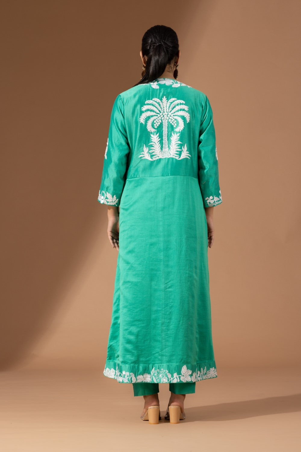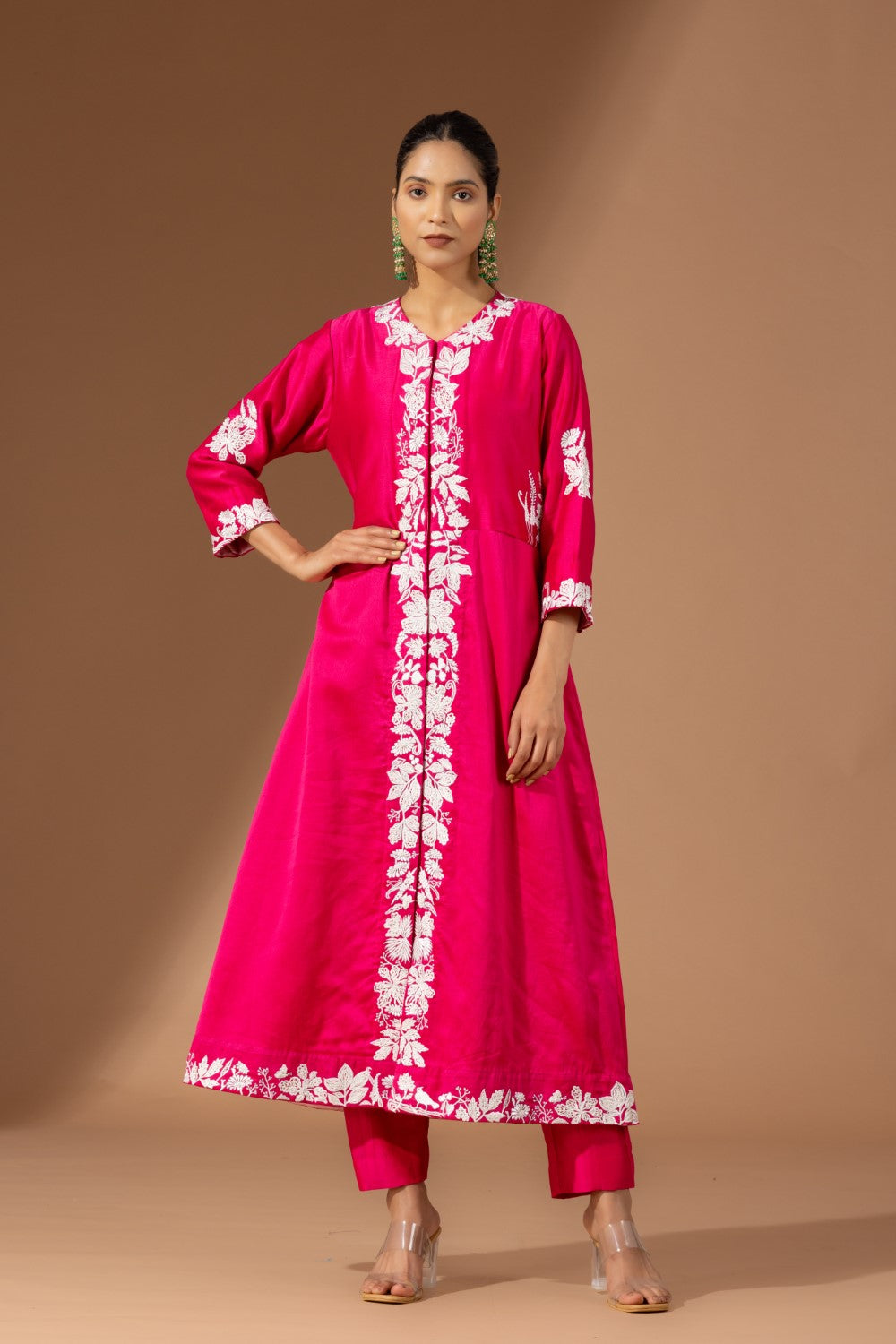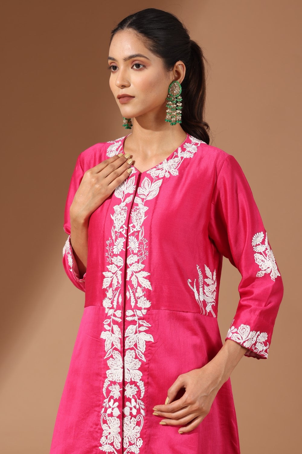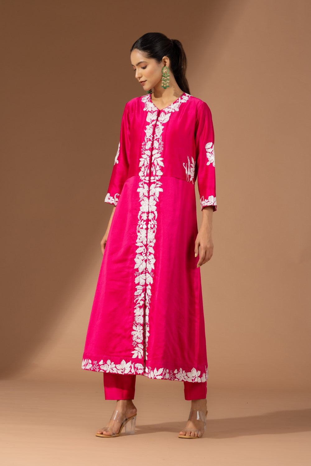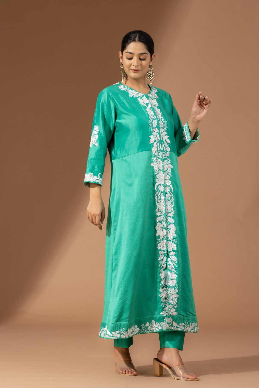 Exude timeless grace in our Floral Cascade Tunic Set, crafted in luxurious handloom Chanderi silk. The long A-line tunic is beautifully accentuated with intricate backstitch and aari embroidery, forming a cascading floral pattern that adds depth and elegance. Satin facing enhances the fine finish, while the relaxed yet structured silhouette makes it a versatile choice for both festive and formal occasions. Paired with tailored Chanderi silk trousers, this set brings together craftsmanship, comfort, and sophistication in perfect harmony.