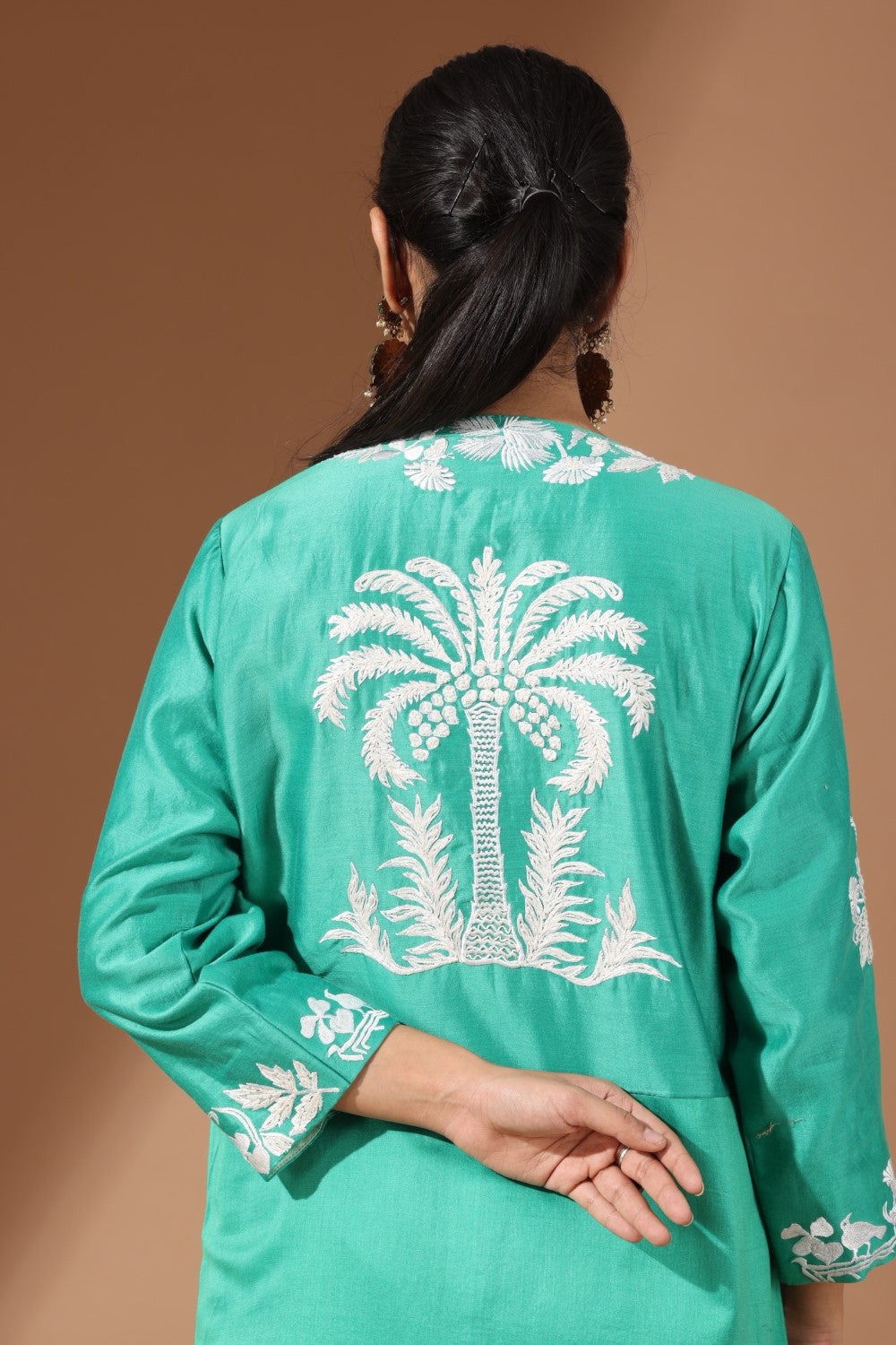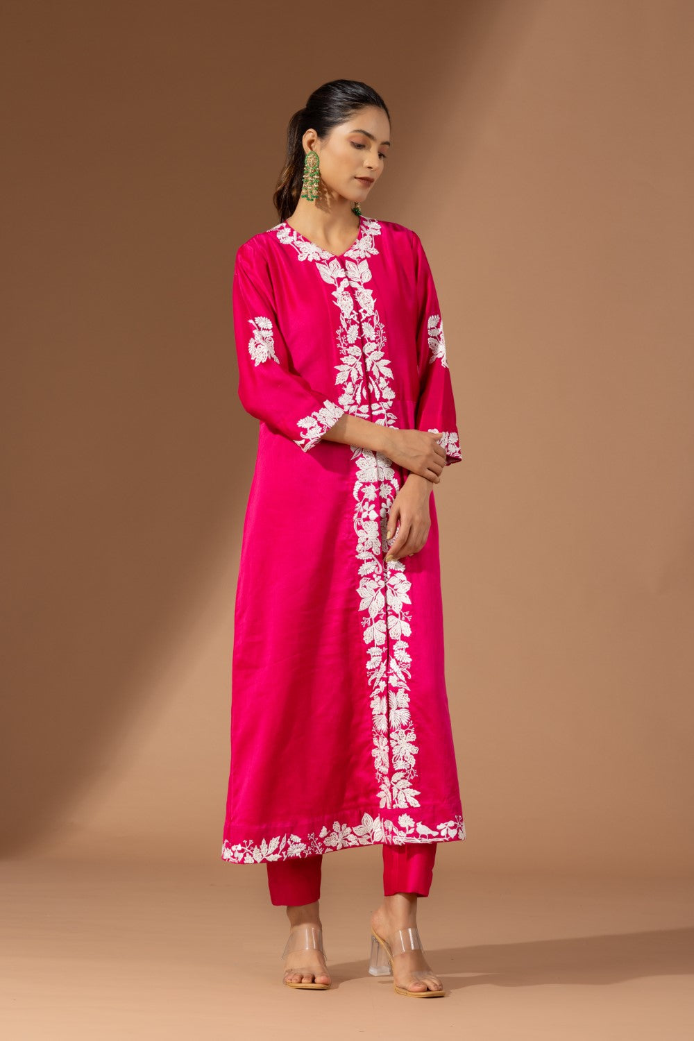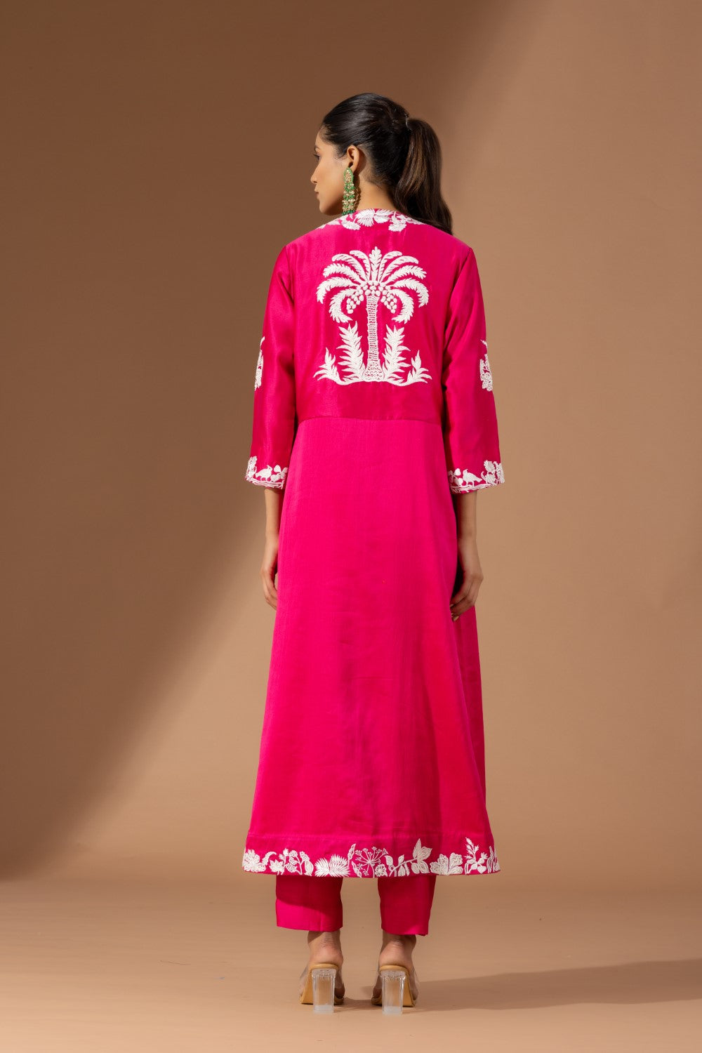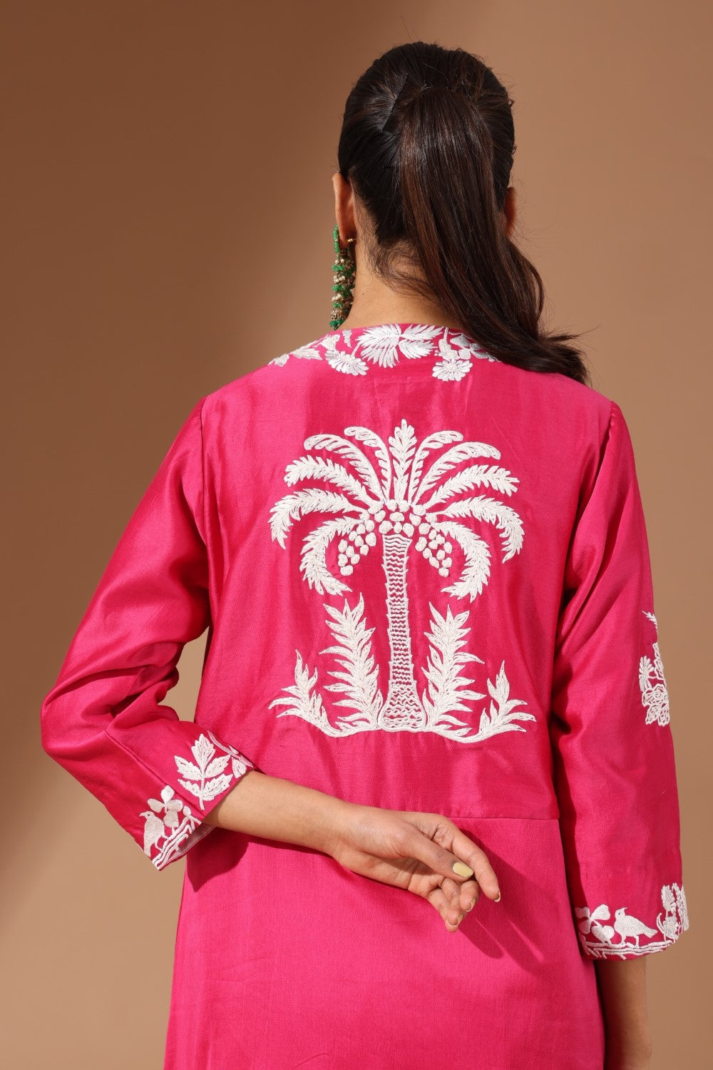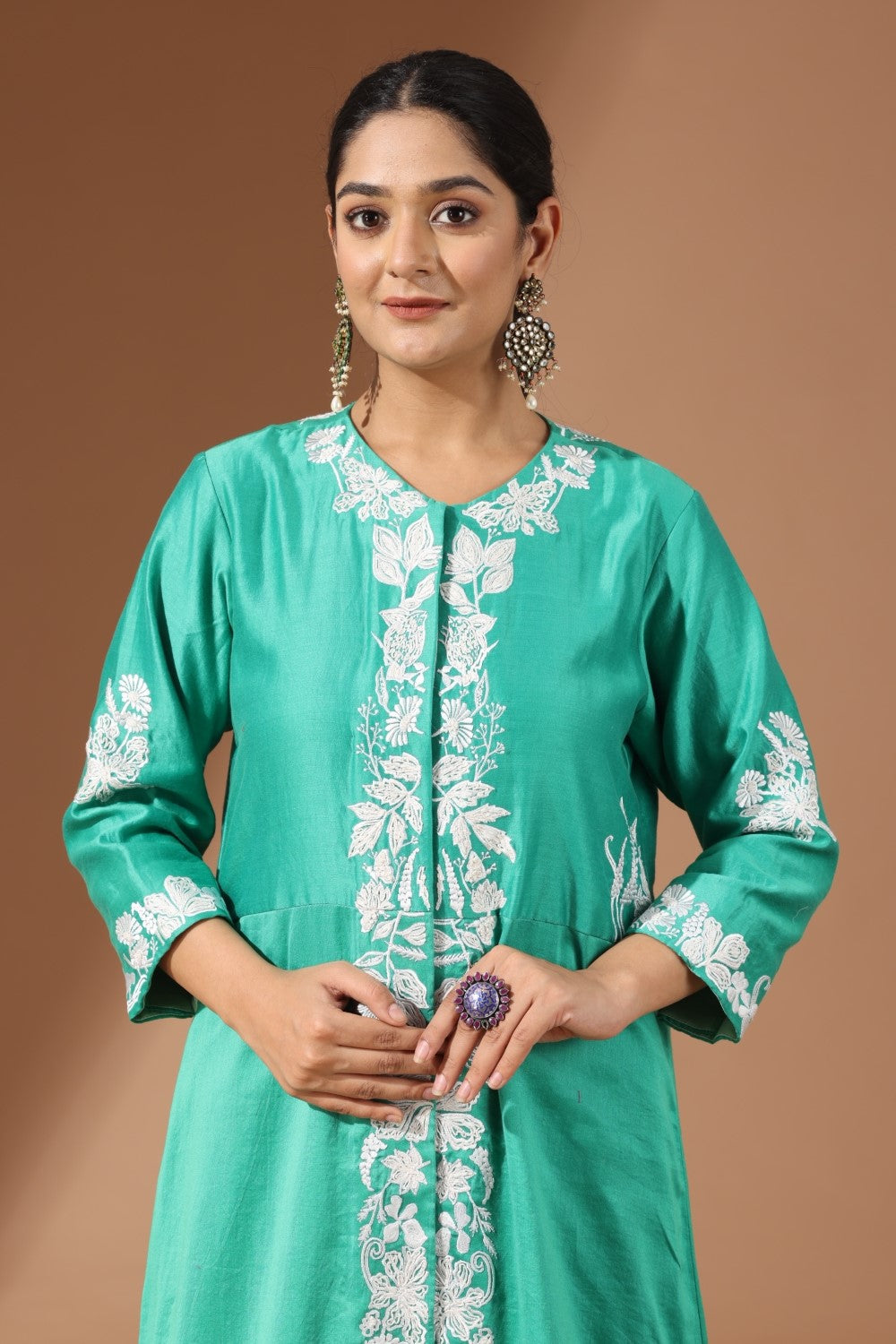 Exude timeless grace in our Floral Cascade Tunic Set, crafted in luxurious handloom Chanderi silk. The long A-line tunic is beautifully accentuated with intricate backstitch and aari embroidery, forming a cascading floral pattern that adds depth and elegance. Satin facing enhances the fine finish, while the relaxed yet structured silhouette makes it a versatile choice for both festive and formal occasions. Paired with tailored Chanderi silk trousers, this set brings together craftsmanship, comfort, and sophistication in perfect harmony.