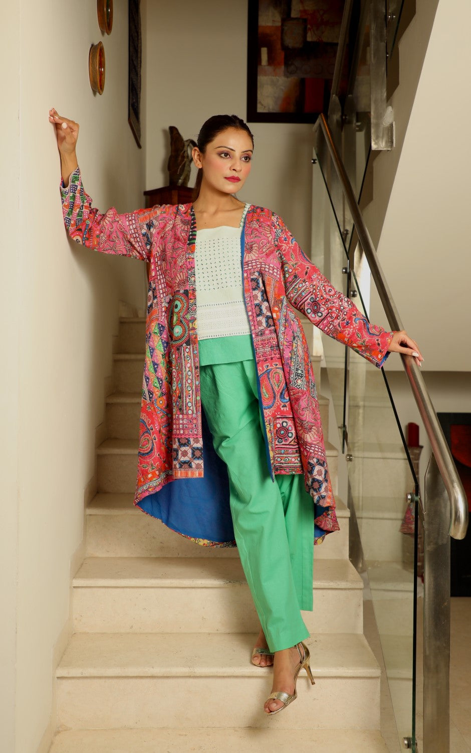 The Aquamarine Hakooba top paired with cotton linen trousers seamlessly combines fashion and comfort, making it the perfect choice for a day out with friends or a relaxed day at home. For an added touch of style, consider pairing it with our Fuchsite cape.