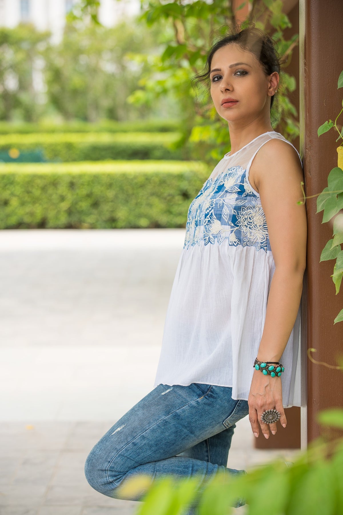 Yoke in Organza and blue gingham patterned cotton accentuated with intricate embroidery. Round neck with back button closure, finished with white banding.