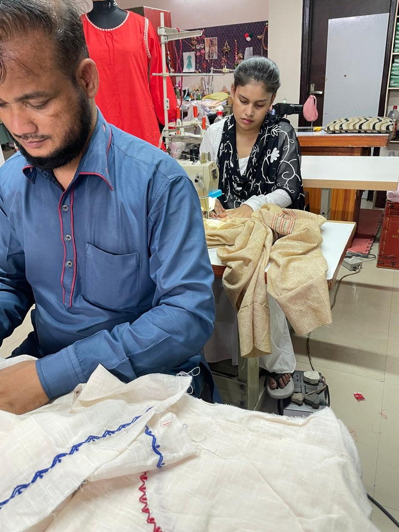 In our vibrant and spacious studio, a team of adept artisans and master craftsmen work diligently to handcraft your exclusive garments in a happy and equitable atmosphere.